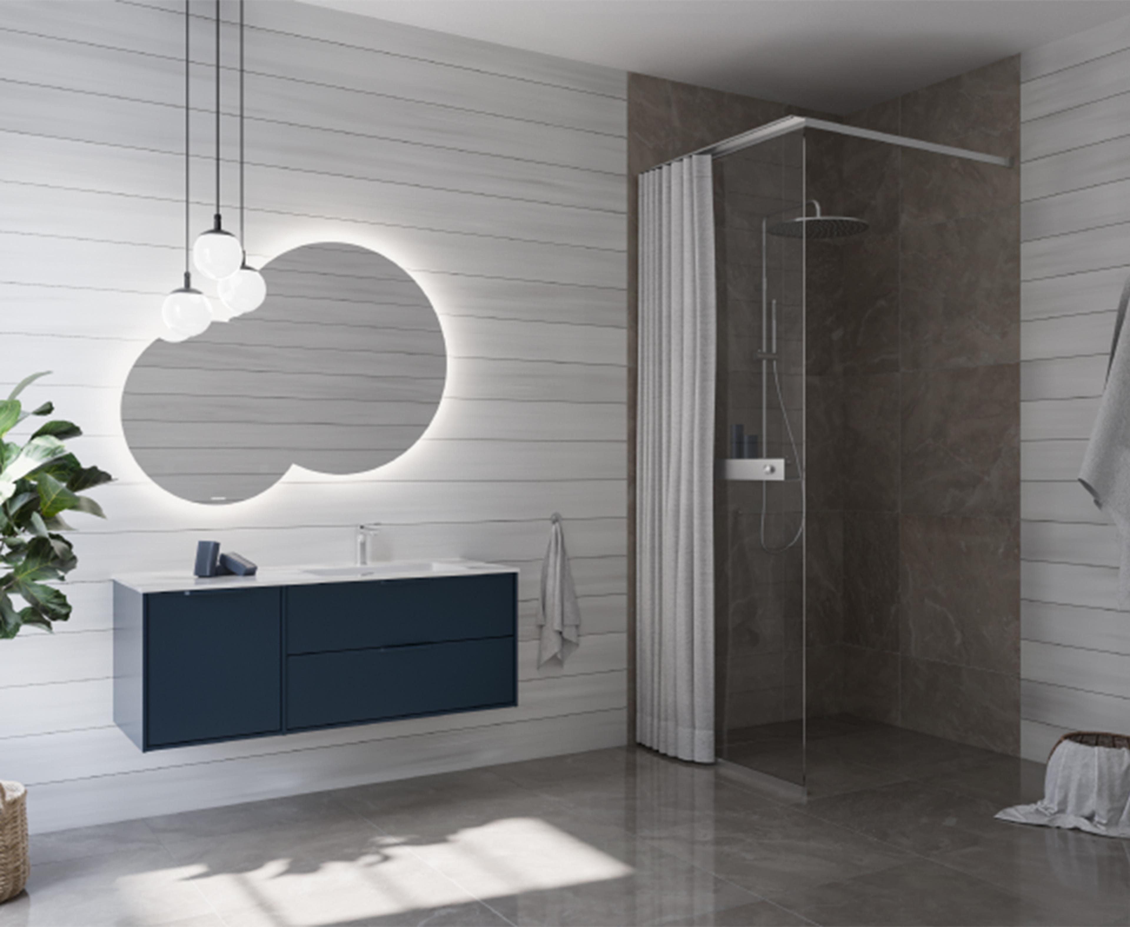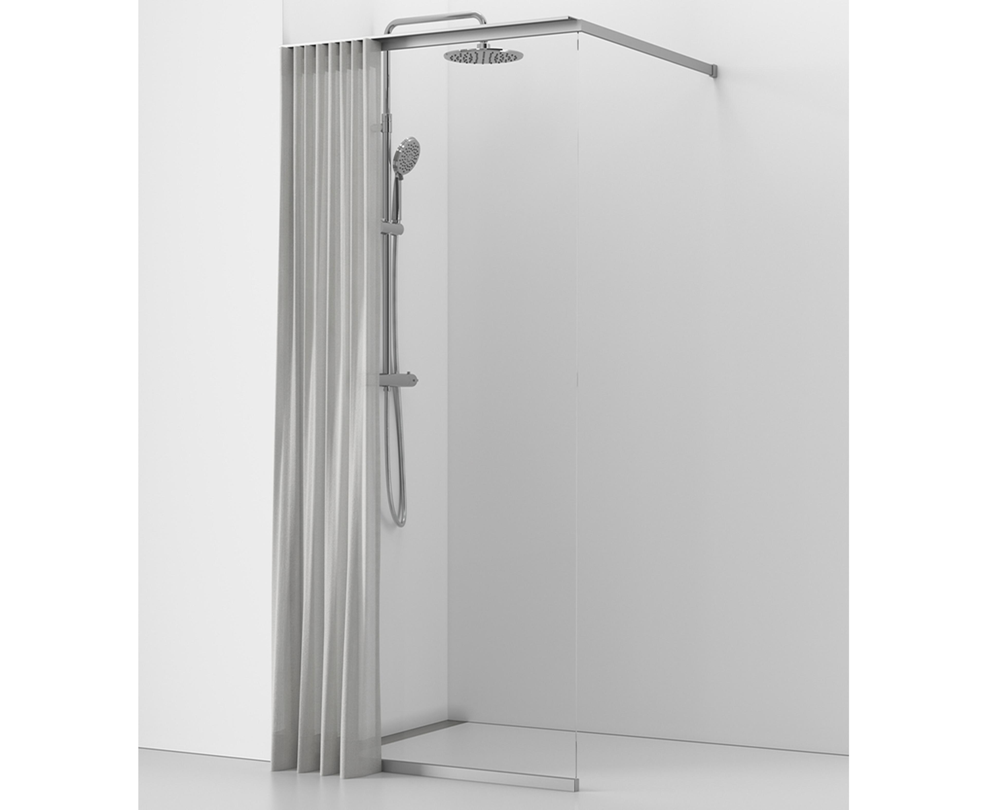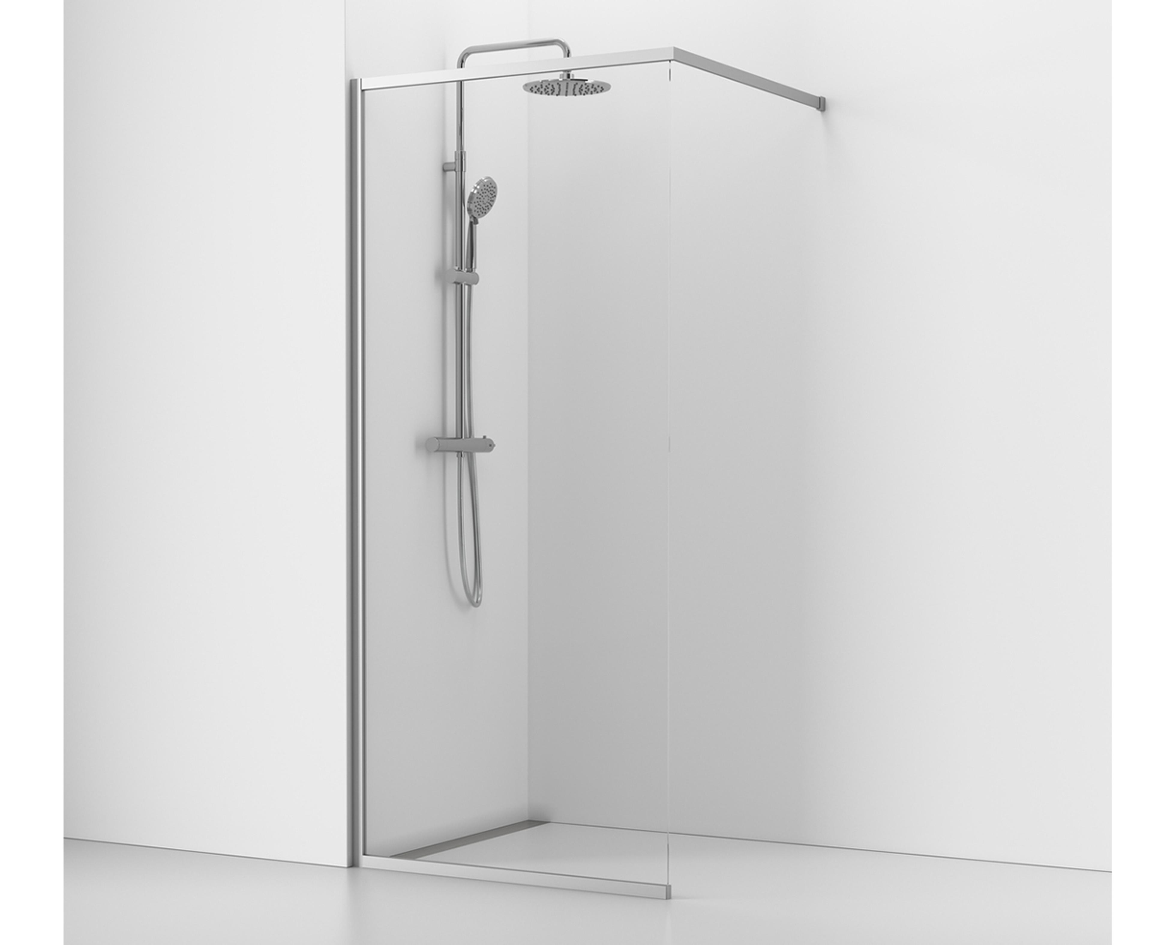 Langfoss skjermvegg fast 90 i krystallglass med elokserte profiler i matt aluminium. Leveres komplett med draperingsstang (max 105 cm), vegg- og gulvprofil. Herdet sikkerhetsglass 6 mm. B: 90 H: 200
