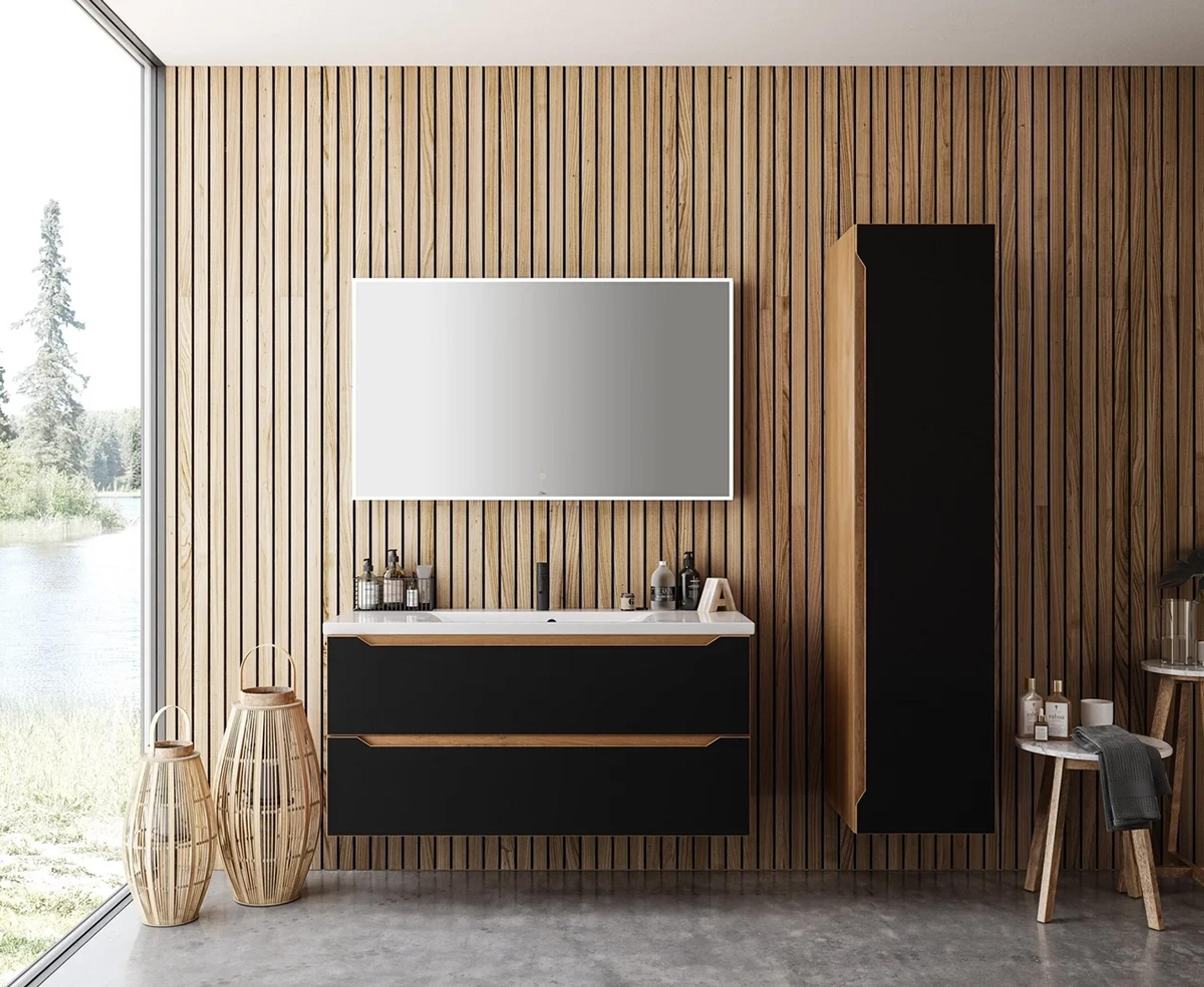 Baderomsmøbel i sort som inkluderer servantskapet (120x60,5x46 cm) med to skuffer og integrerte eikehåndtak. Heine porselensservant i hvit og Vange speil (120x70x5 cm) med hvit ramme og dimmeknapp. Pris uten blandebatteri. Mål B x H x D: 120x60,5x46 cm
