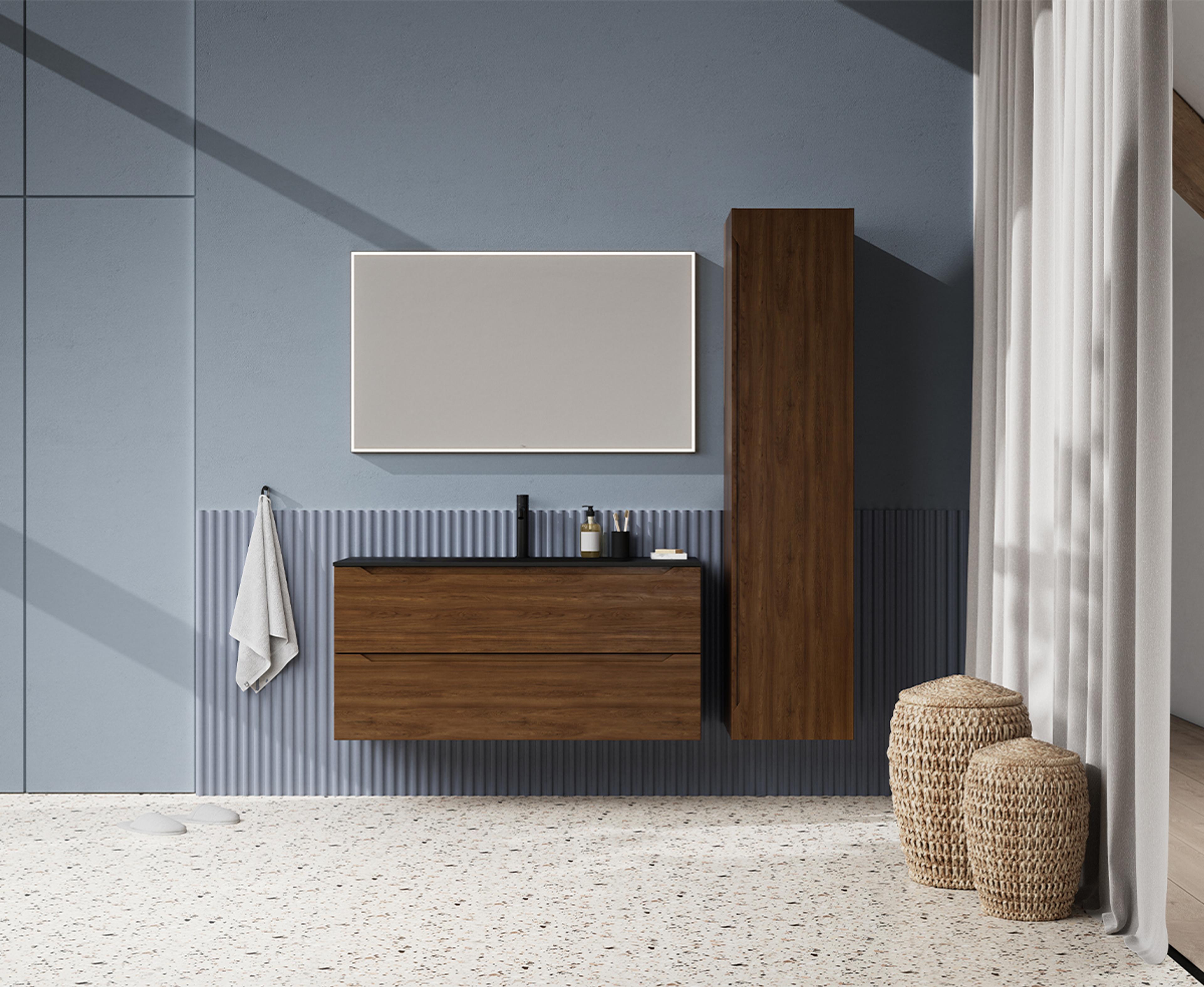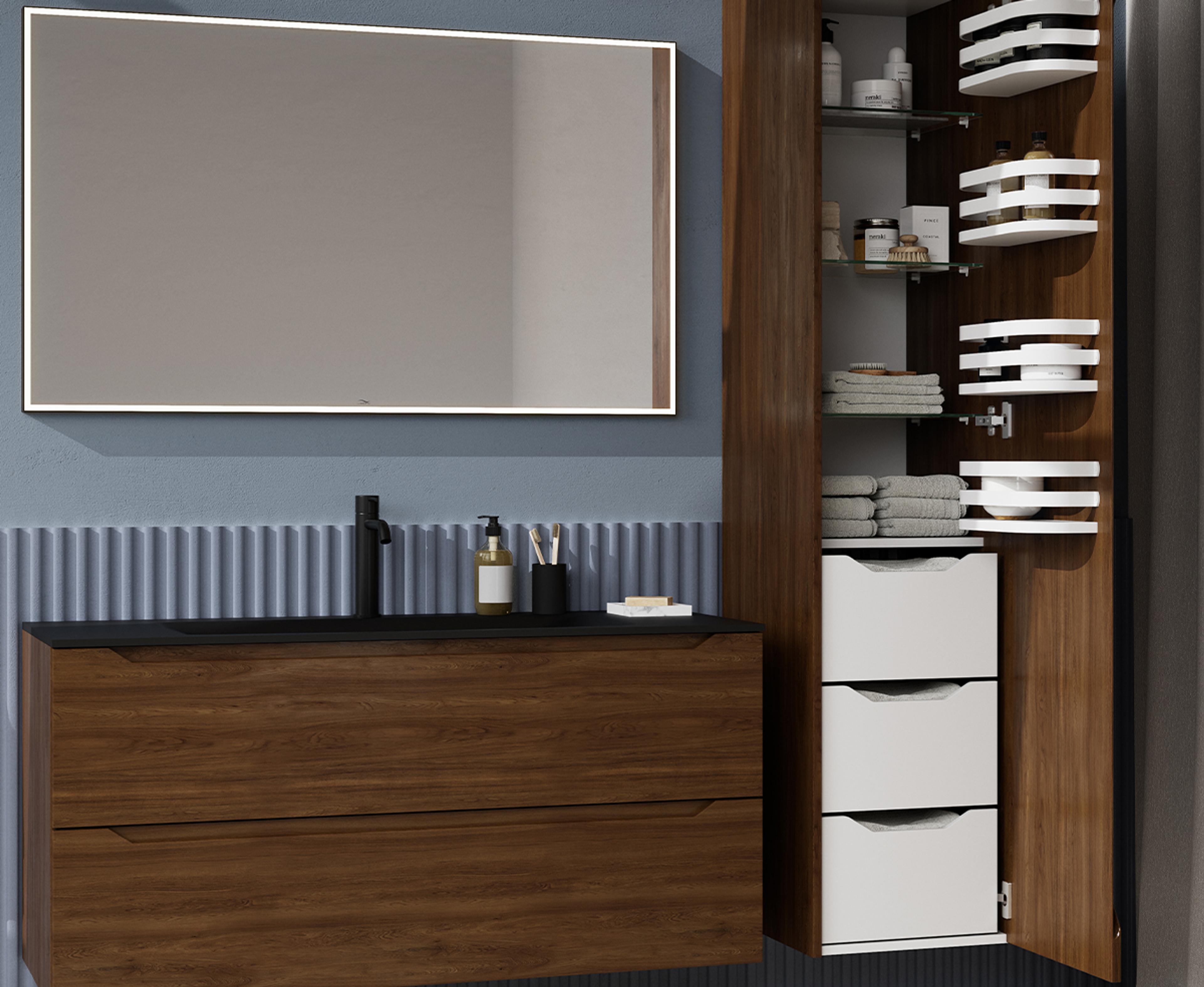 Baderomsmøbel i mørk eik som inkluderer servantskapet (120x57x45,7 cm) med to skuffer og integrerte grep. VALE glasservant (120x1,2x46 cm) i sort matt og FRAMFJORD speil (120x65x2,5 cm) med frostet ramme og berøringspanel. Pris uten servantkran og høyskap.