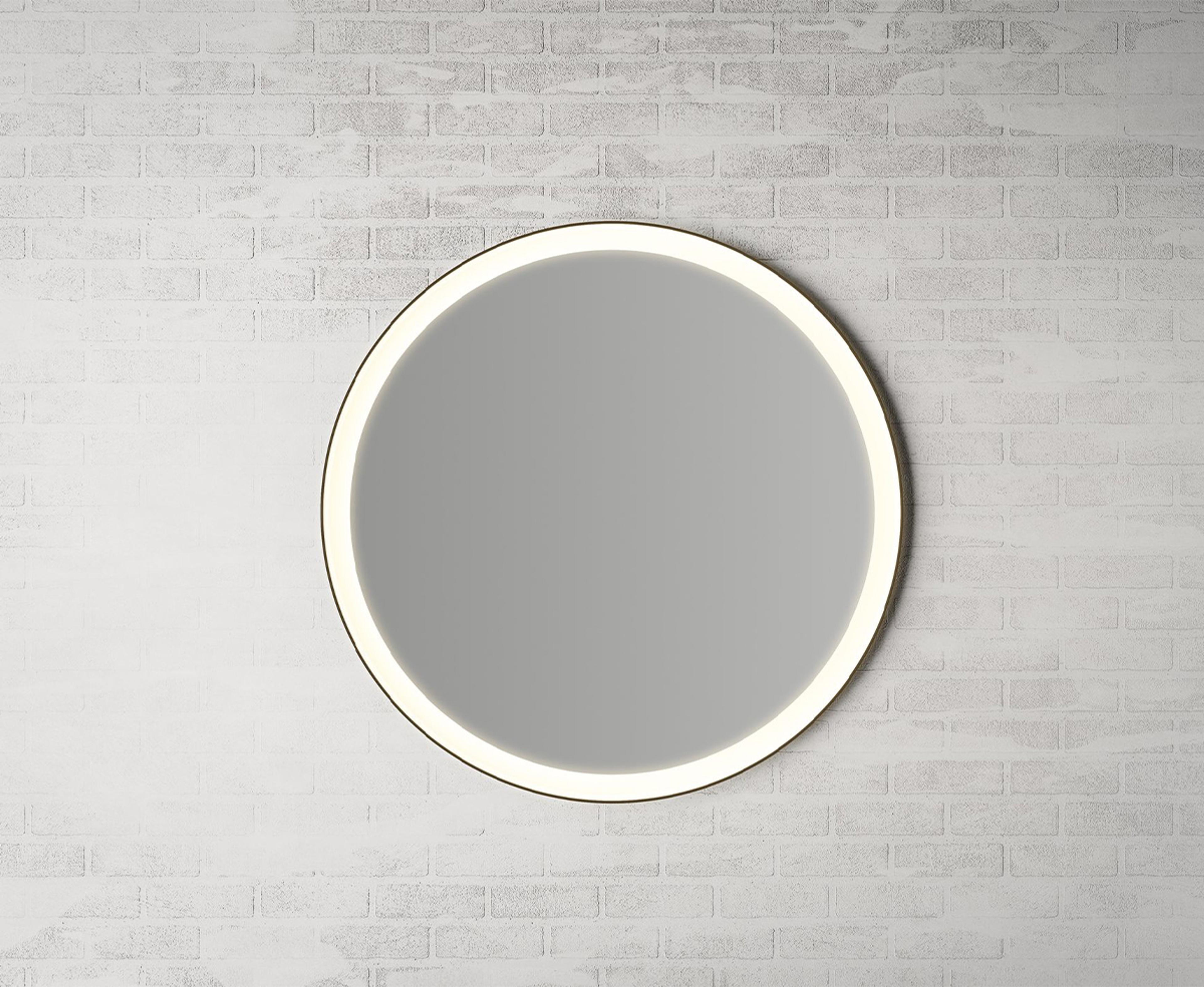 Baderomsmøbel i Sort Matt som inkluderer servantskapet (80x57x35 cm) med to skuffer og innfelte håndtak. FREYA SMAL porselensservant (81x1,5x36,5 cm) og STEIM rundt speil (Ø80 cm) med lysramme. Pris uten servantkran og sideskap.