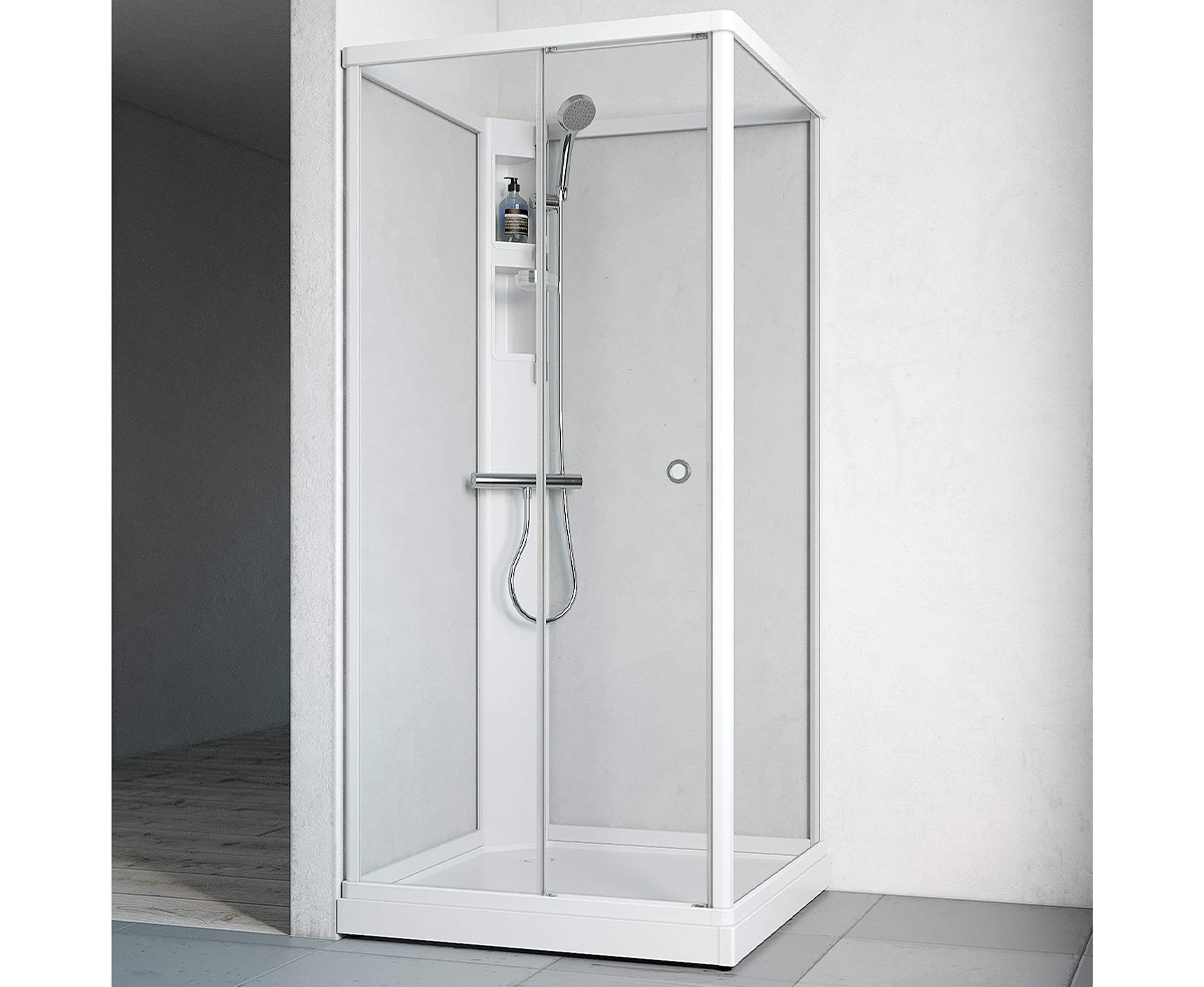 Flow Front Kabinett har et moderne uttrykk med slanke profiler i matt aluminium, klarglass, støpemarmorkar og skjult avløp. Enkel å montere med minimalt med skruer da mange av delene har klemfunksjon. Servicehylle for utenpåliggende blandebatteri. Dusjsett Nifty inngår. Mål: 91x91 cm.