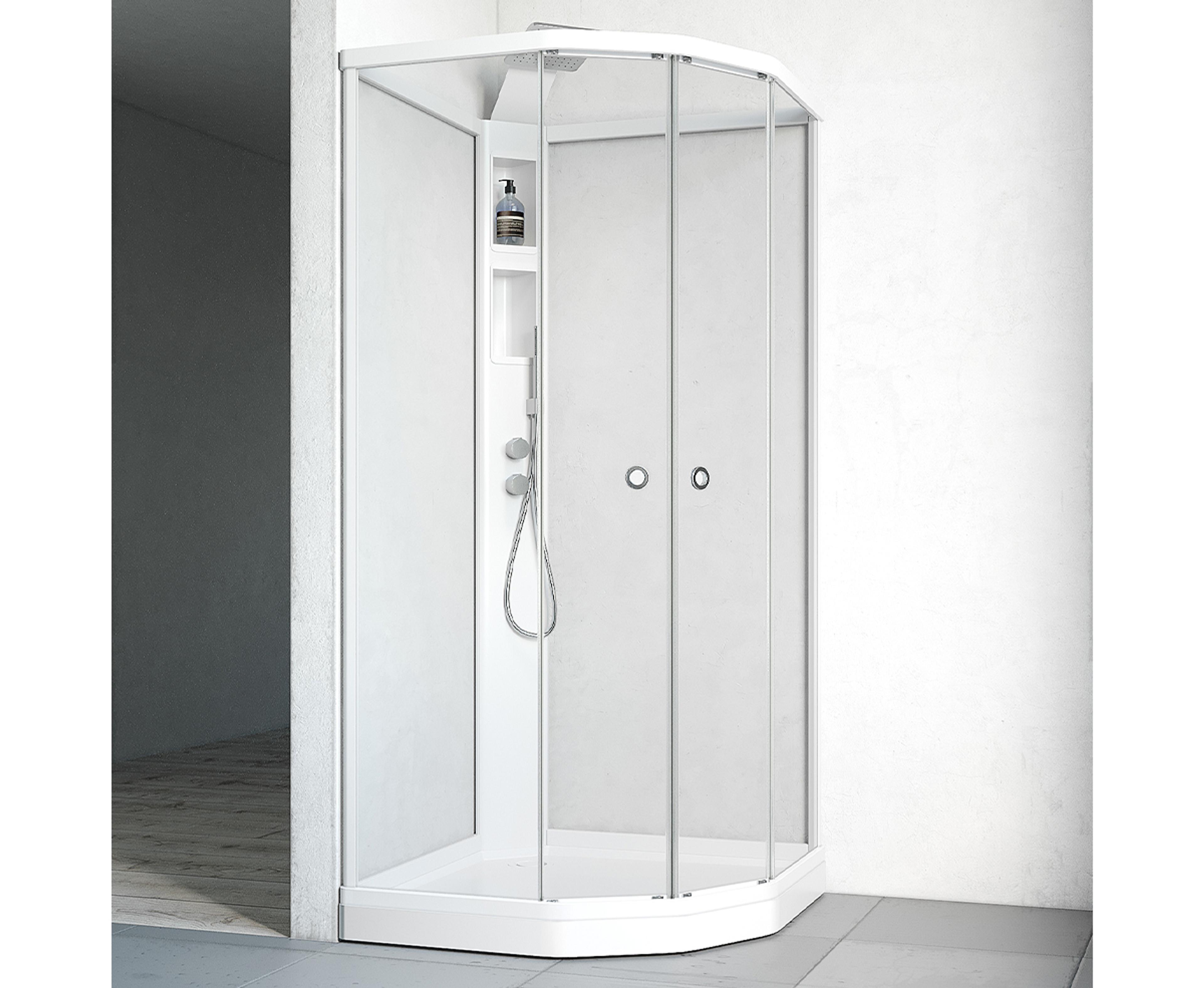 Flow Semi Kabinett har et moderne uttrykk med slanke profiler i hvit, klarglass, støpemarmorkar og skjult avløp. Enkel å montere med minimalt med skruer da mange av delene har klemfunksjon. Servicehylle med innebygd blandebatteri, oppbevaringshyller og takdusj. Mål: 81x81x215 cm