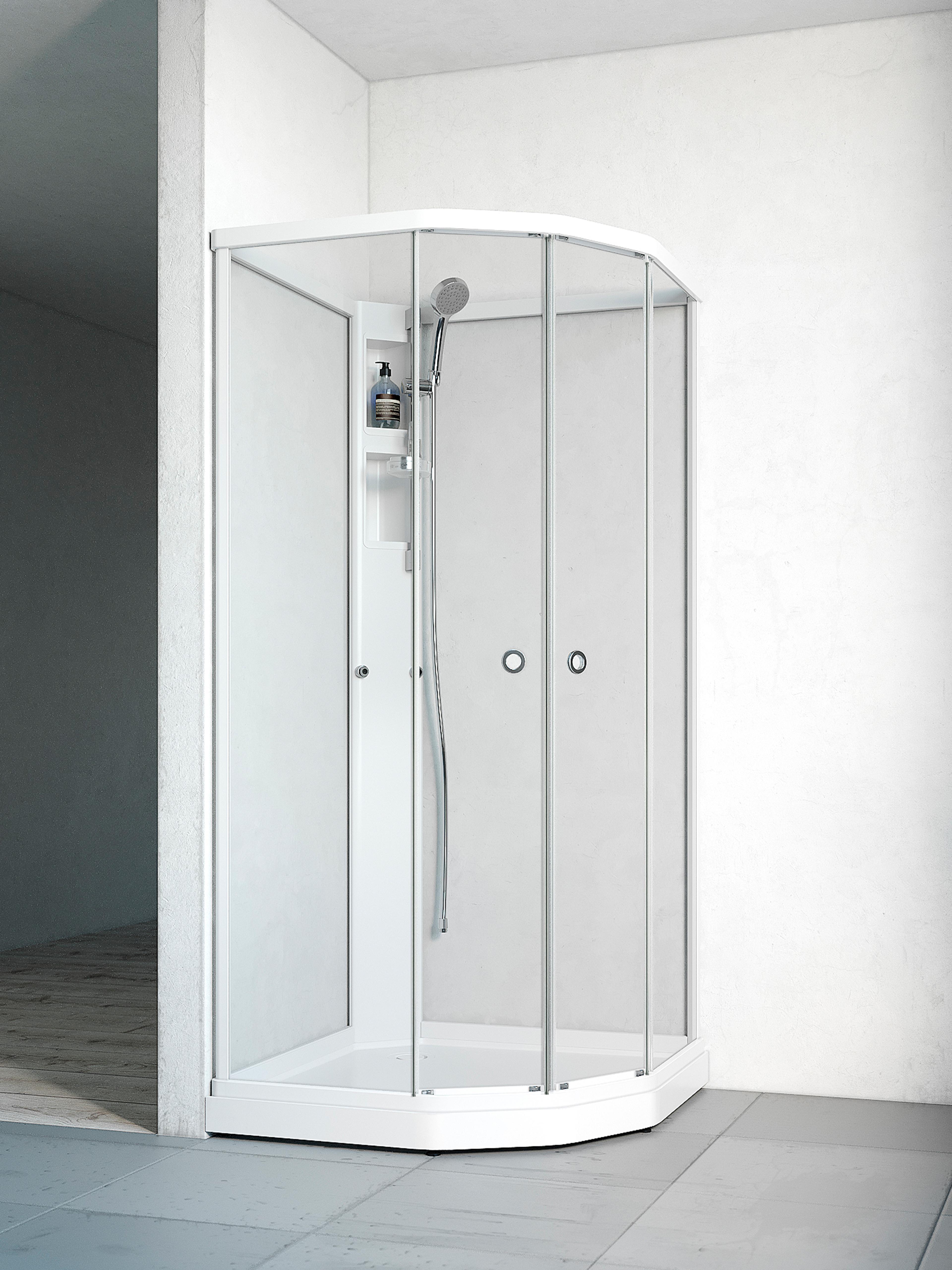 Dusjkabinett med hvite profiler og klart glass med hvit bakvegg. Inkludert dusjsett. Pris uten blandebatteri. Mål: 91x91x198 cm.