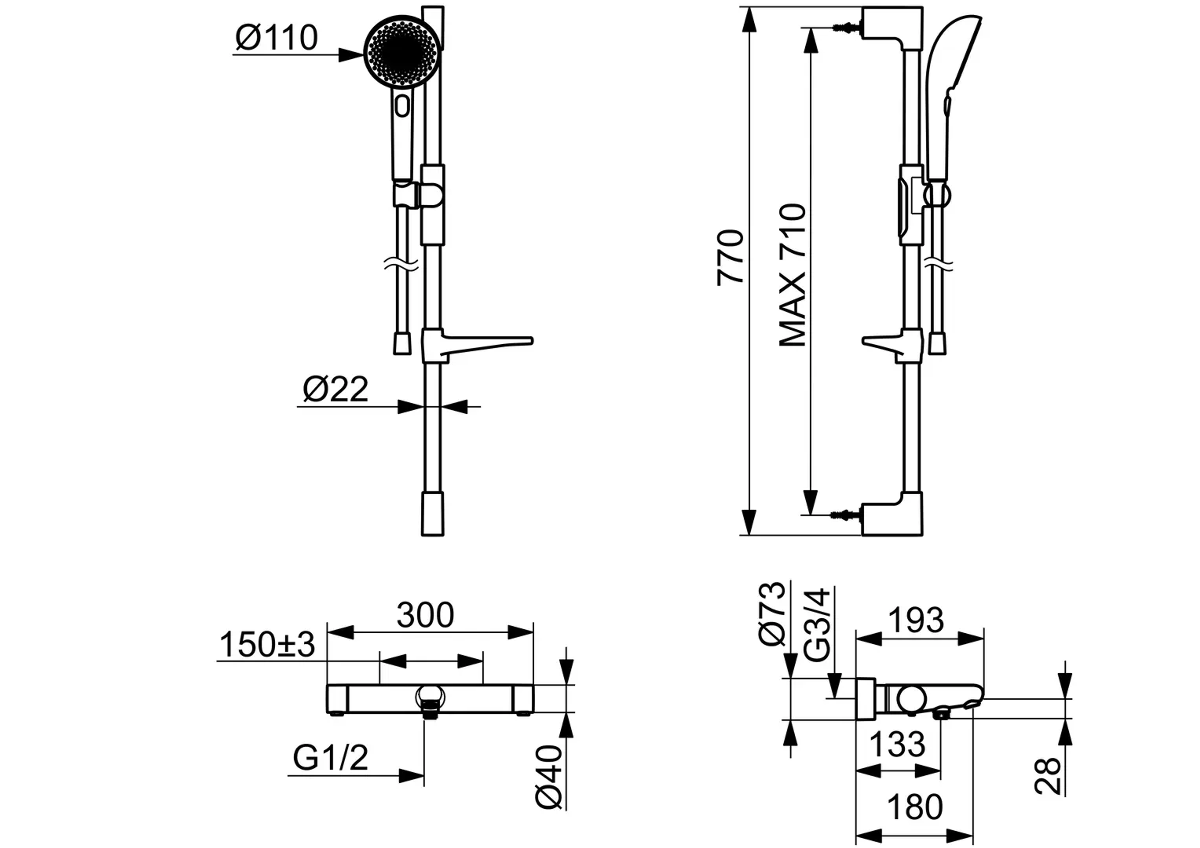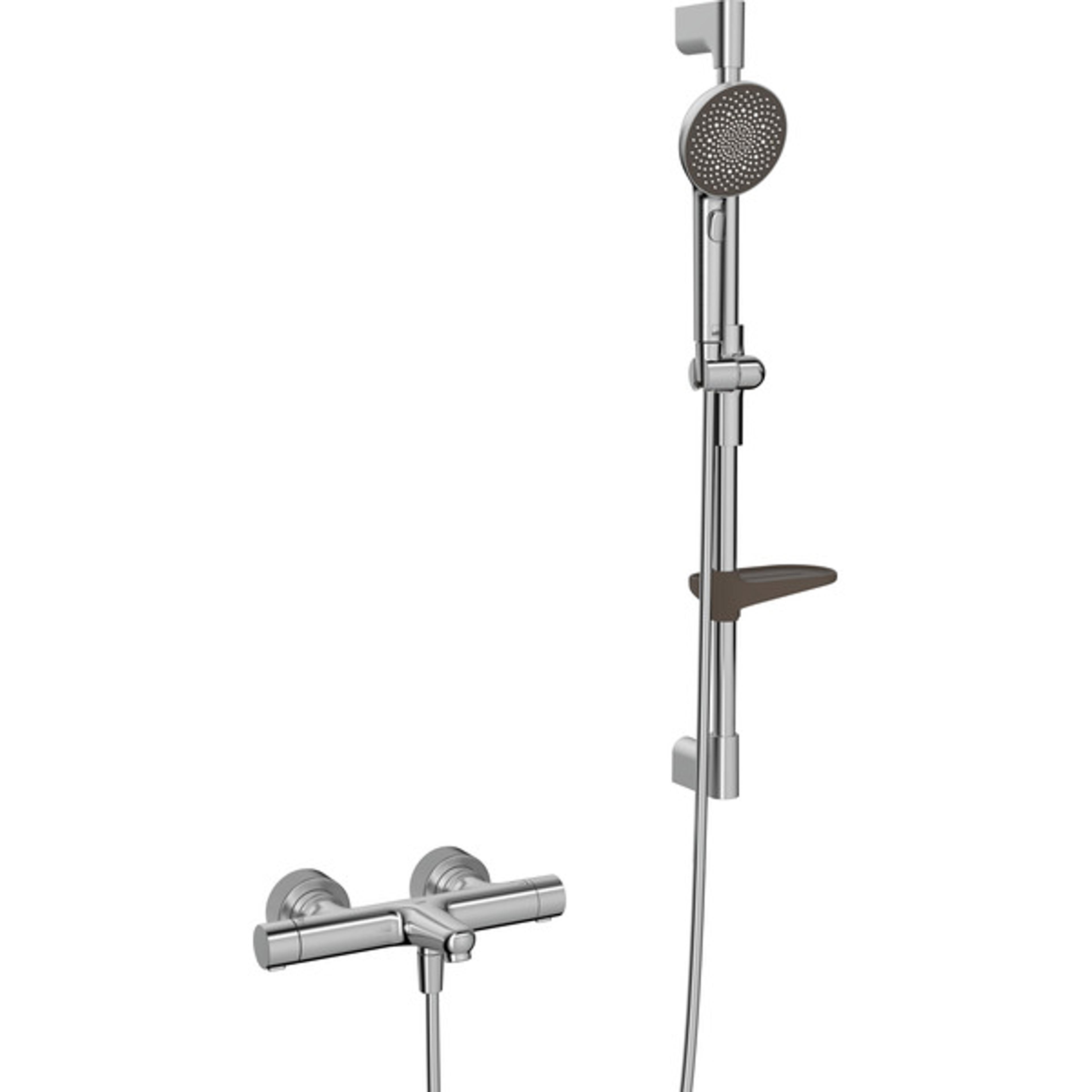 Oras Aurelia. Enkelhet og eleganse i harmoni. En elegant sylindrisk termostat med badekartut. Aurelia henter designinspirasjon fra elementer i naturen. Badekar- og dusjkran med dusjsett i børstet stål 110mm - tre stråletyper hånddusj trykknapp for enkelt valg av stråletype dusjholder som er lett å justere