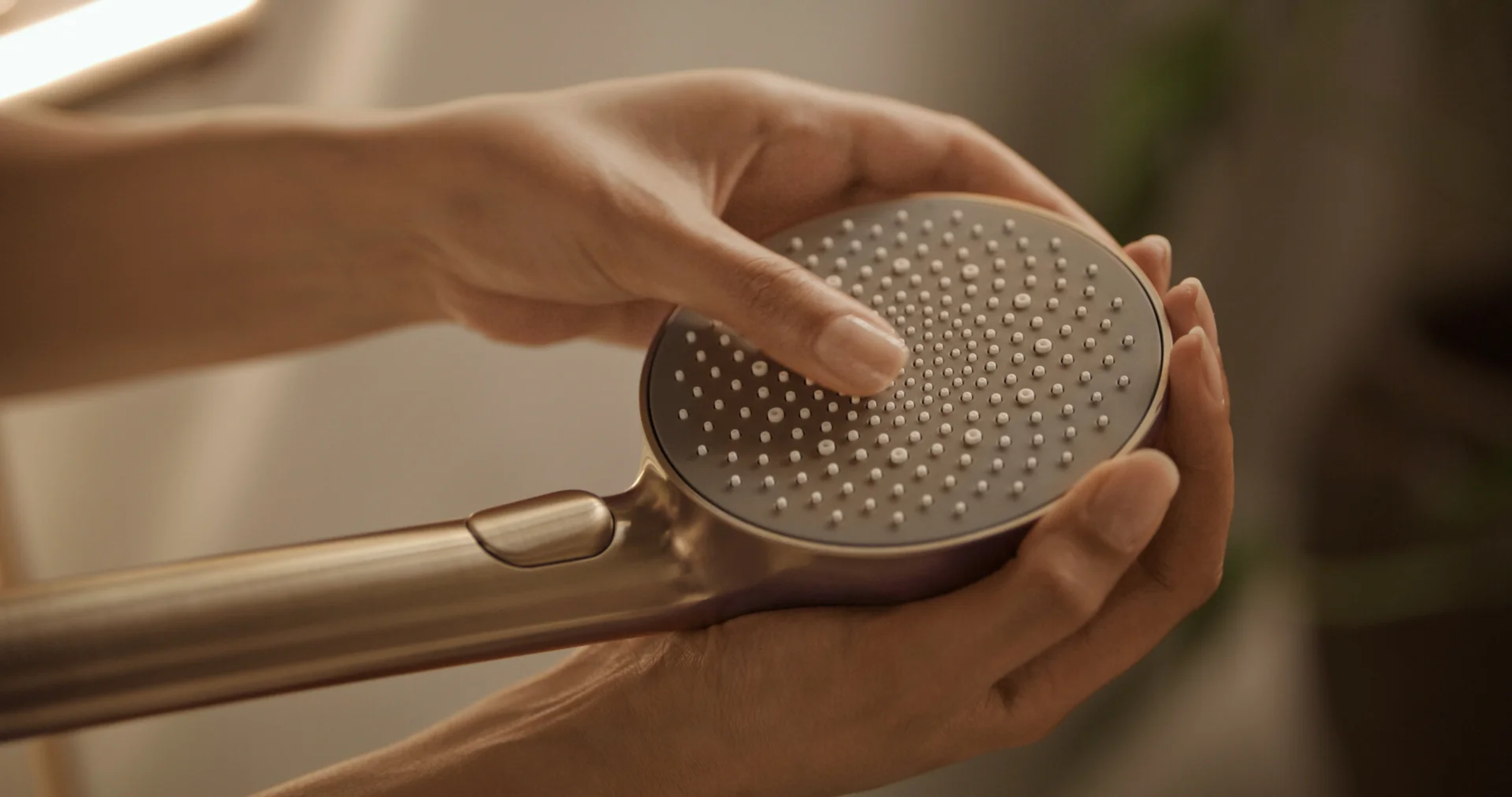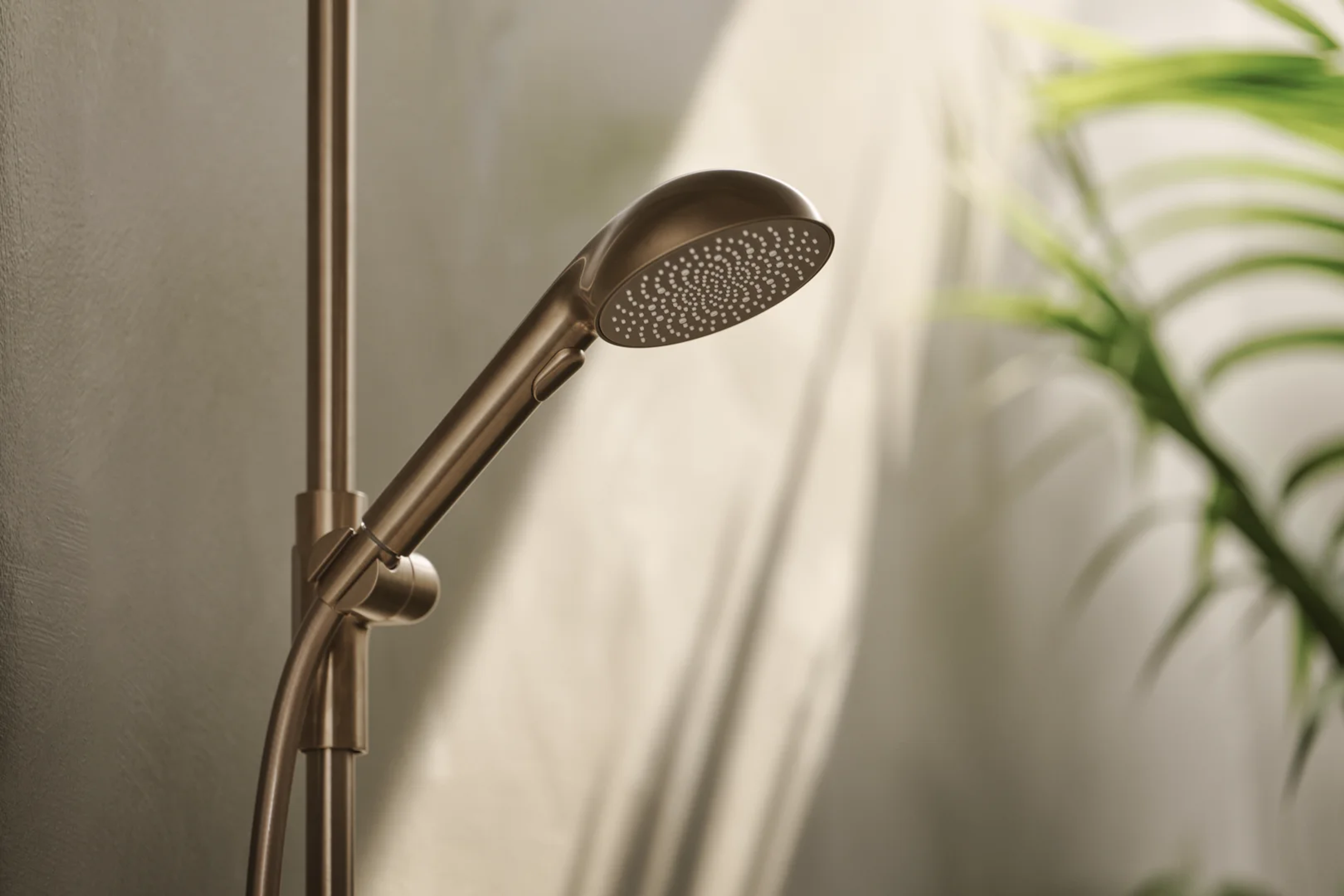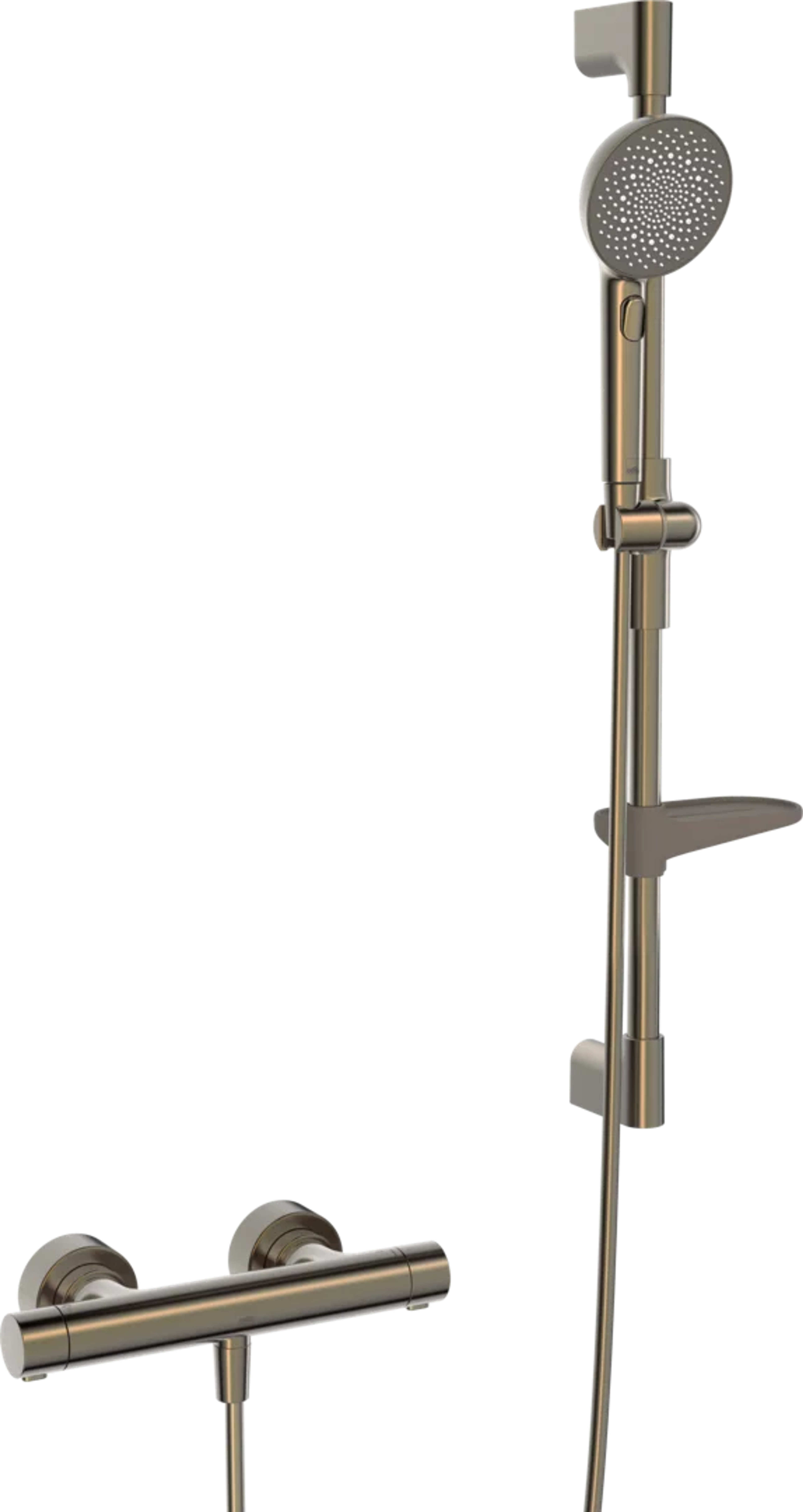 Enkelhet og eleganse i harmoni. En elegant sylindrisk termostat. Juster vanntrykk og temperatur raskt og enkelt, for den perfekte dusjopplevelsen. Aurelia henter designinspirasjon fra elementer i naturen. Dusjkran og dusjsett i børstet bronse 110 mm - tre stråletyper hånddusj trykknakpp for enkelt valg av stråletype dusjholder som er lett å justere