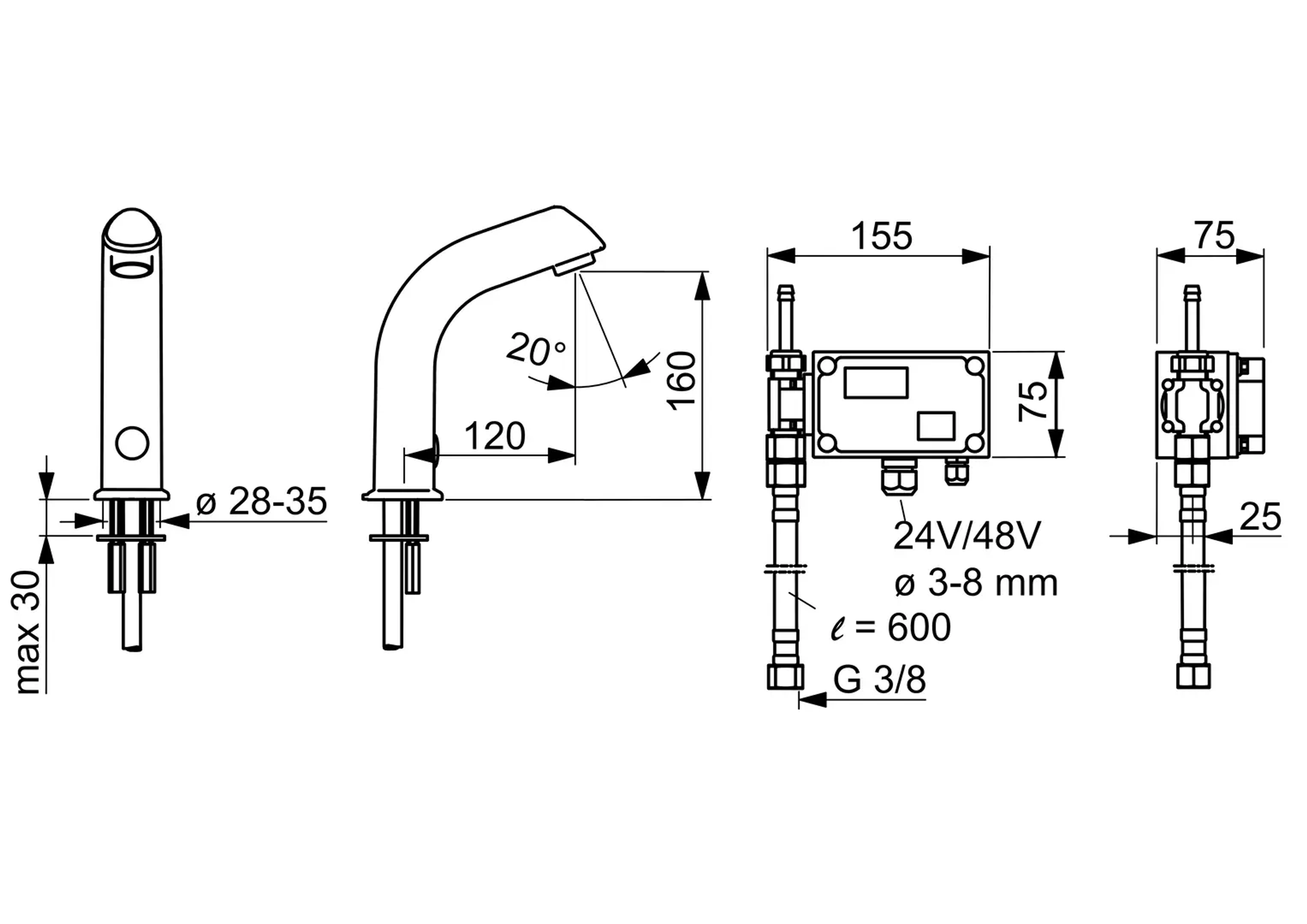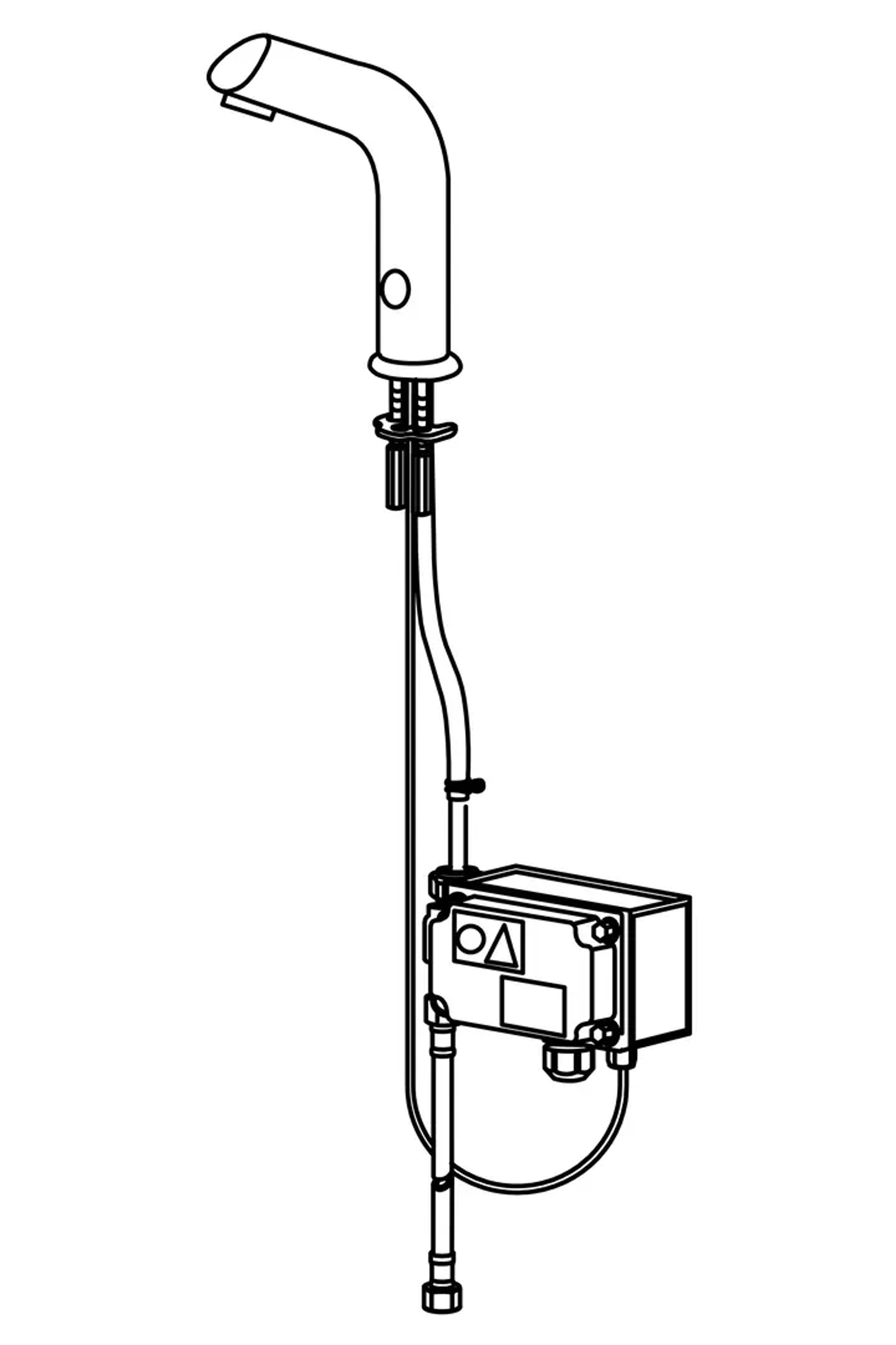 Berøringsfri servantkran for forblandet vann. Kraftig modell i IP klasse 67. Elektrisk tilkobling 24-48V. Etterrenningstid og sensorfølsomhet kan endres ved hjelp av bluetooth og Oras App. 3/8'' tilkobling, tilbakeslagsventil og smussfilter