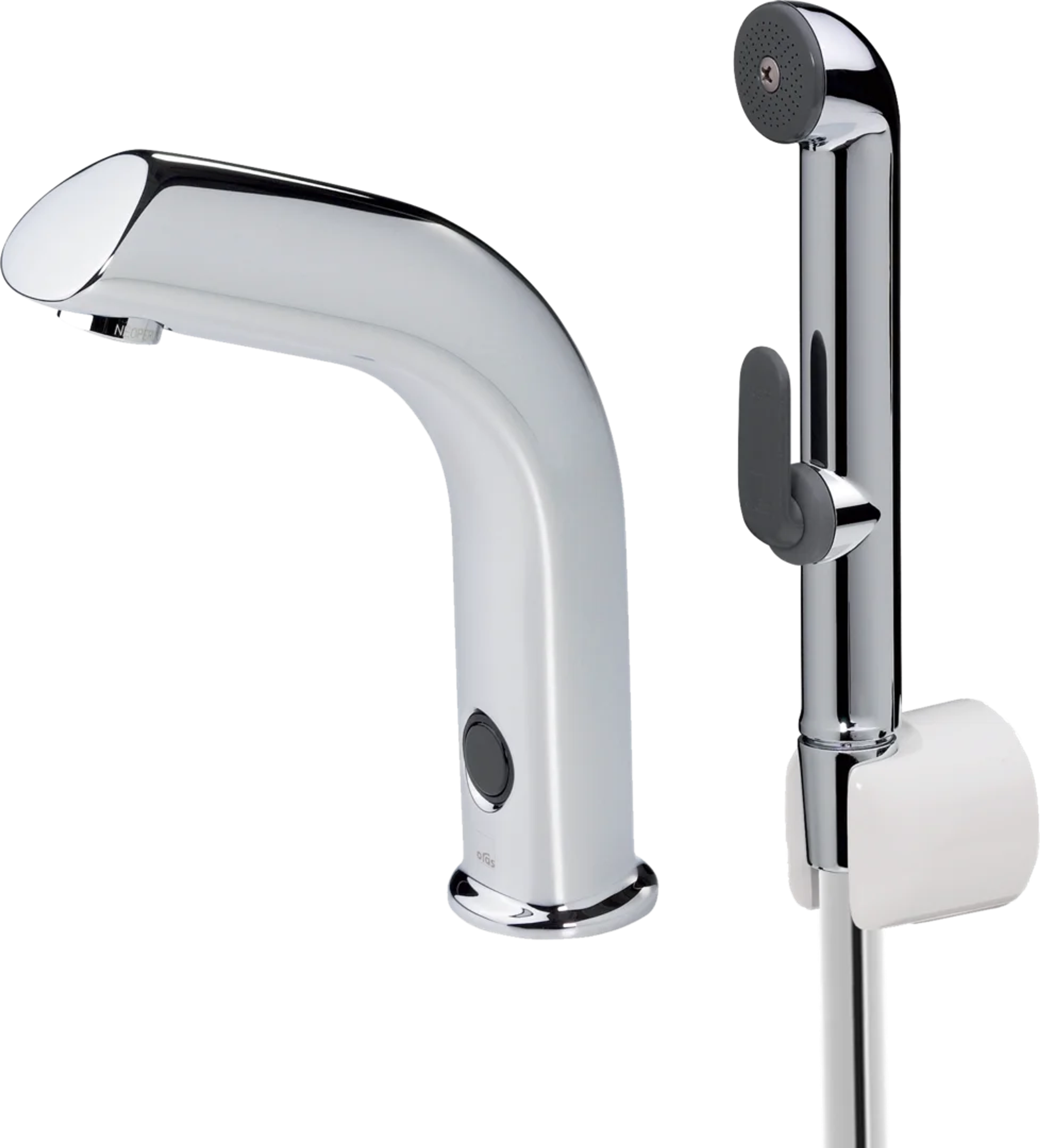 Berøringsfri servantkran med Bidetta hånddusj. Denne modellen er uten Bluetooth tilkobling. Kraftig modell i IP klasse 67. Elektrisk tilkobling 24/48 V. Tilbehør: Omformer Oras nr 290004 24V Omformer med stikkontakt Oras nr 290005 24V 3/8'' tilkobling, tilbakeslagsventil og smussfilter. Bidetta, løft hånddusj ut av holder og vannet vil renne ut av kranen, trykk inn knappen på hånddusj og vannet renner ut av hånddusjen. Vannet renner inntil man setter hånddusj tilbake i holderen