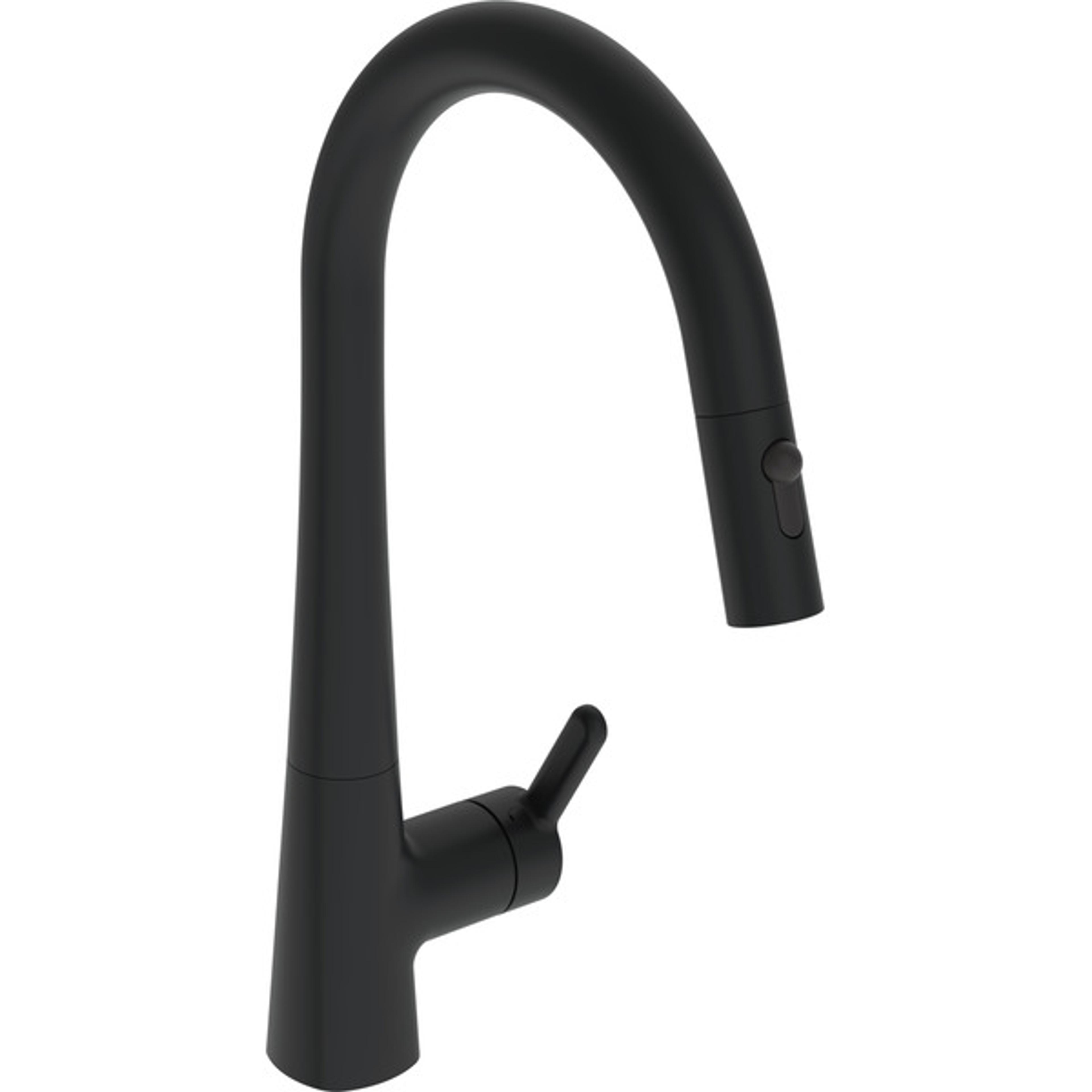 Stilren kjøkkenkran i matt svart for kjøkkenet i dag og for fremtiden. Uttrekkbar tut gjør renhold av oppvaskkum til en enkel sak. Ved bruk har du mulighet til å variere mellom to stråletyper. Mulighet for å sette en fast skoldesperre i hendelen, og en maksimal vannmengde.