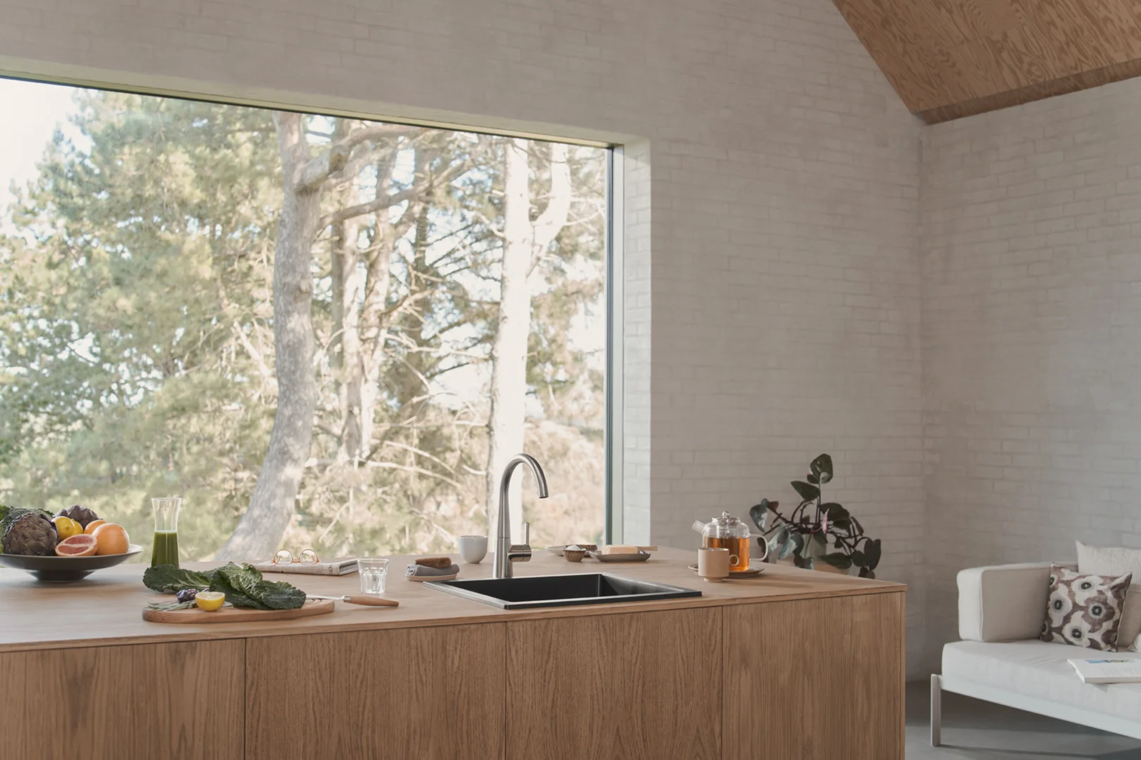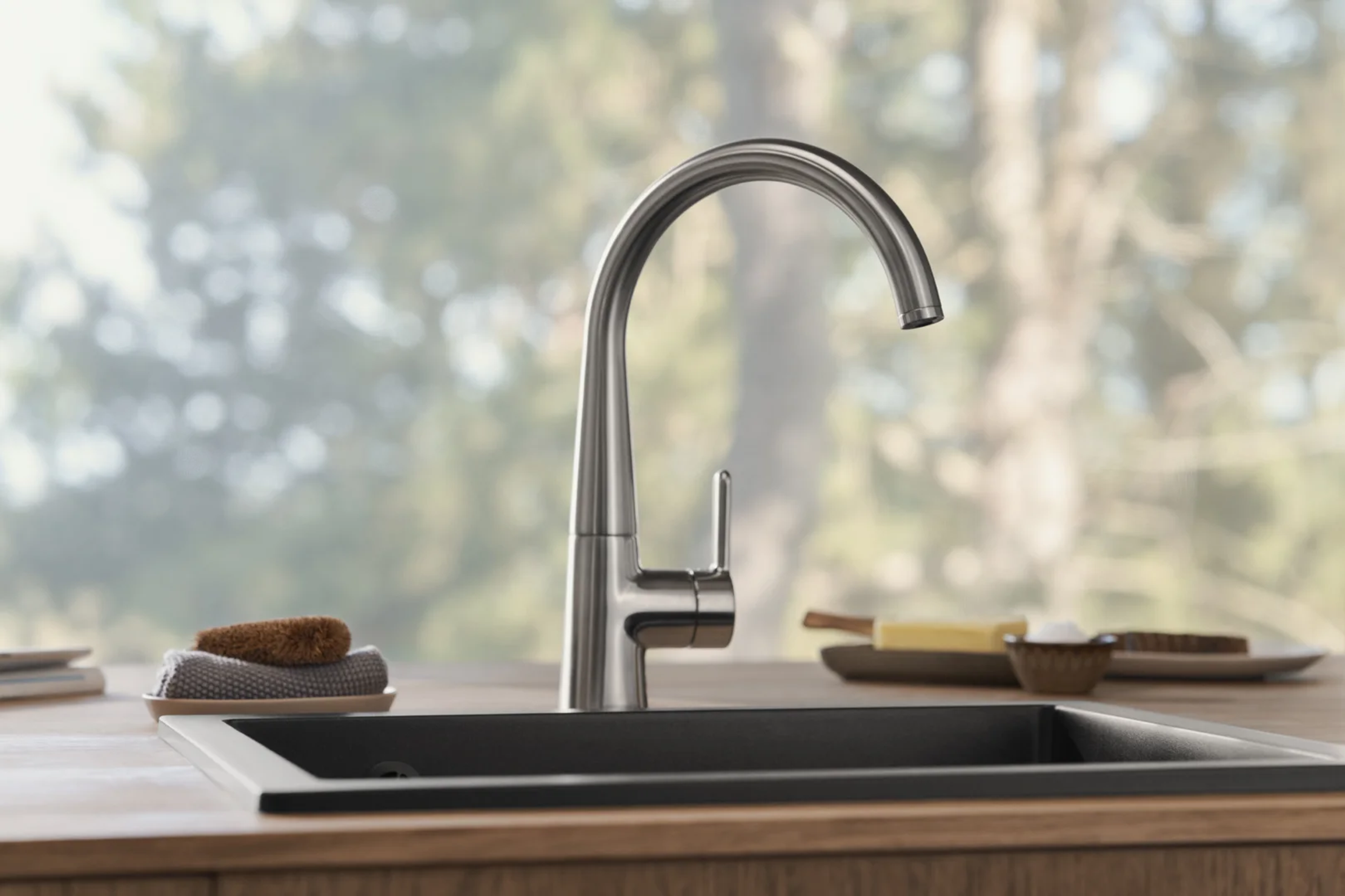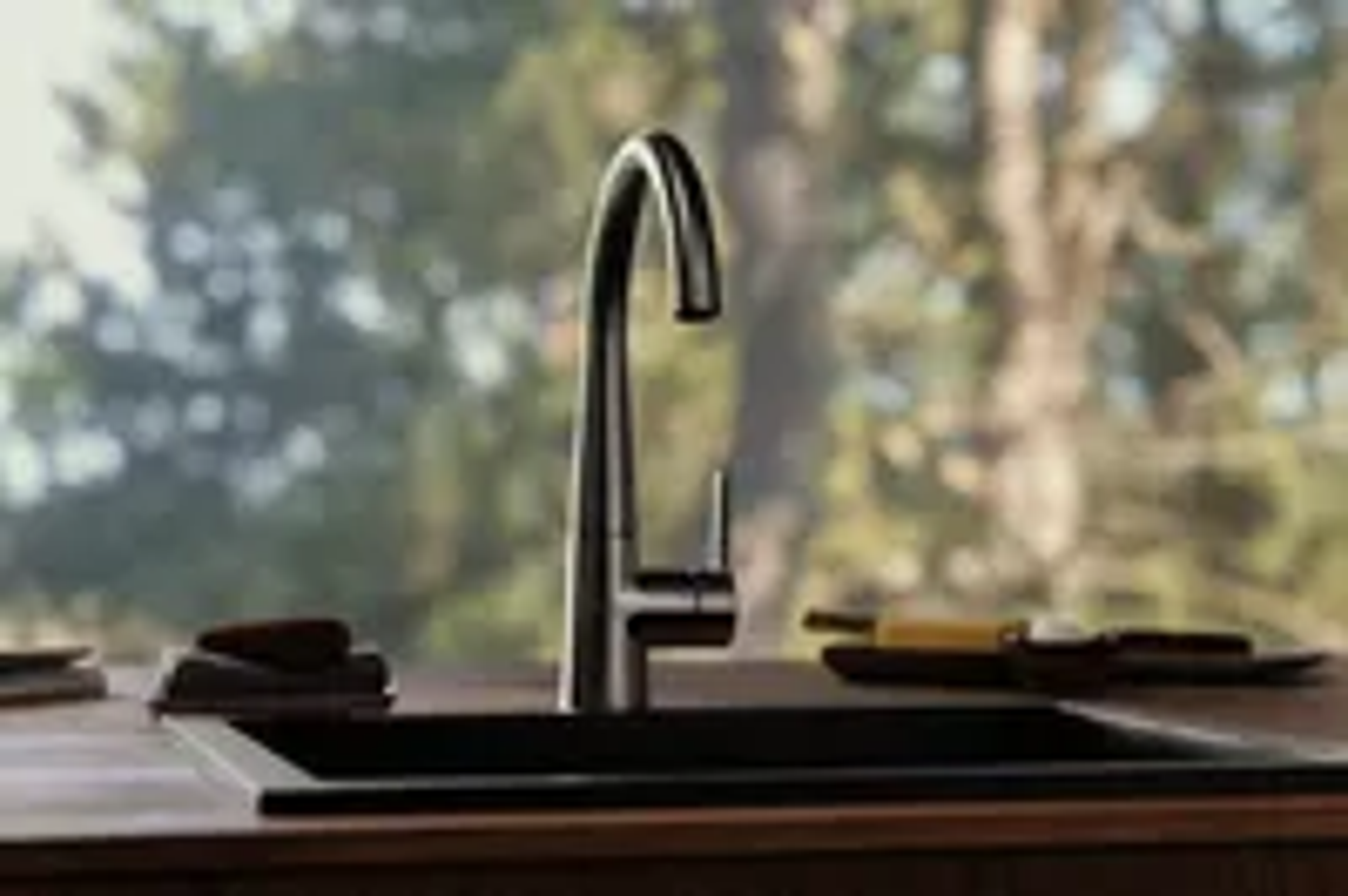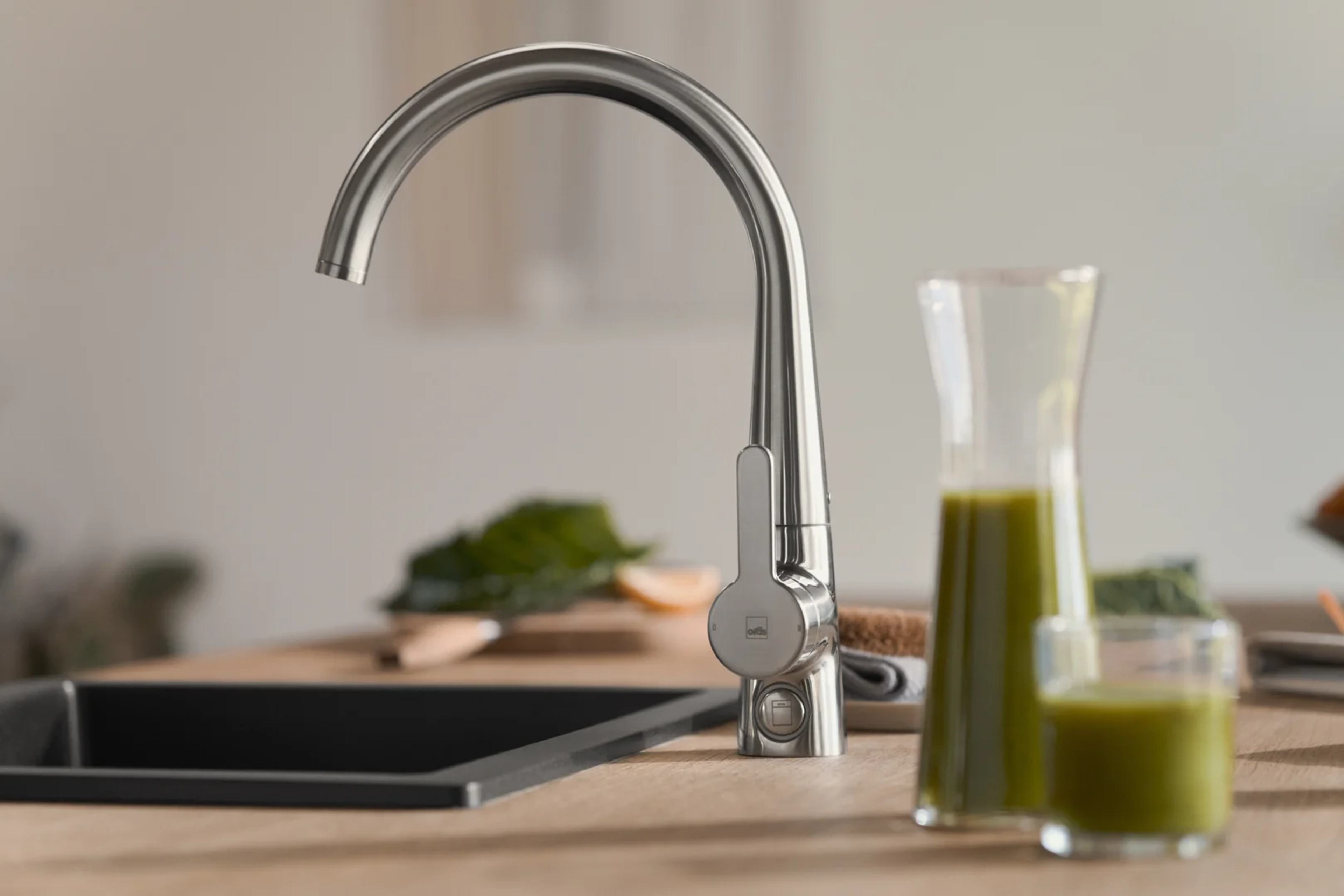 Stilren kjøkkenkran i børstet stål for kjøkkenet i dag og for fremtiden. Elektronisk avstengning til oppvaskmaskin, stenger automatisk etter 4 eller 12 timer. Mulighet for å sette en fast skoldesperre i hendelen, og en maksimal vannmengde