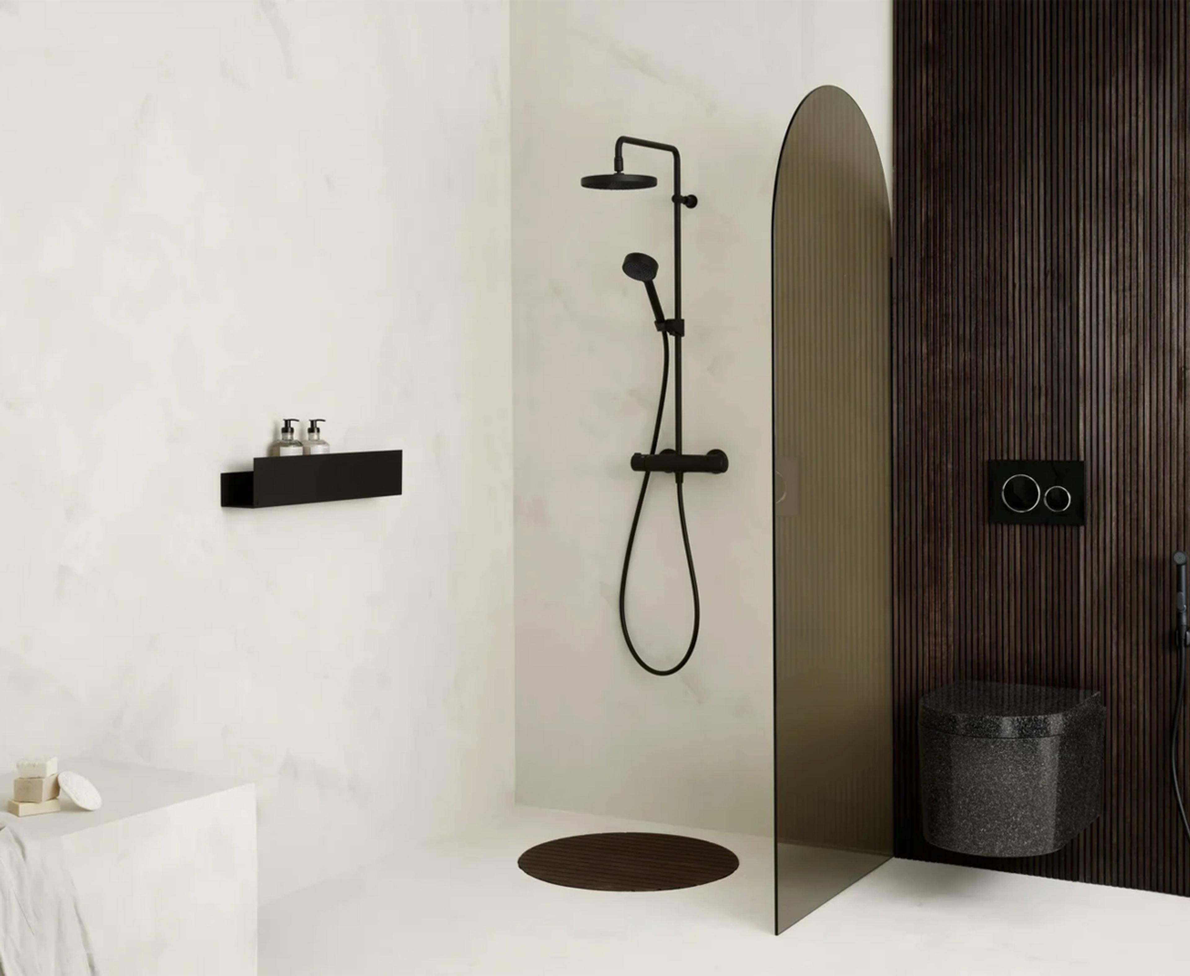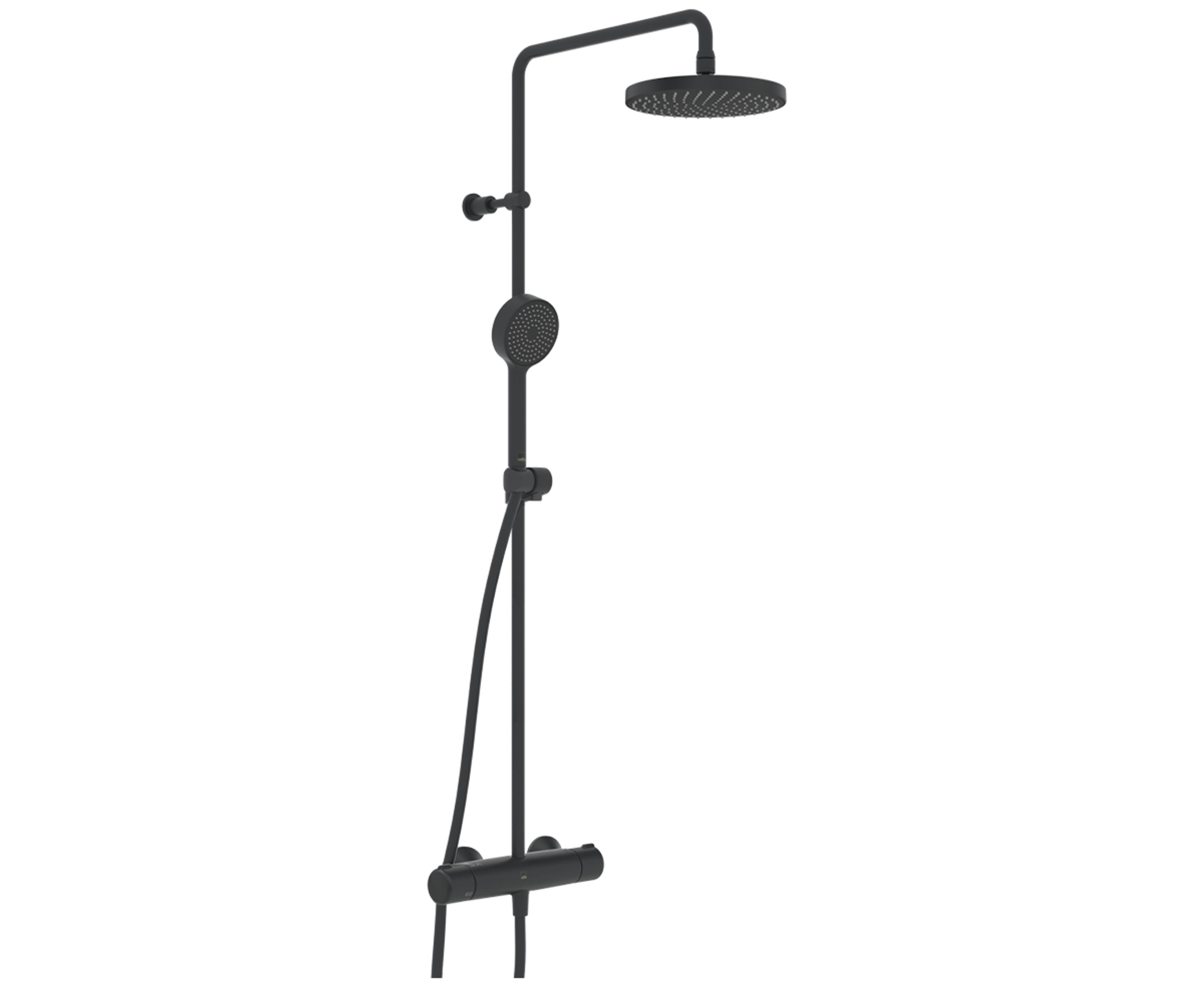 Dusjsett bestående av hånddusj, takdusj, dusjstang og dusjbatteri. Dusjkranen er utstyrt med skoldesperre 38°C på temperaturratt samt mengderegulering med EcoFlow. EcoFlow-begrenser gjør at du kan begrense vannforbruket med opptil 60% vann, samtidig som du får en god og behagelig dusjopplevelse. Farge: Sort Matt