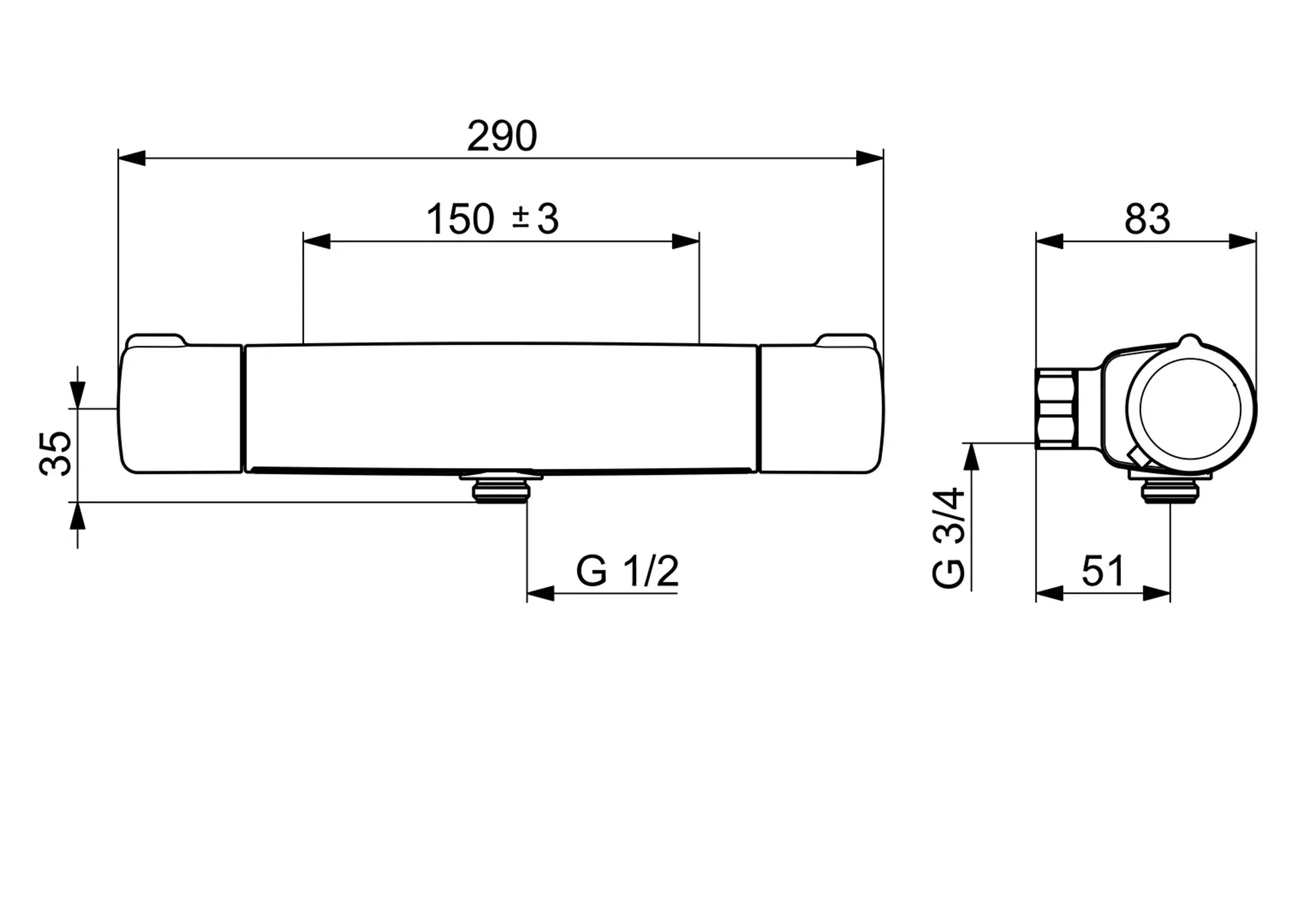 Blyfri dusjkran med termostat. Temperaturgrep med skoldesperre ved 38°C, mengdegrep med ECO funksjon. Kranen har tilbakeslagsventiler og smussfilter