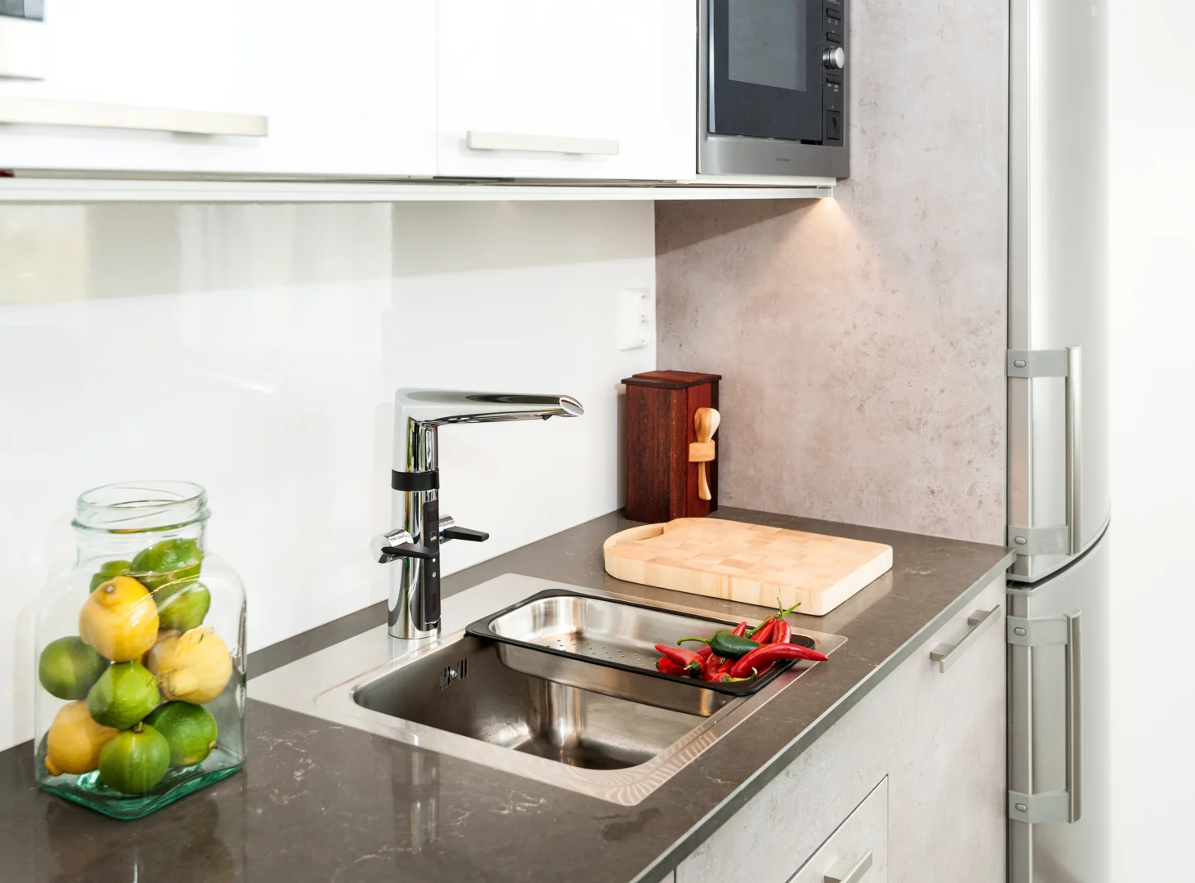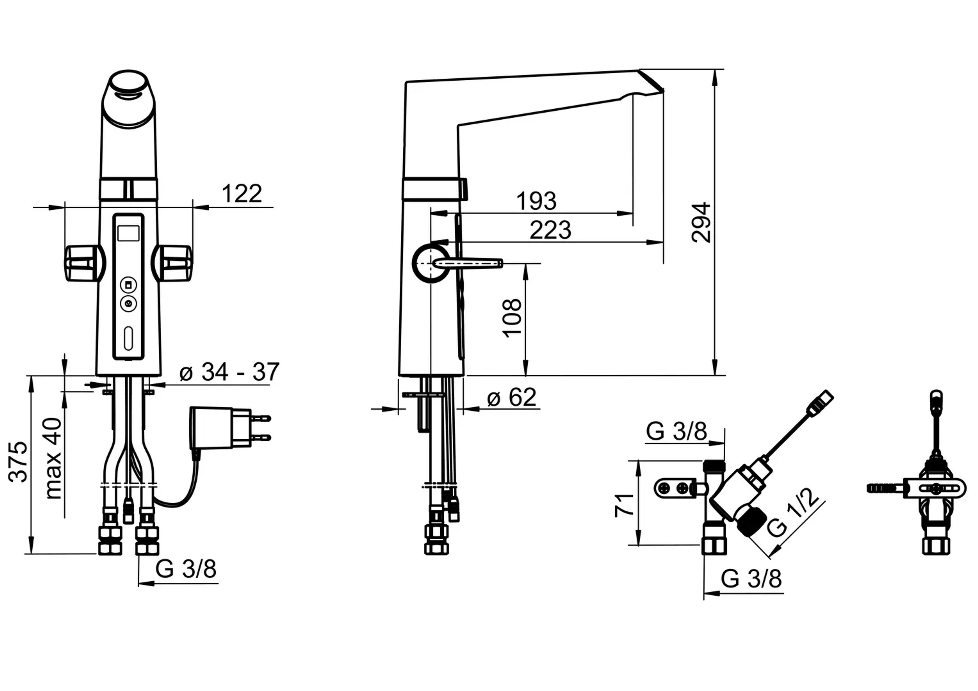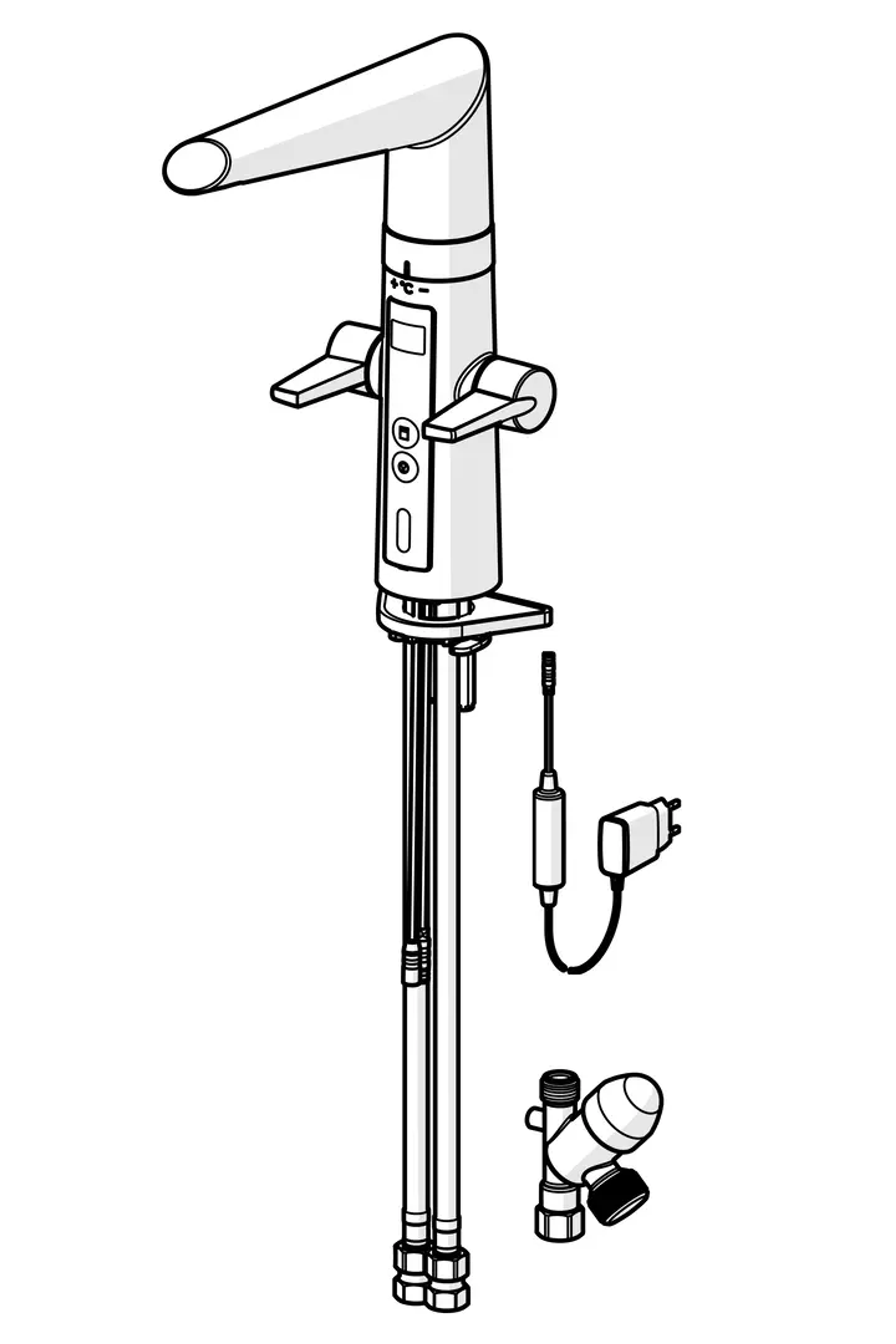 Hybrid kjøkkenkran med både grepsvennlige hendler for varmt og kaldt vann og berøringsfri funksjon. Utstyrt med digitalt temperaturdisplay og elektronisk avstengning til oppvaskmaskinen. Høy svingbar tut med strålesamler. Den berøringsfrie funksjonen aktiveres ved å føre hendene foran kranens sensor. Vanntemperaturen for berøringsfri håndvask justeres ved å vri på ringen mellom kranen og tuten. Den berøringsfrie funksjonen kan enkelt slås av/på. Ventilen for oppvaskmaskin åpnes ved å trykke på avstengningsknappen. Ventilen stenger automatisk etter 4 eller 12 timer (Åpen ventil i 4 timer ved ett trykk og 12 timer ved 5 sek vedvarende trykk). Elektrisk tilkobling er gjennom adapter 230/5 V (stikkontakt).