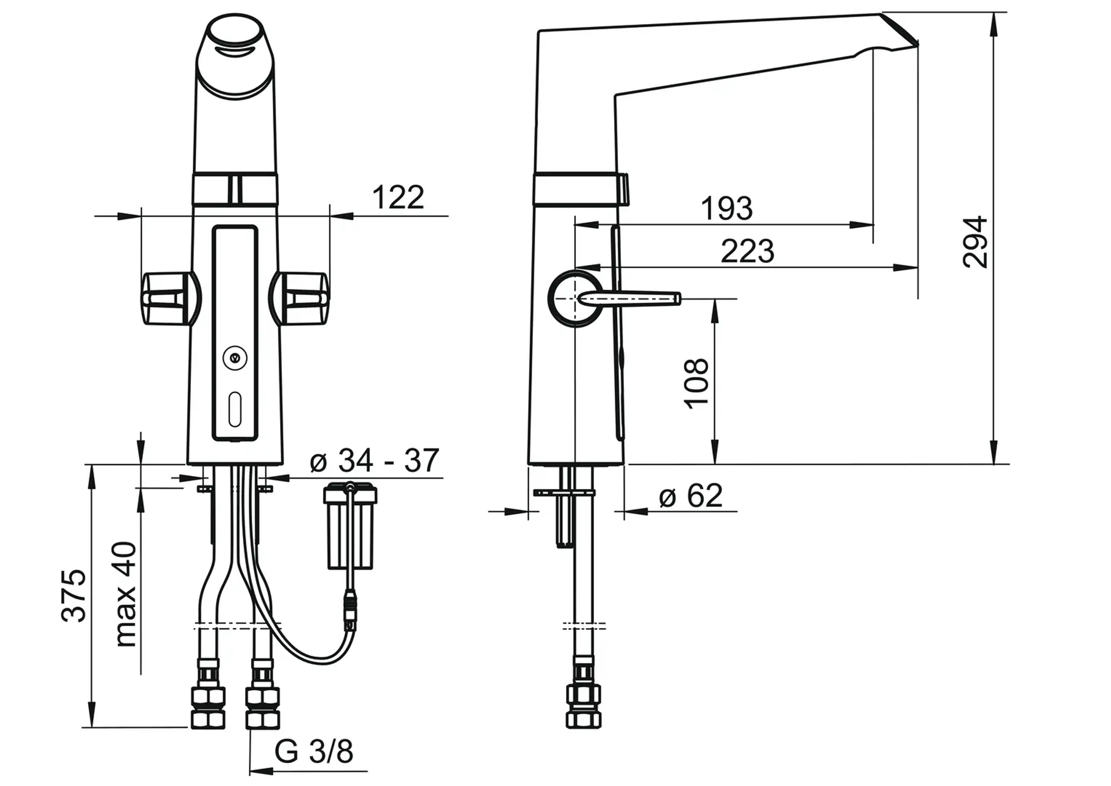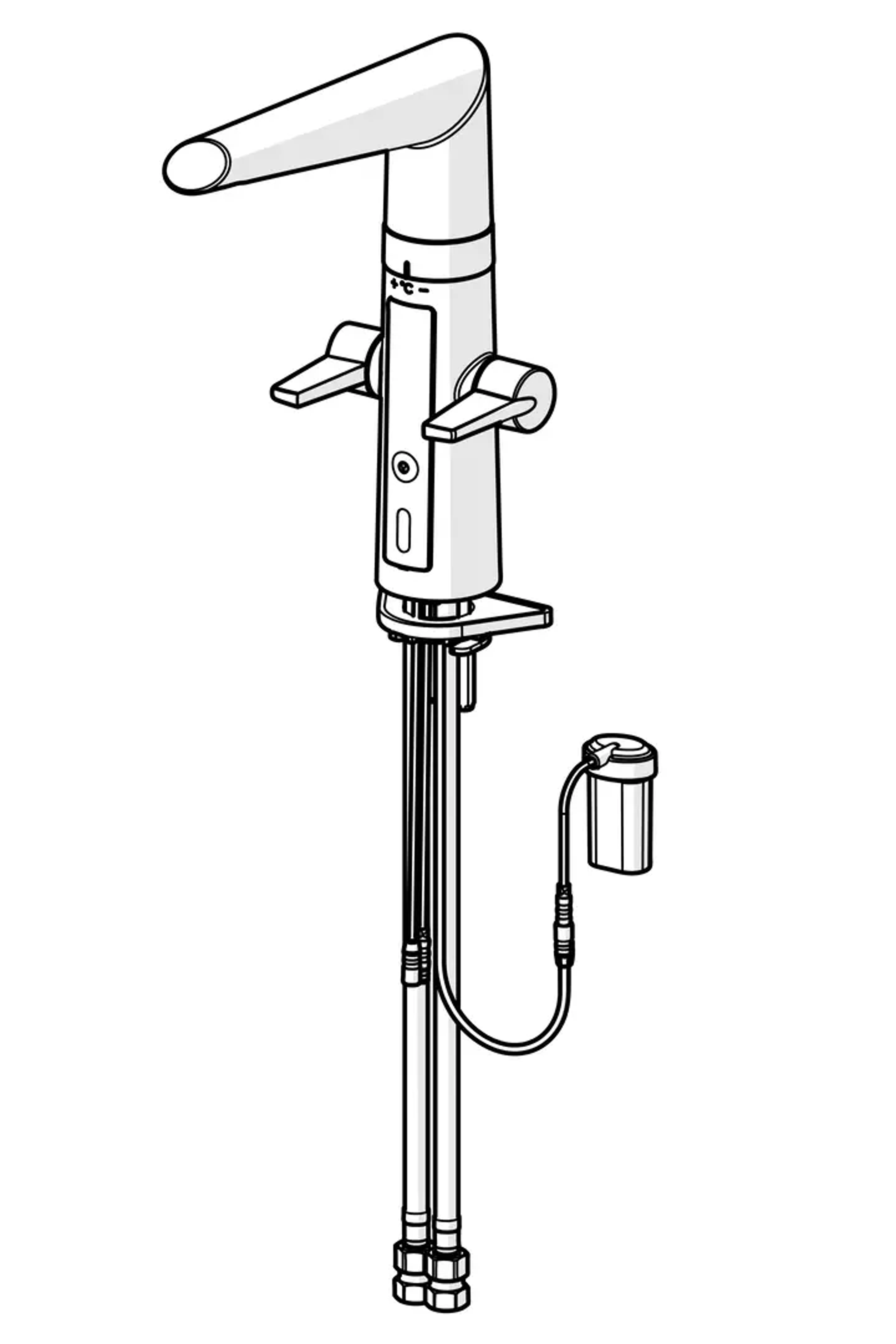 Hybrid kjøkkenkran med grepsvennlige hendler for varmt- og kaldtvann og berøringsfri funksjon samt høy tut. Tutens svingradius er fabrikkinnstilt til 120° (kan begrenses til 60° eller 80°). Den berøringsfrie funksjonen aktiveres ved å føre hendene foran kranens følsomhetsområde. Vanntemperaturen for berøringsfri håndvask justeres ved å vri på ringen mellom kranen og tuten. Den berøringsfrie funksjonen kan enkelt slås av/på. Batteridrevet, 3 V. Kranen er utstyrt med smussfilter.