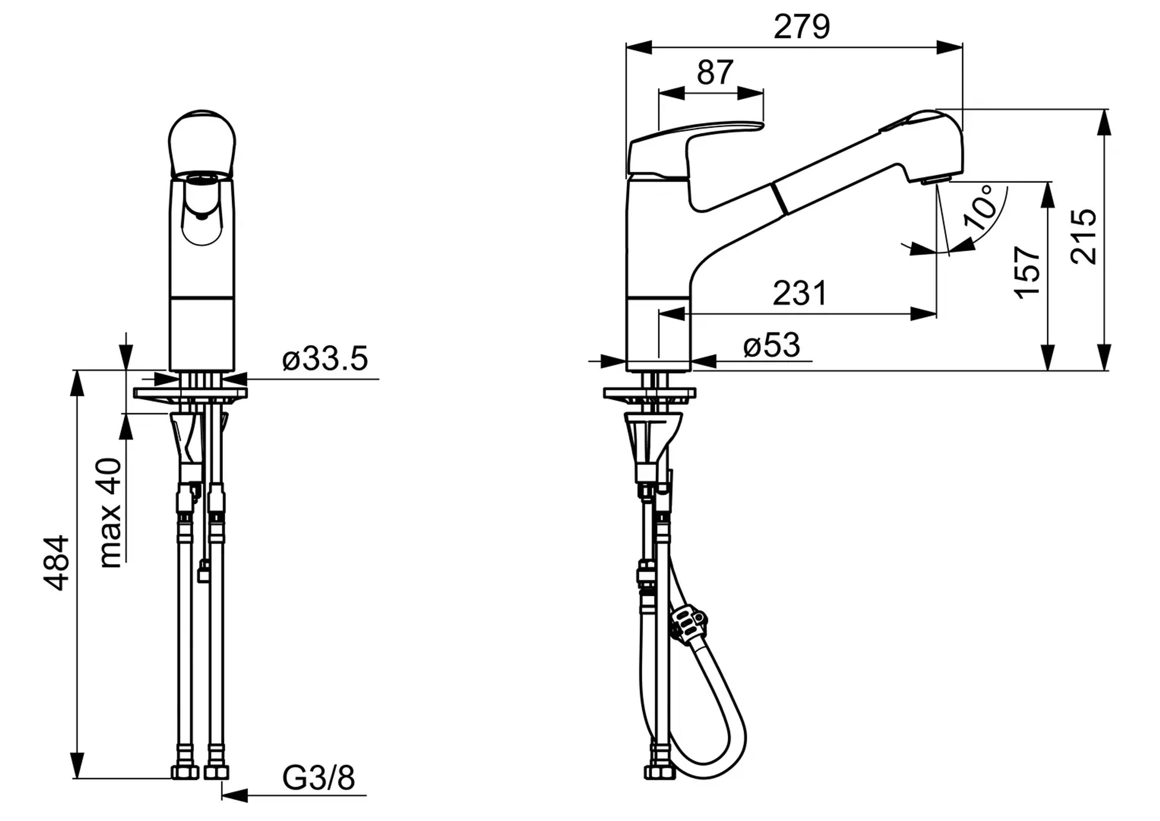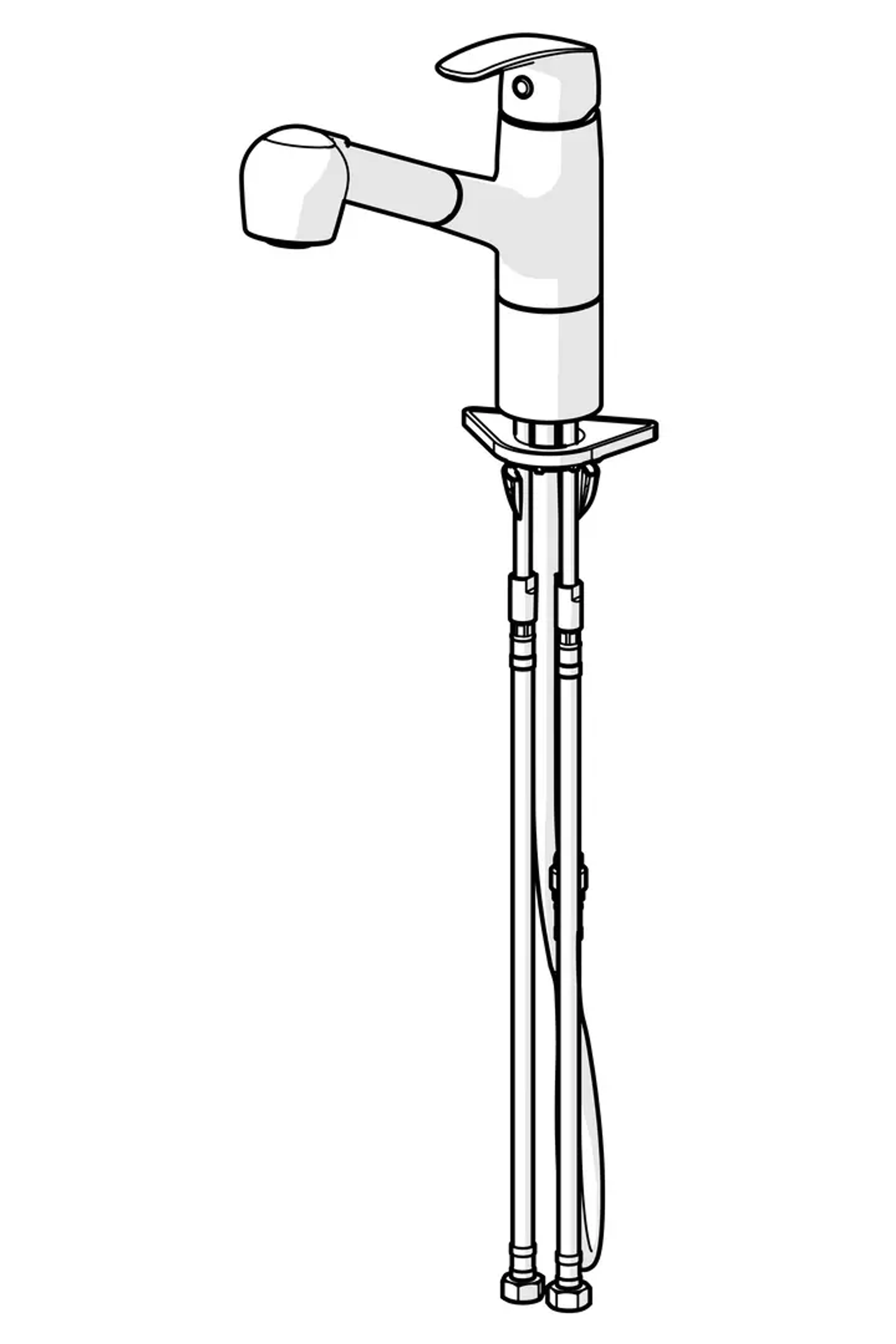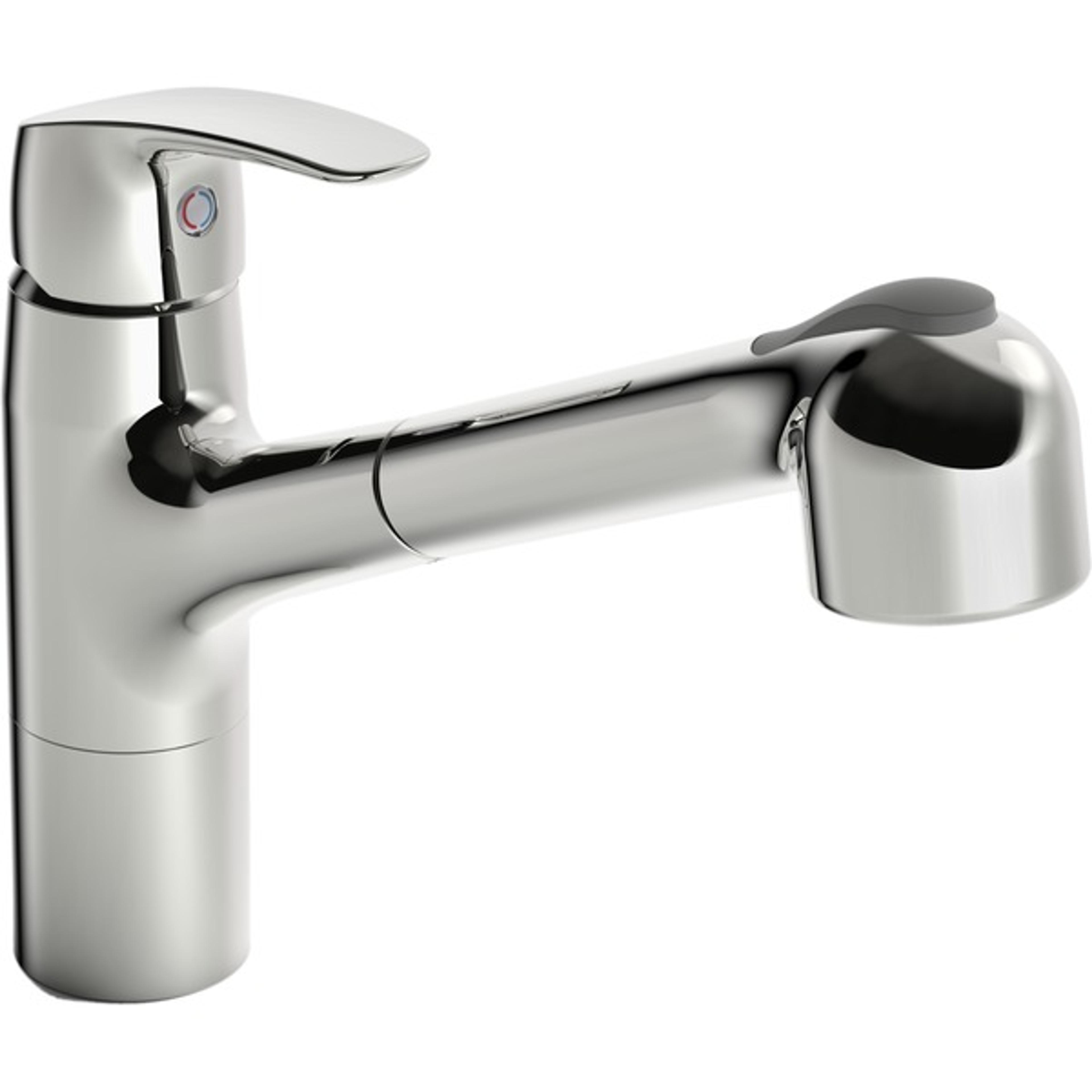 Kjøkkenkran med uttrekkbar og svingbar tut med to stråletyper. Lengden på den uttrekkbare tuten kan tilpasses. Tutens svingradius er forhåndsinnstilt på 120° (kan begrenses til 40° - 80°). Det er også innebygd alternative begrensninger for vanntemperatur og maksimal vannmengde. F = fleksible slanger
