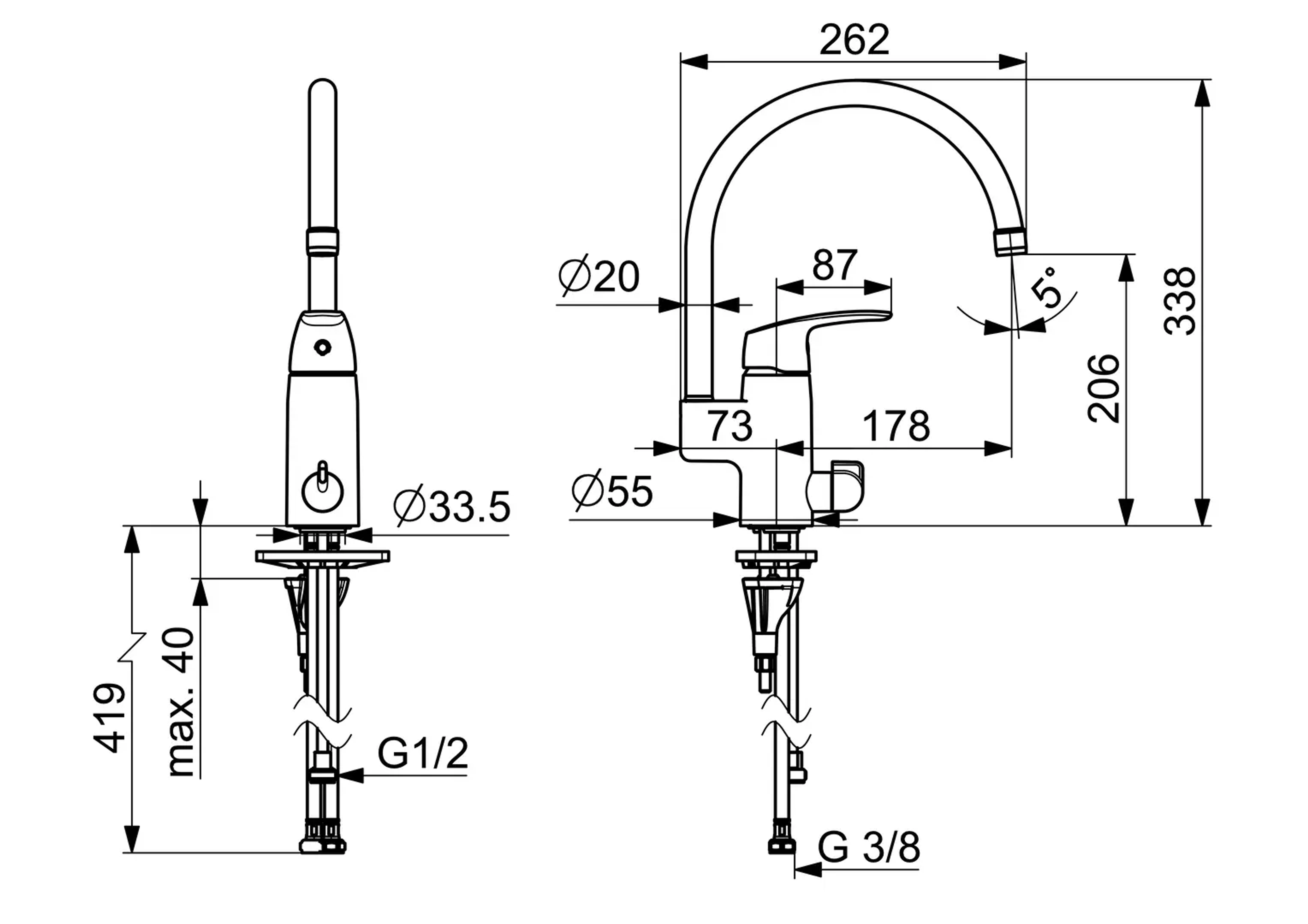 Kjøkkenkran med høy svingbar tut og keramisk avstengning for oppvaskmaskin (ON/OFF). Tutens svingradius er fabrikkinnstilt til 120° (kan begrenses til 0° eller 60°). Det er også innebygd alternative begrensninger for vanntemperatur og maksimal vannmengde. F = fleksible slanger Vannmengde 3.4 l/m Oppfyller kravene til effektiv bruk av vann ved Breeam.