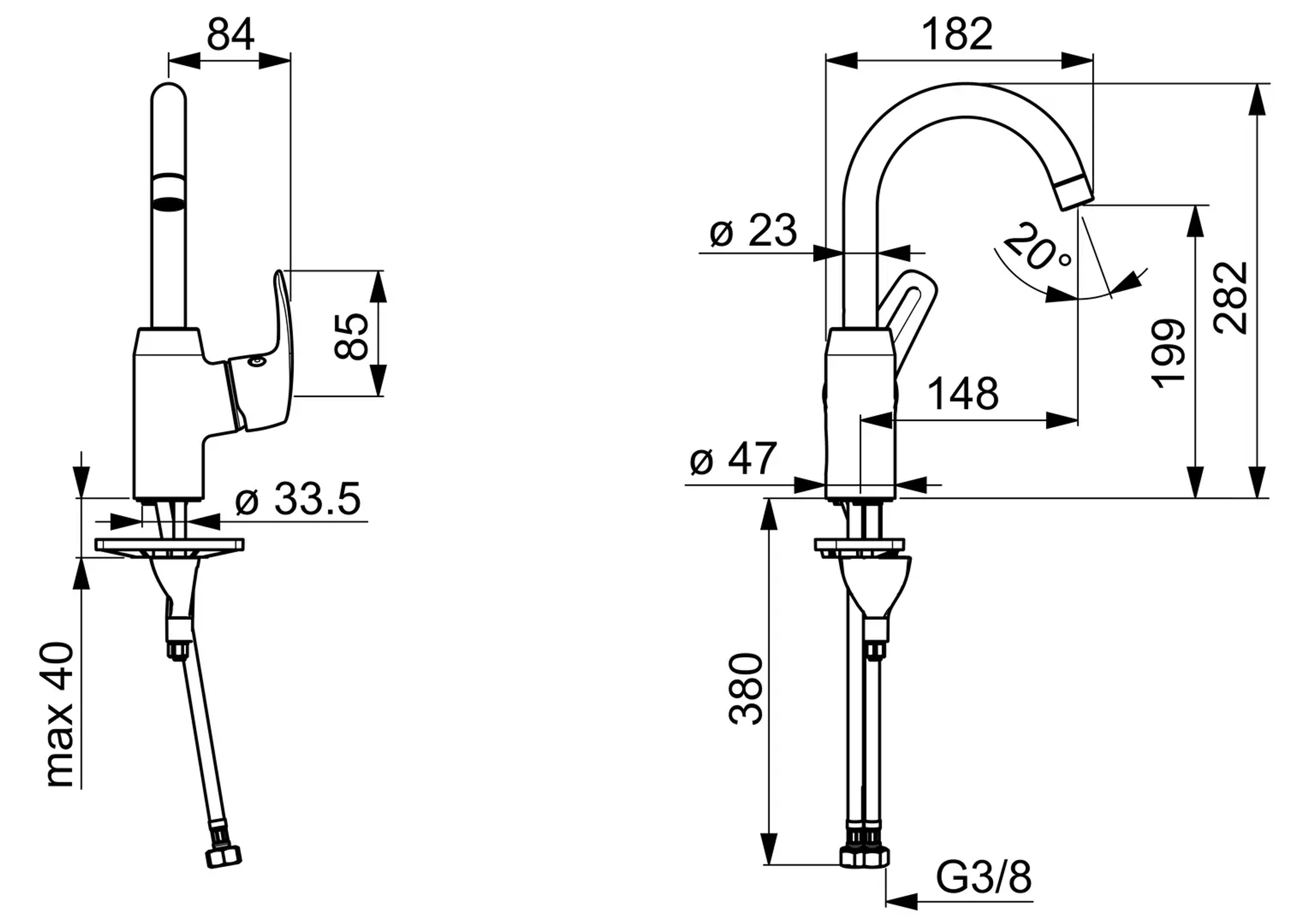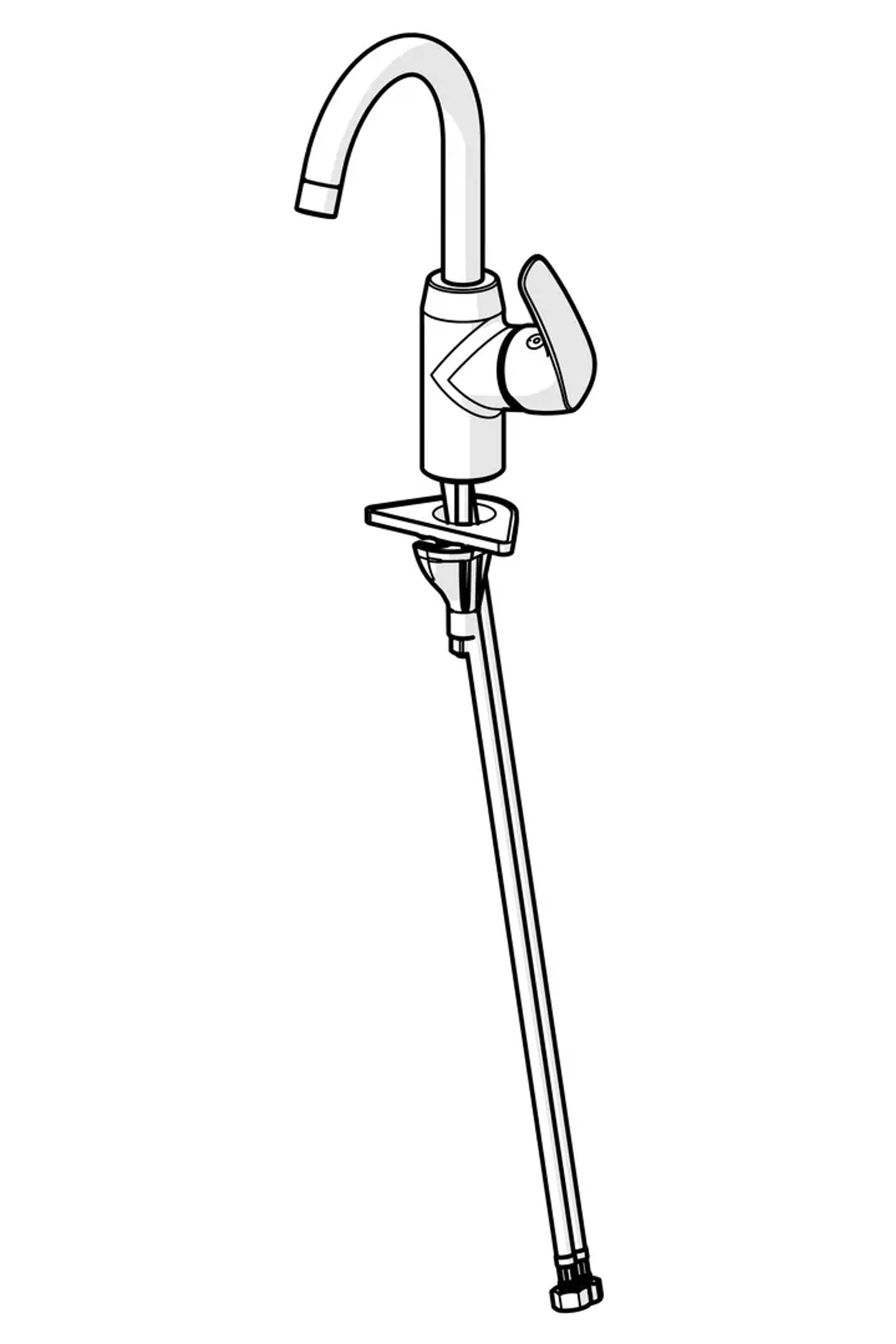 Servantkran med høy svingbar tut og sidegrep. Det er også innebygd alternative begrensninger for vanntemperatur og maksimal vannmengde. F = fleksible slanger