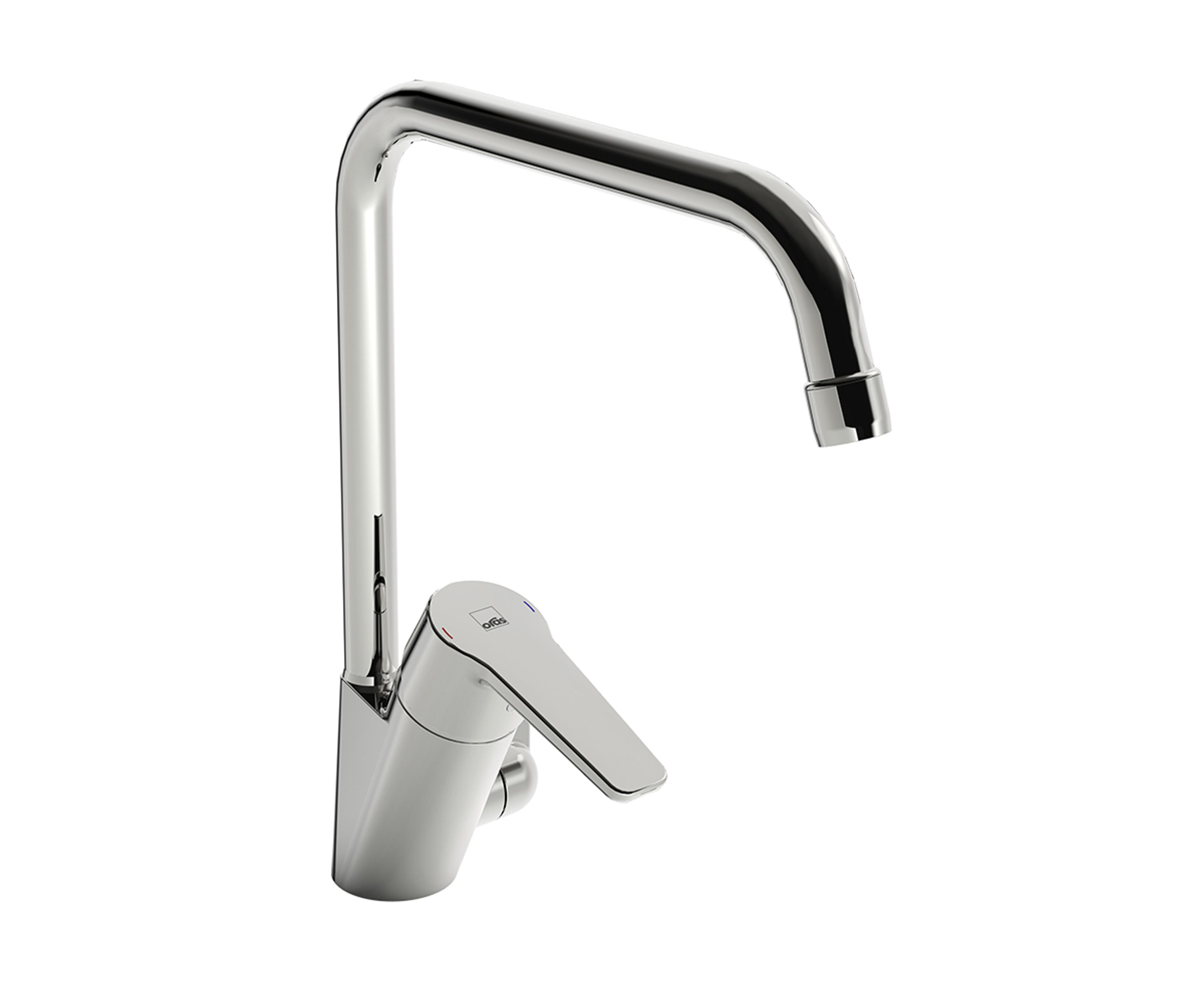 Kjøkkenkran med høy svingbar tut, strålesamler og kjeramisk 90° dreibar avstening for oppvaskmaskin (ON/OFF). Tutens svingradius er fabrikkinnstilt til 120° (kan begrenses til 60°). Det er også innebygd alternative begrensninger for vanntemperatur og maksimal vannmengde. F = med fleksible slanger. Oras Saga er en konkurransedyktig, tidløs designlinje for moderne prosjekt kjøkken.