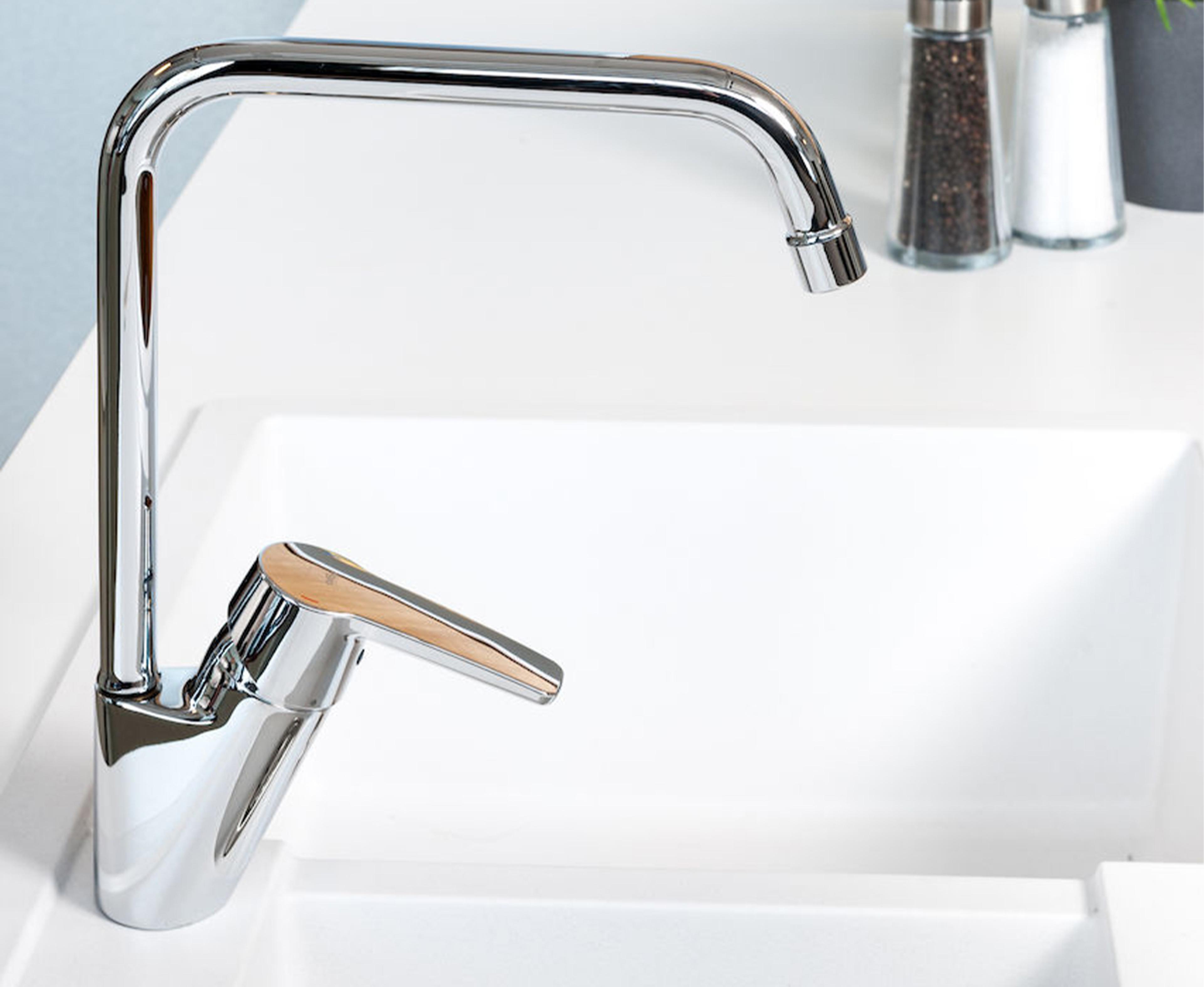 Oras Saga Kjøkkenkran 1 790,–Grunnfarge: KromMed stoppventil for oppvaskmaskinTotal byggehøyde: 168 mm