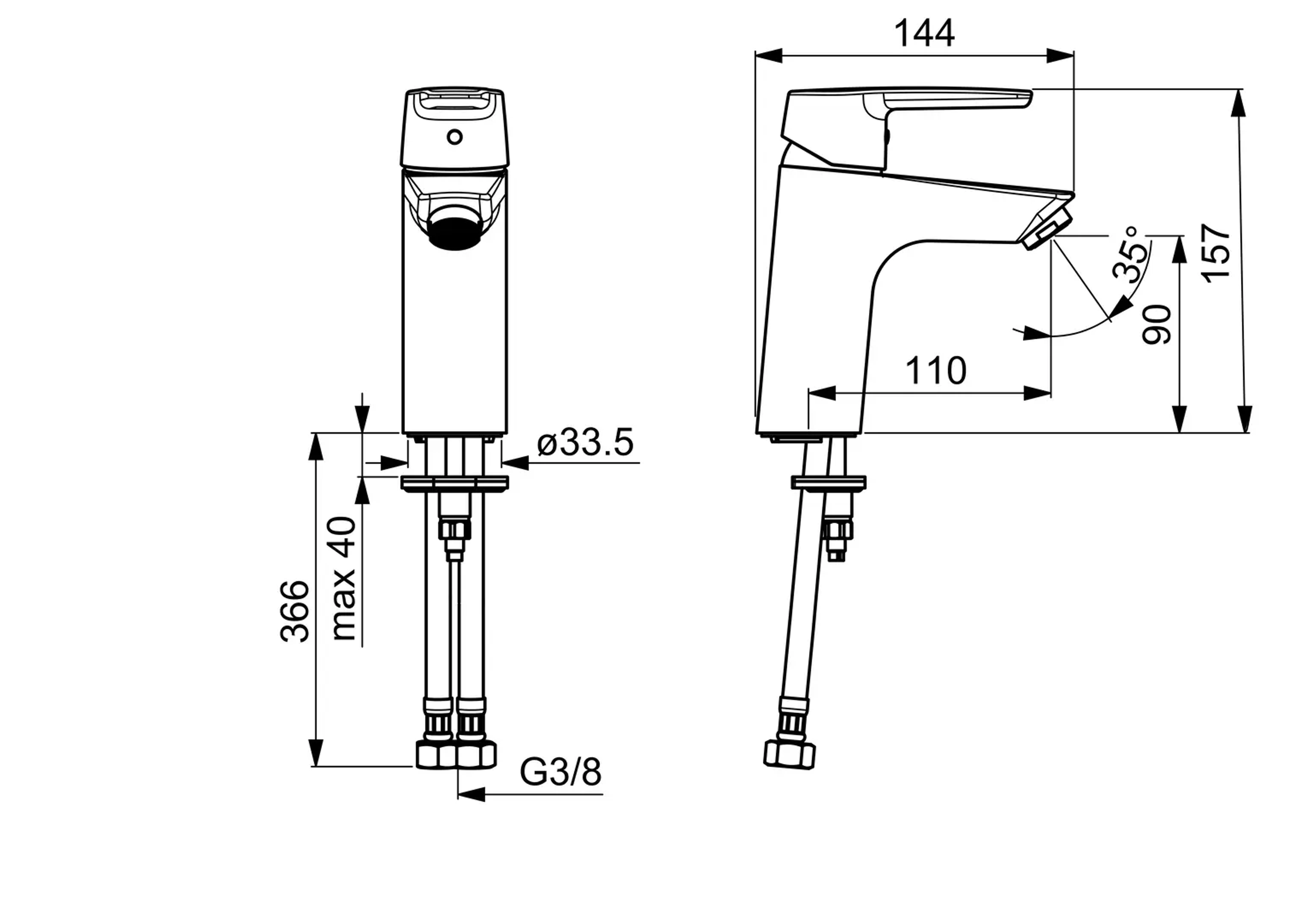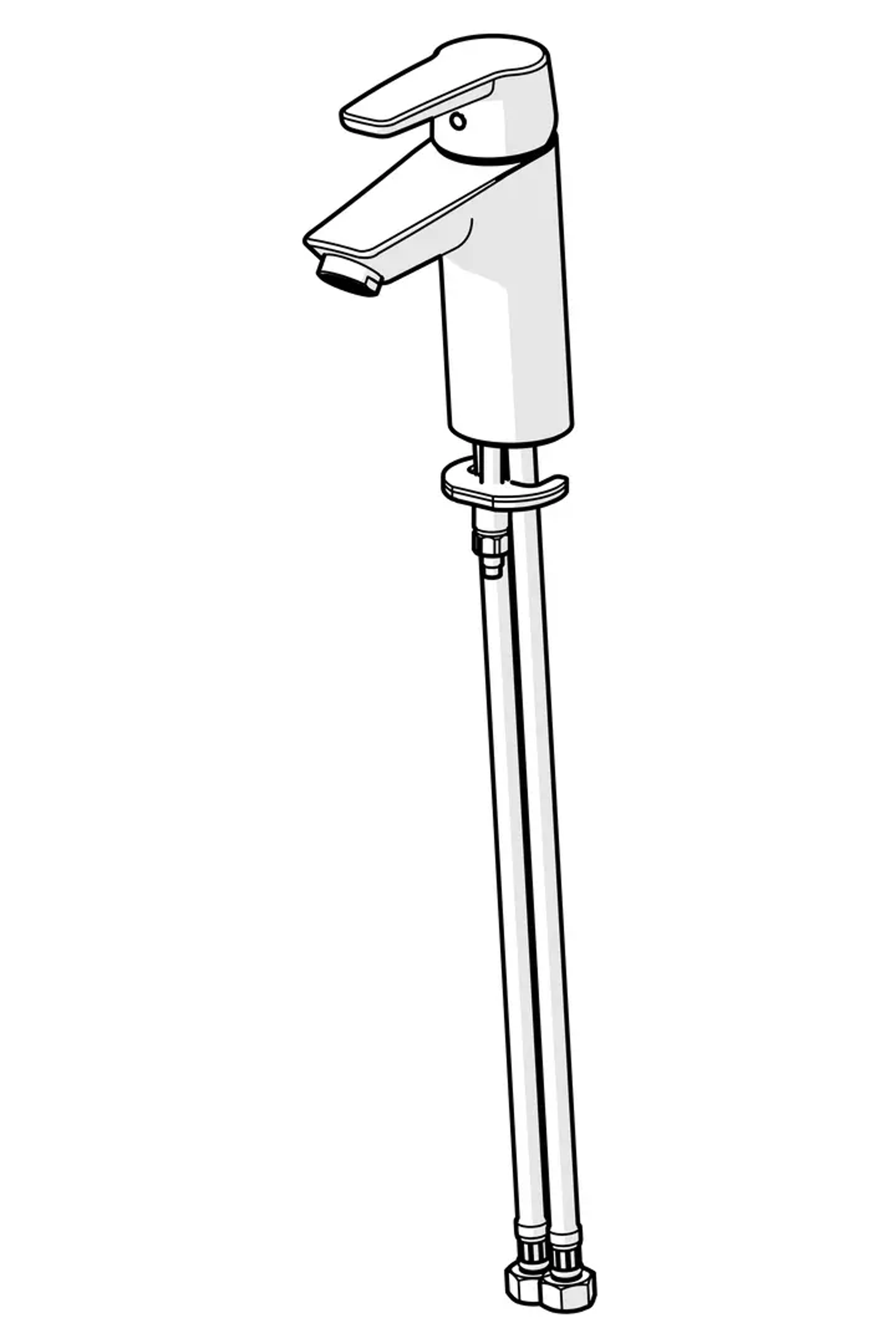 Servantkran XL med fast tut. Det er også innebygd alternative begrensninger for vanntemperatur og maksimal vannmengde. Vannmengdebegrenser 6,0 l / min. F = fleksible slanger
