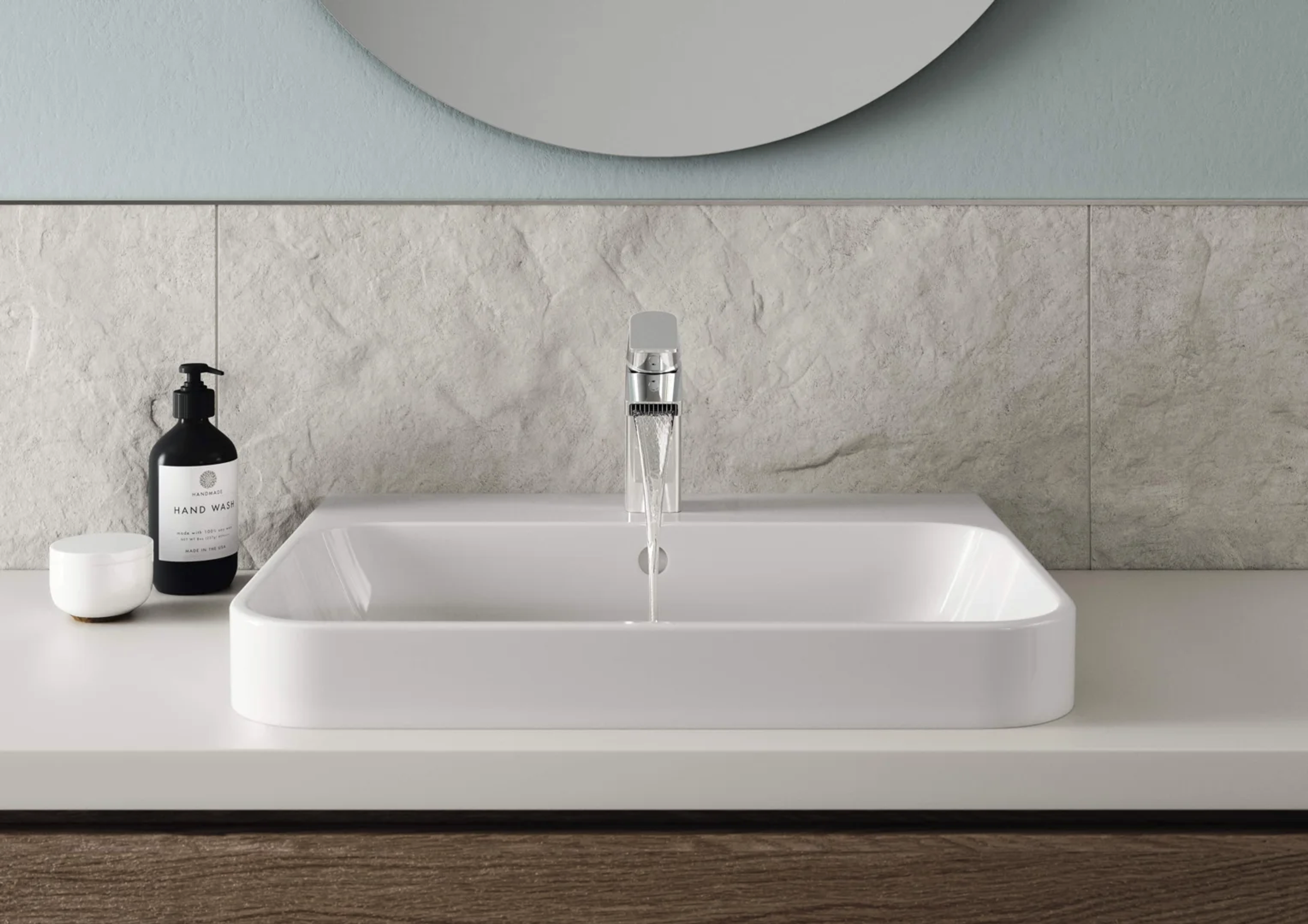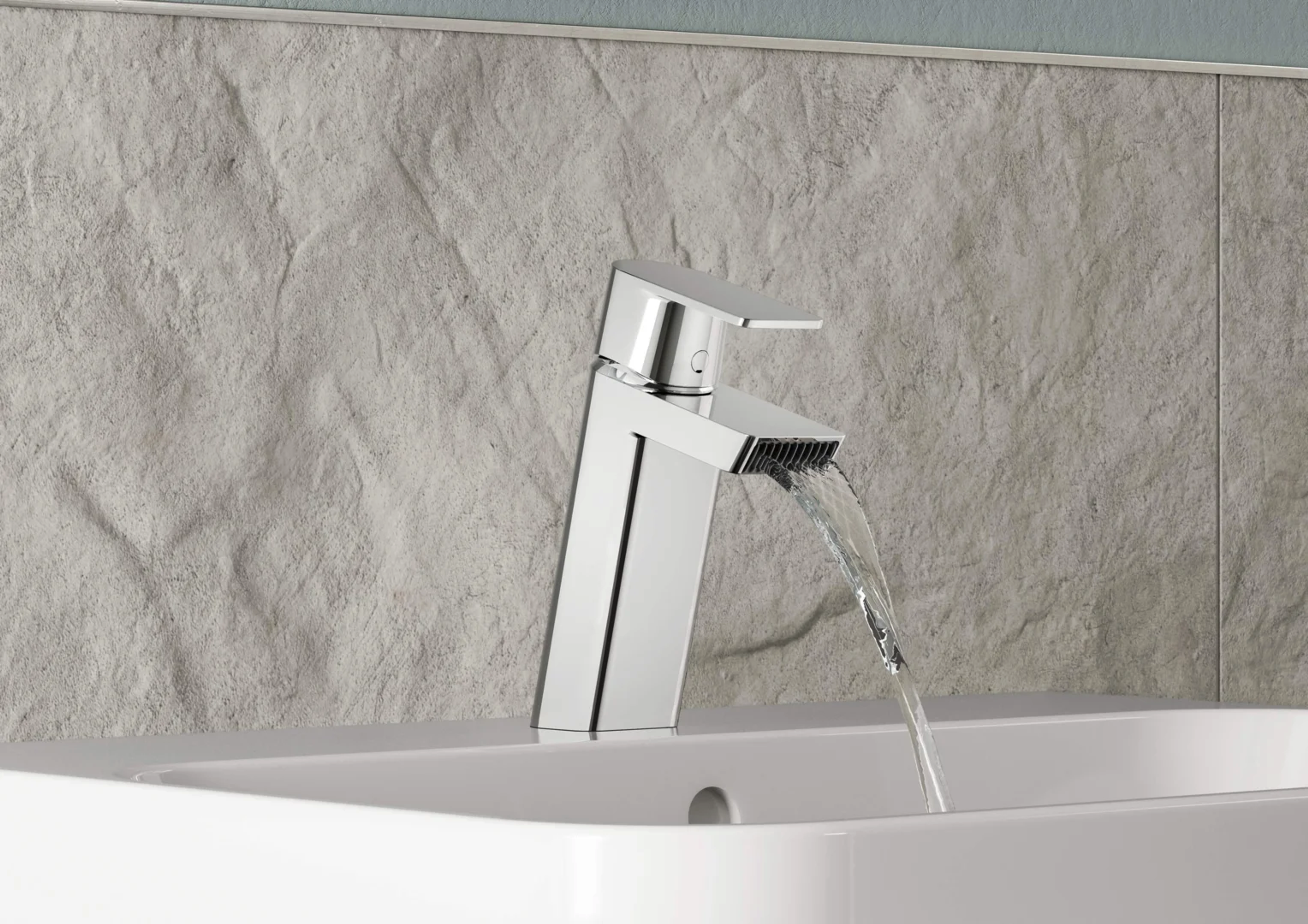 Oras Stela - med rene geometriske former, for å se moderne ut i årene som kommer. Servantkran med strålesamler som gir diamantstrukturert fossefall, et godt visuelt utseende også uten vann.