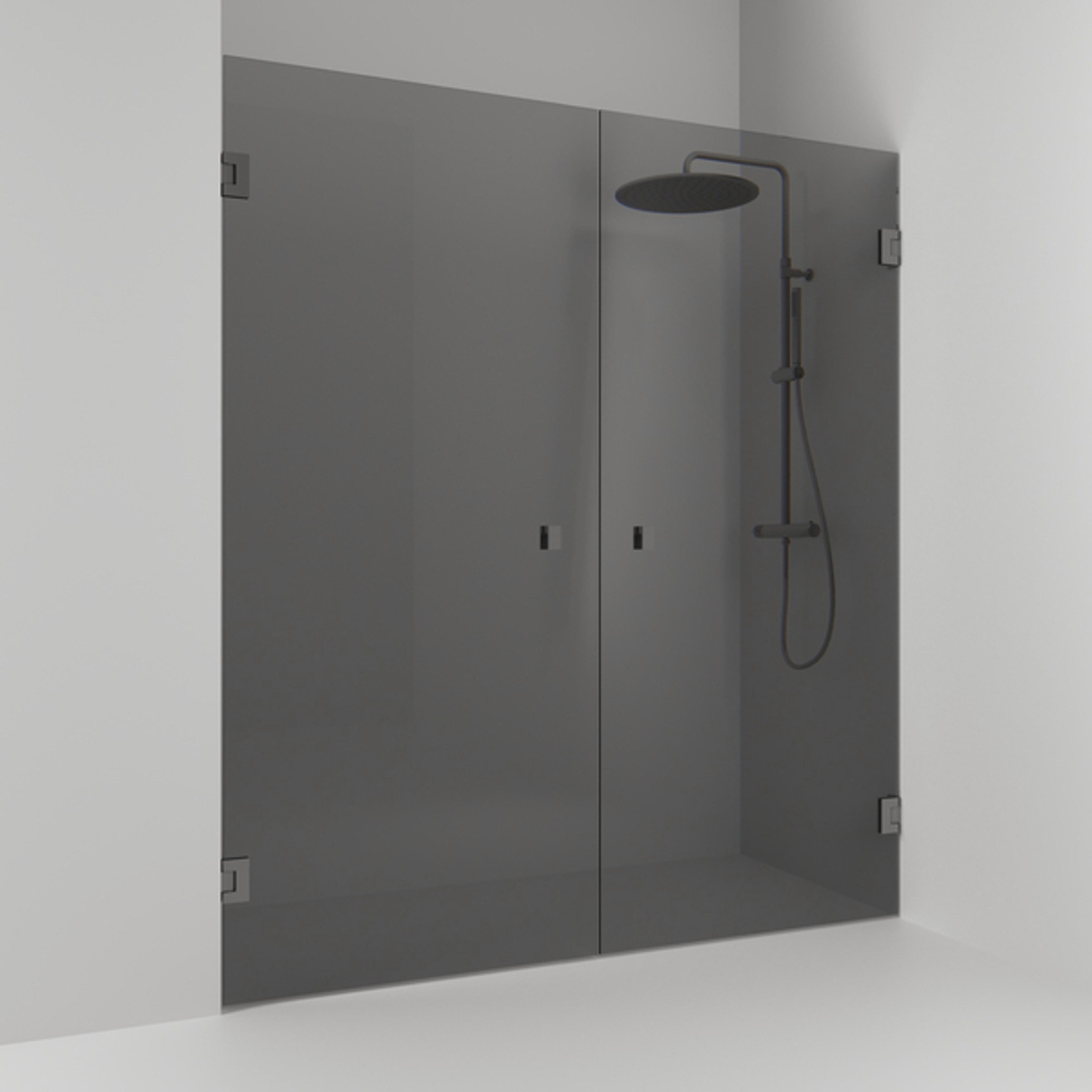 Løsningen har 2 dører i 8mm tykt, herdet sikkerhetsglass. De store glassflatene gir et lett og luftig inntrykk. Håndtak, hengsler, stag og gulvfeste forsterker helhetsinntrykket. Dørene kan skyves inn mot veggen når dusjen ikke benyttes, noe som frigjør gulvplass. Terskelfritt innsteg og selvstengende hengsler. Høyde 200 cm.