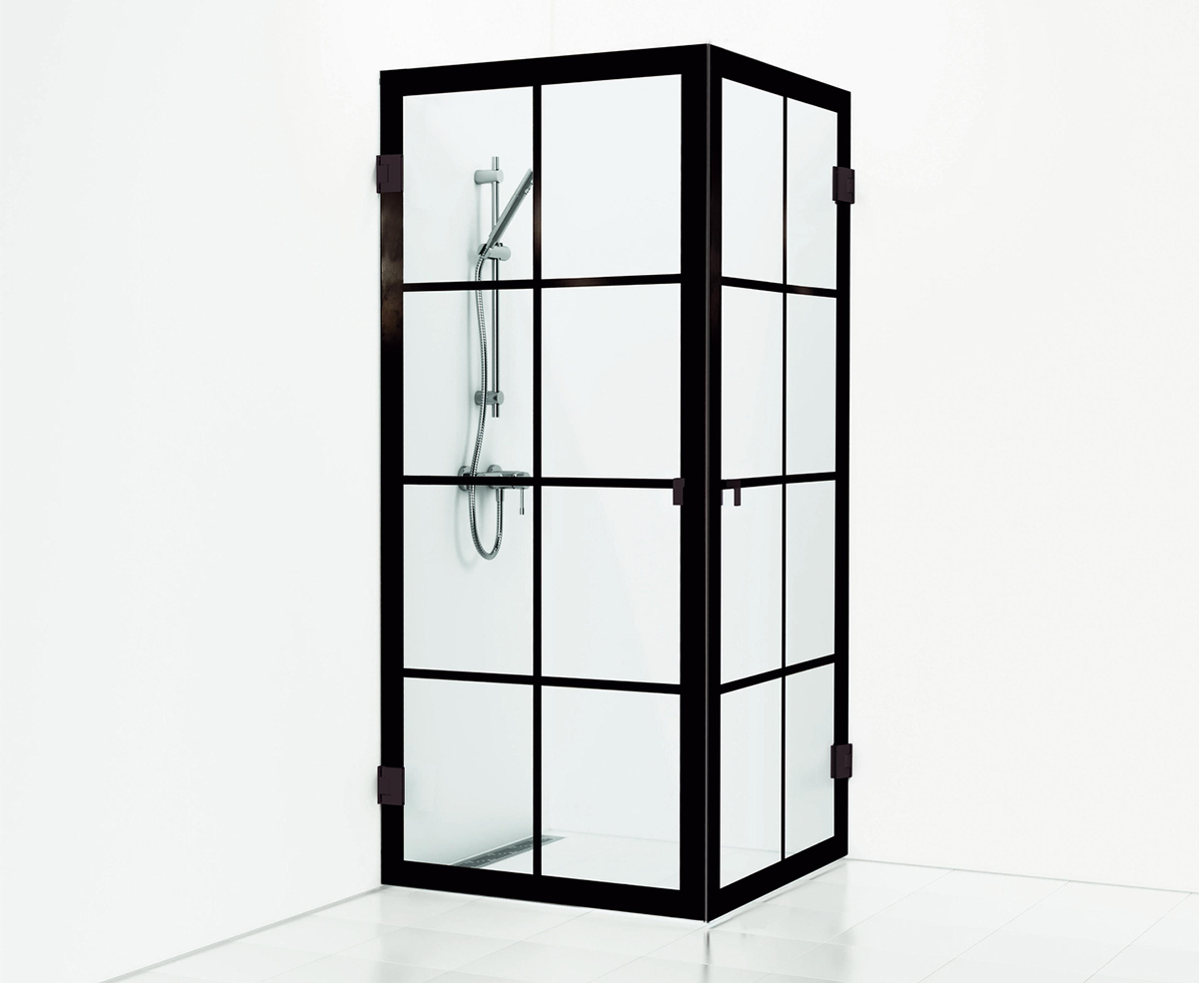 180° rett hjørnedusj med to åpningsbare dører i industridekor med pulverlakkerte profiler i matt svart. Hjørnedusjen har 8 mm herdet sikkerhetsglass og selvlukkende hengsler. Pris uten dusjsett og dusjkran. B: 90 H: 200 D: 90 cm