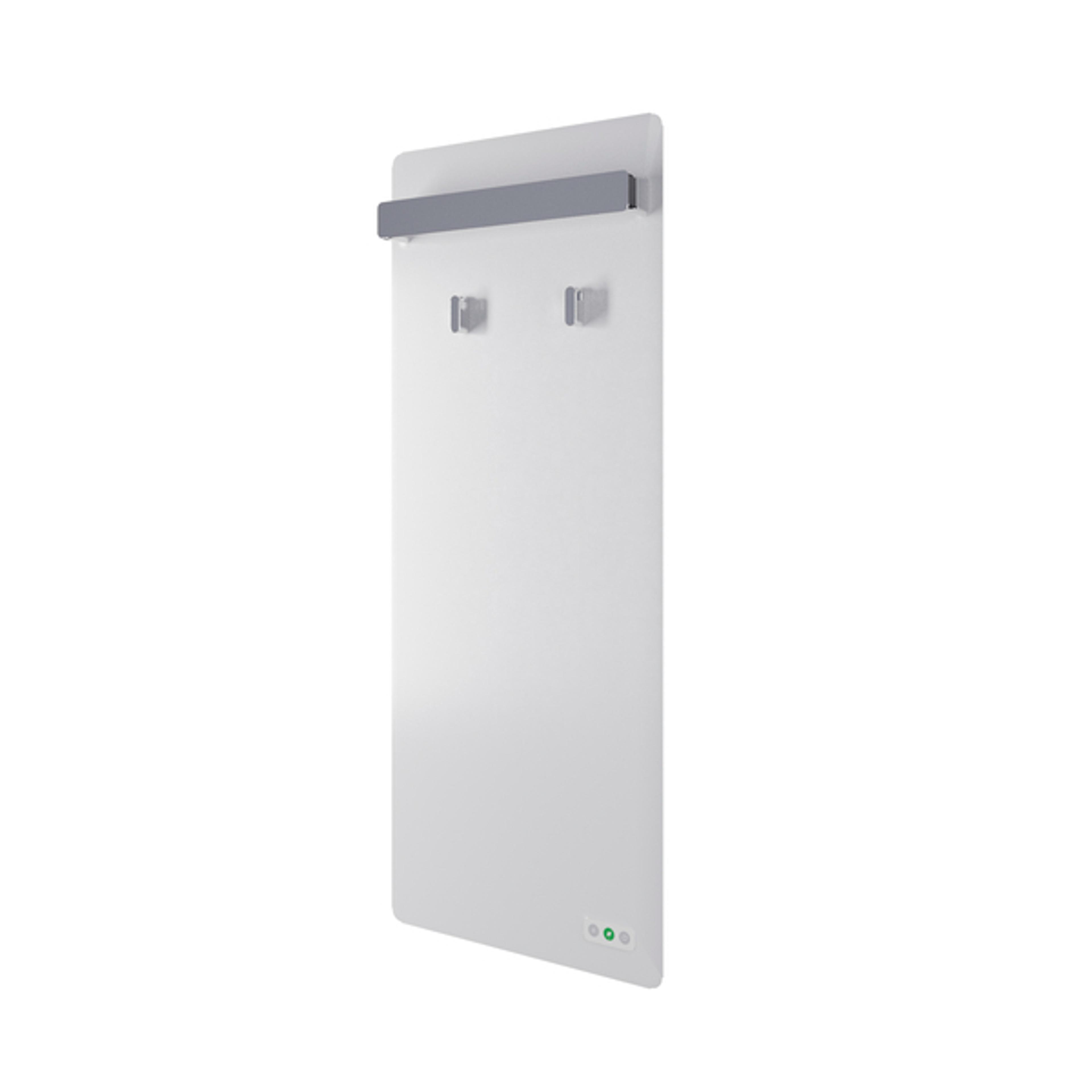 Innovativ håndkletørker med varmeoverføring og tørking via pulverlakkert stål. Skjult tilkobling for et rent, minimalistisk utseende og enkel styring i tre posisjoner med Eco-modus. Oppheng for badelaken og to kroker følger med. Design: Swift Creatives.