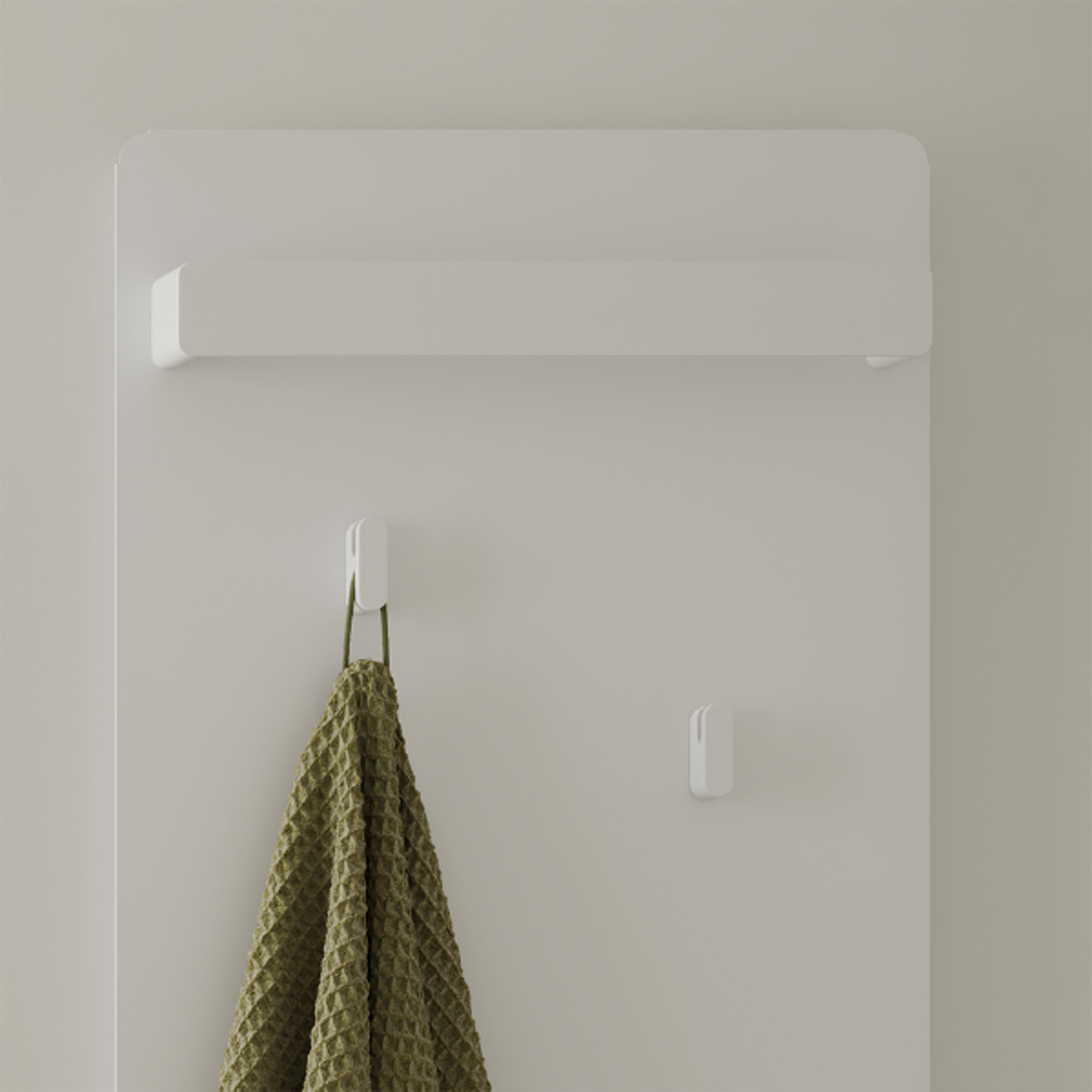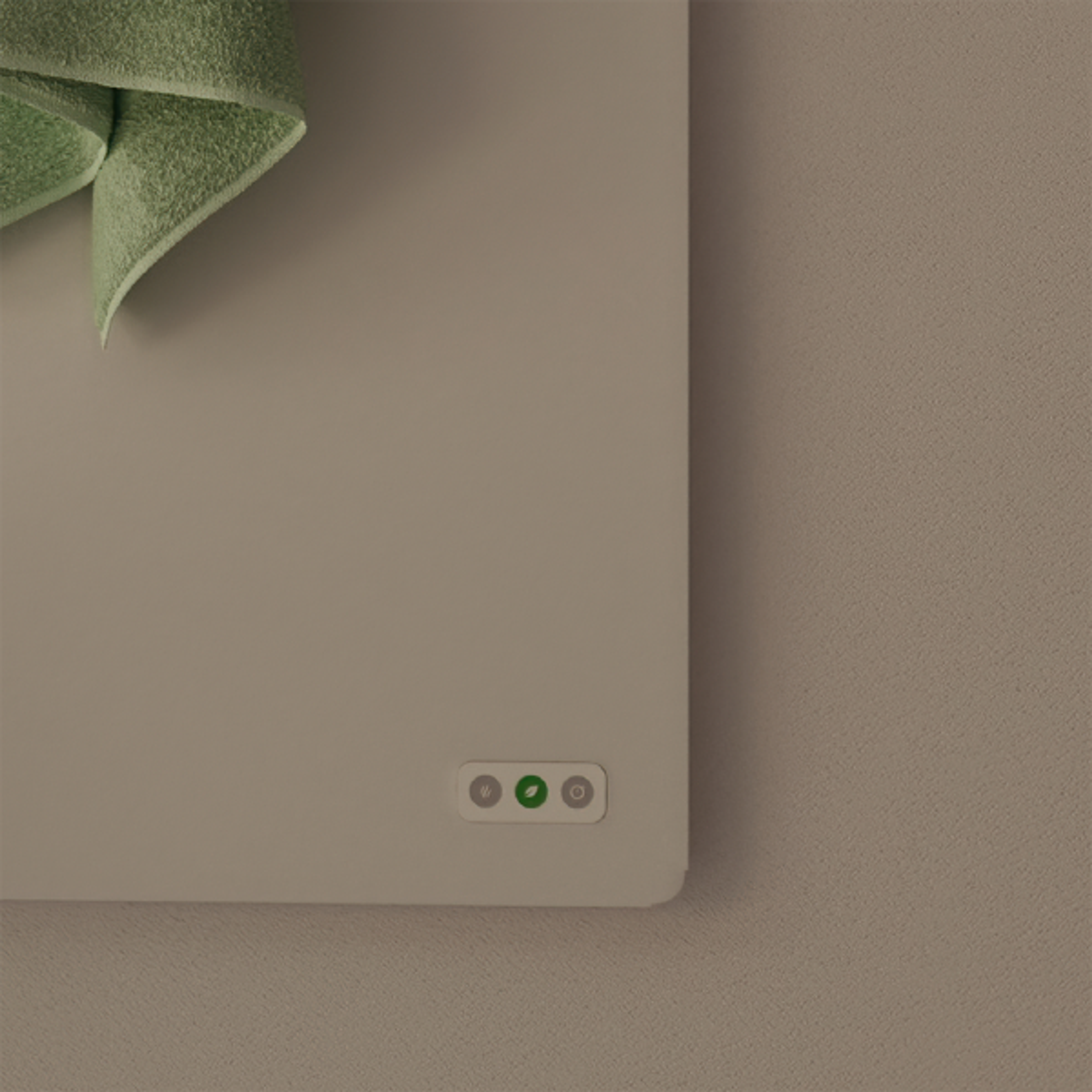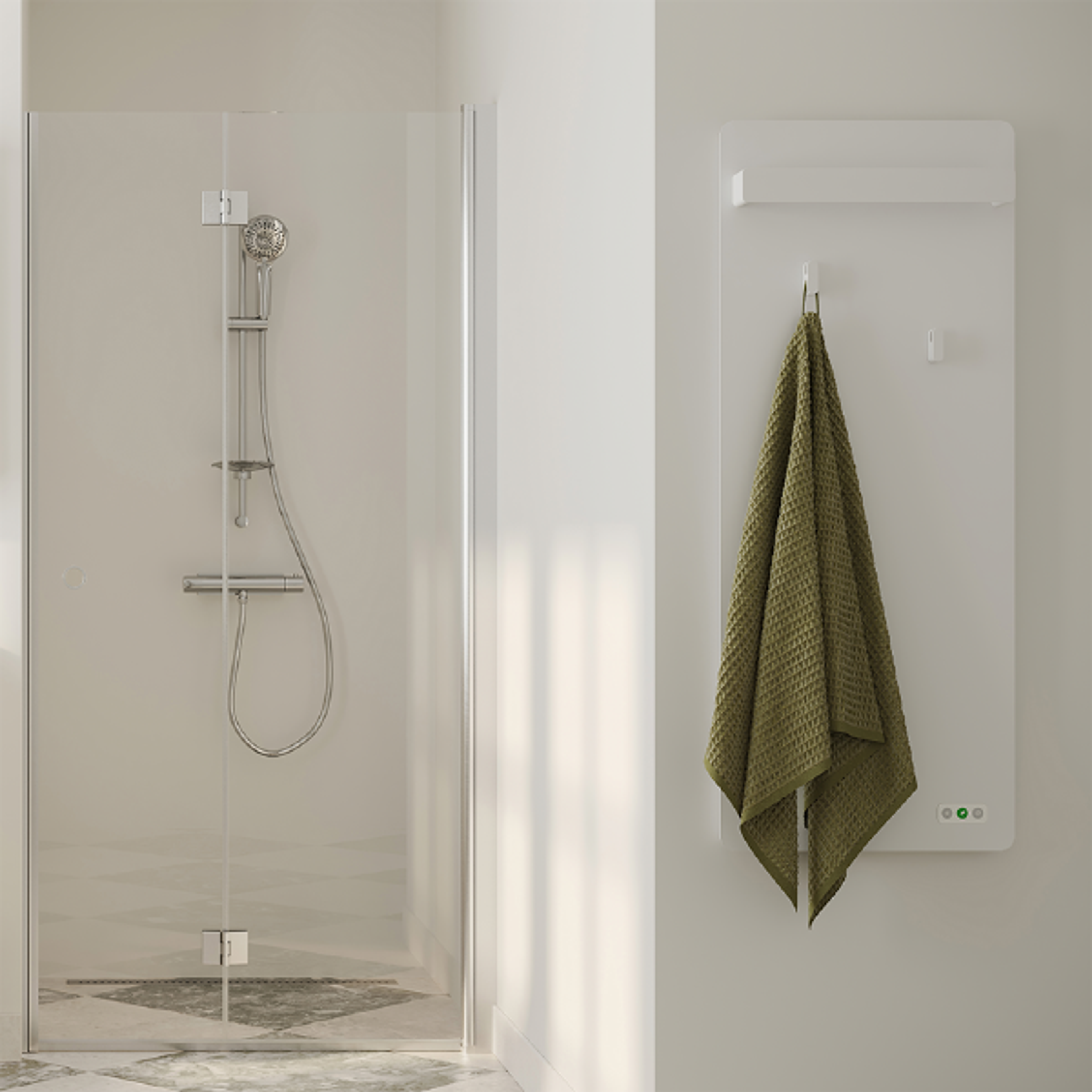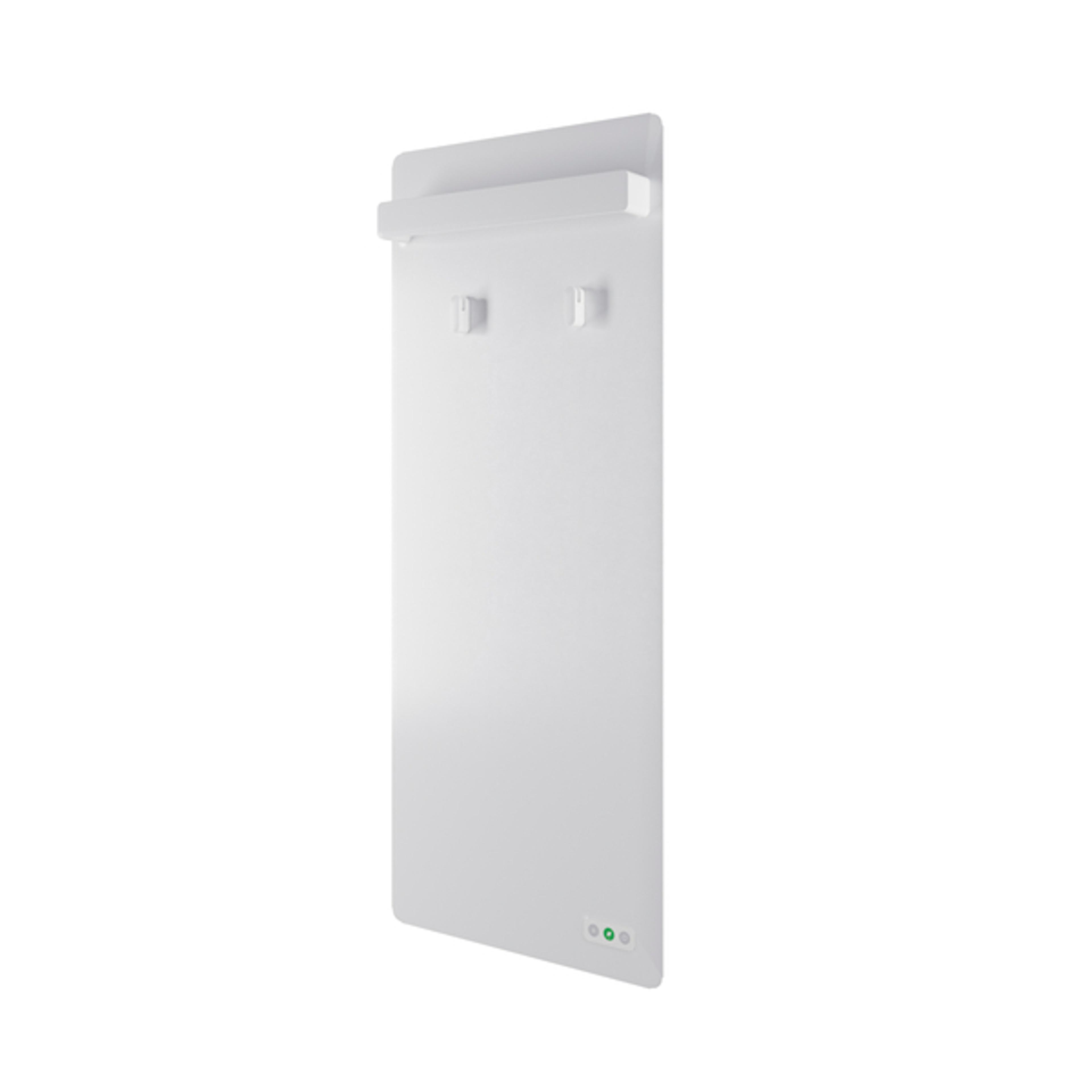 Innovativ håndkletørker med varmeoverføring og tørking via pulverlakkert stål. Skjult tilkobling for et rent, minimalistisk utseende og enkel styring i tre posisjoner med Eco-modus. Oppheng for badelaken og to kroker følger med. Design: Swift Creatives.