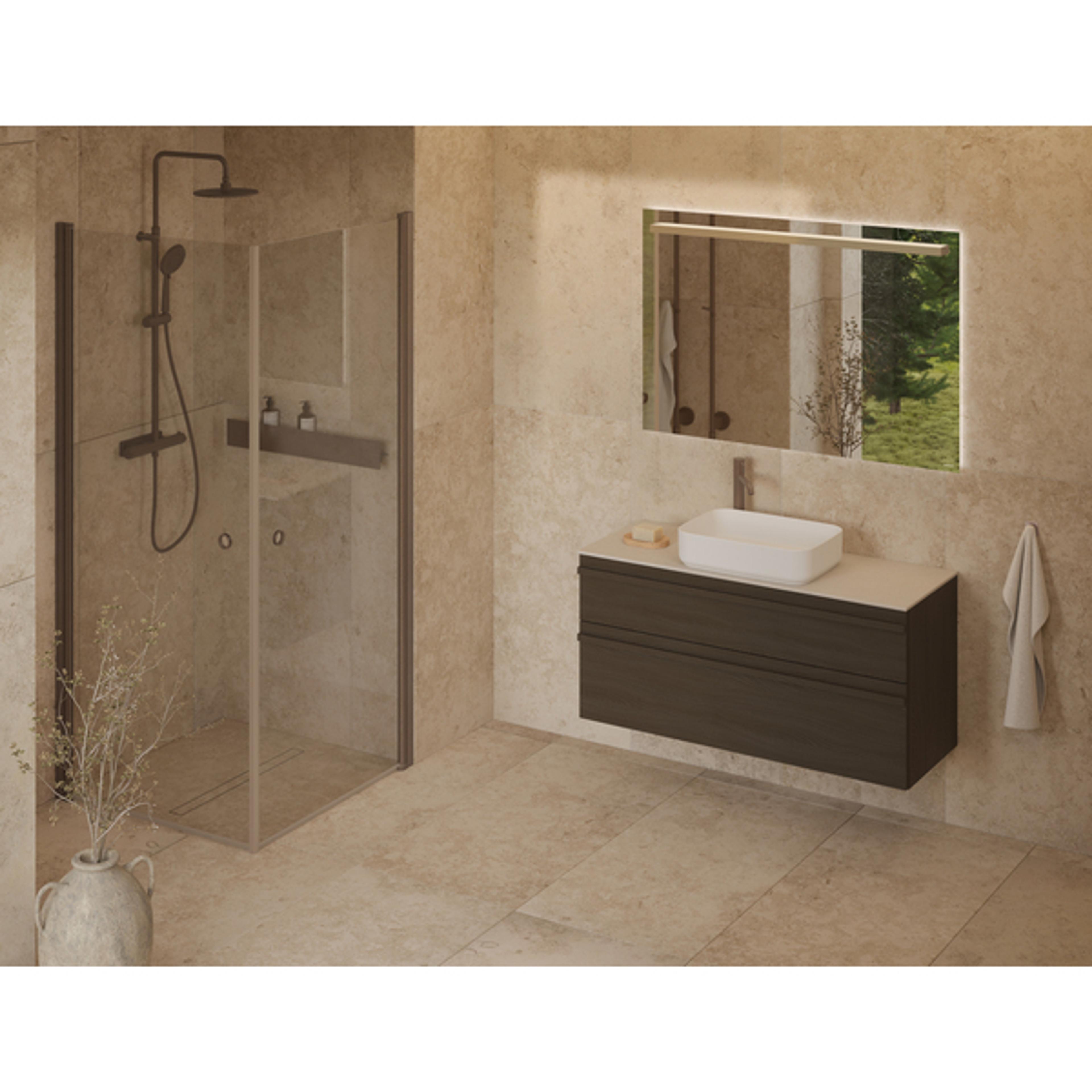 Poems mange frontuttrykk, material- og fargevalg legger til rette for et unikt design fra det enkle til det luksuriøse. Gjøre det mulig for kunder med det lille badet å oppnå et virkelig flott designuttrykk. Formgivningen skaper et strengt, nesten grafisk preg. De smarte hengslene gjør det enklere å åpne og lukke dørene, og slepelisten holder tett mot gulvet, slik at du unngår sprut. Når dusjen ikke brukes, kan dørene felles innover for å spare plass. De praktiske profilene tillater rørtrekking. Hullgrepet står i stil med dusjprofilene. Skoga oppbevaring passer sammen med alle Skoga profildusjer og gir deg ekstra vertikal oppbevaring inne i dusjen.