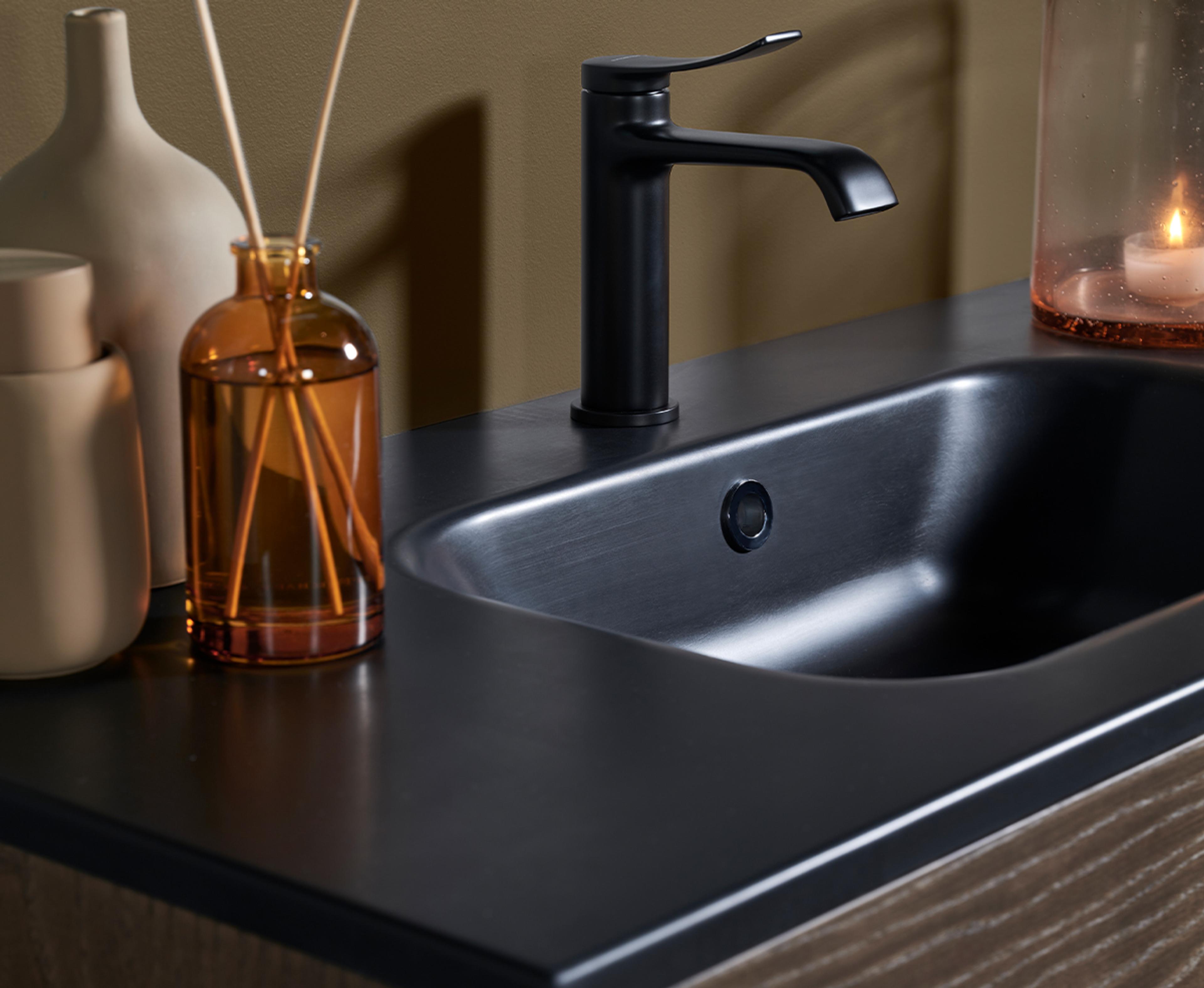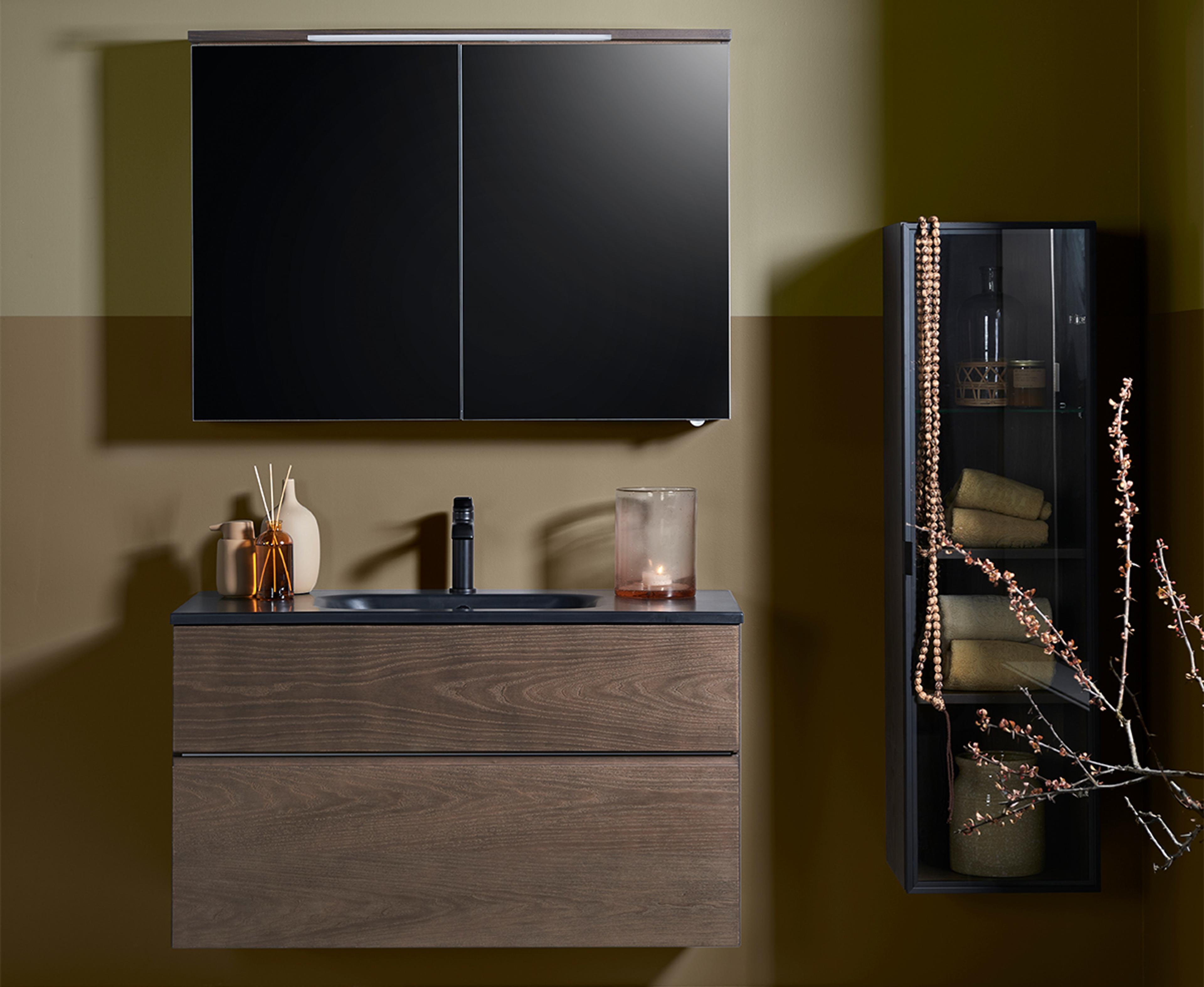 Baderomsmøbel i Brun Ask som inkluderer servantskap (100x58x45 cm) med to skuffer og integrerte håndtak i designuttrykket profil. Integrert Sel sort matt servant (101x15x46 cm) i mineralkompositt og Skuru speilskap (101x72,5x19 cm) med energieffektivt myk dimbar belysning. Pris uten servantkran og sideskap.