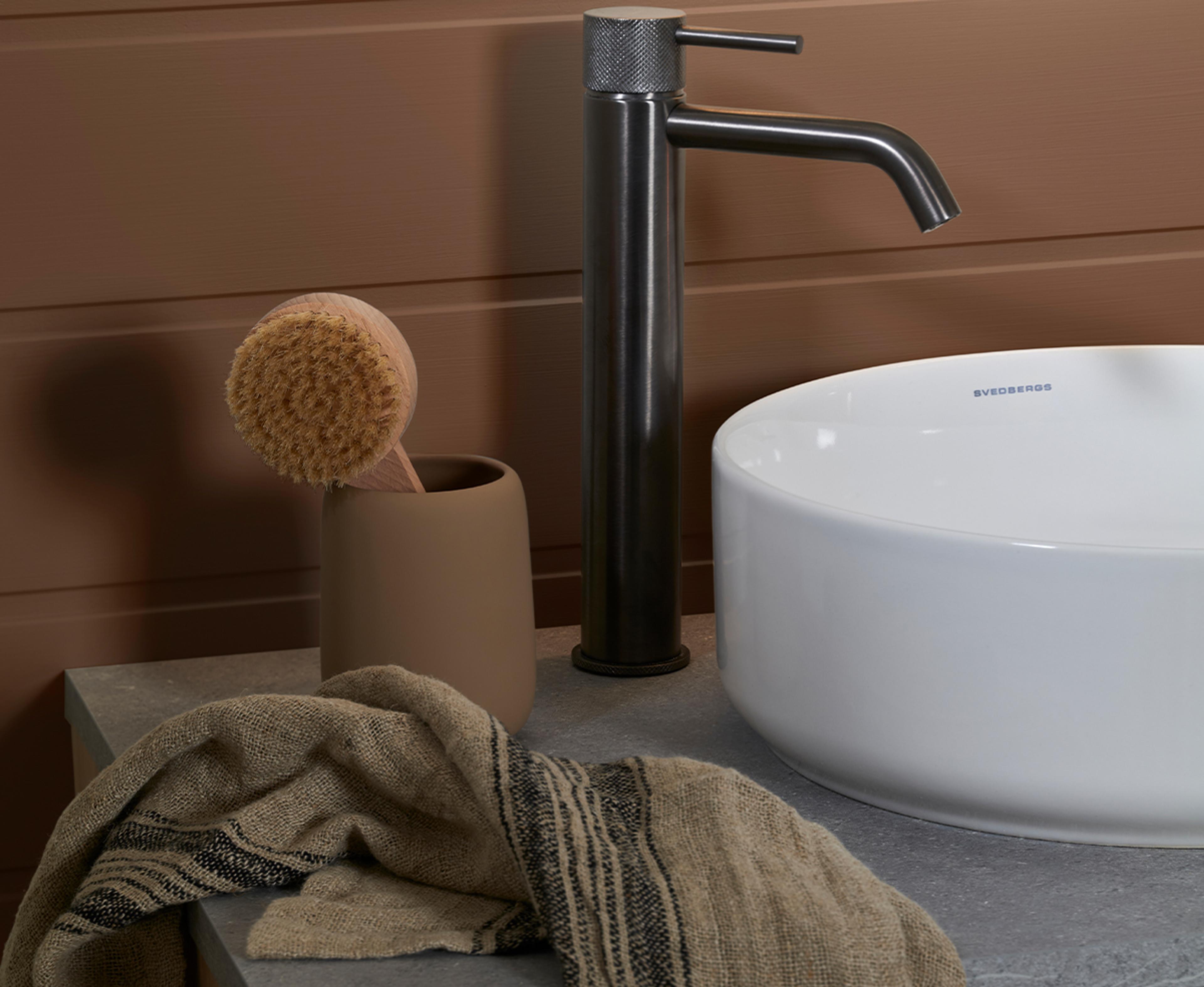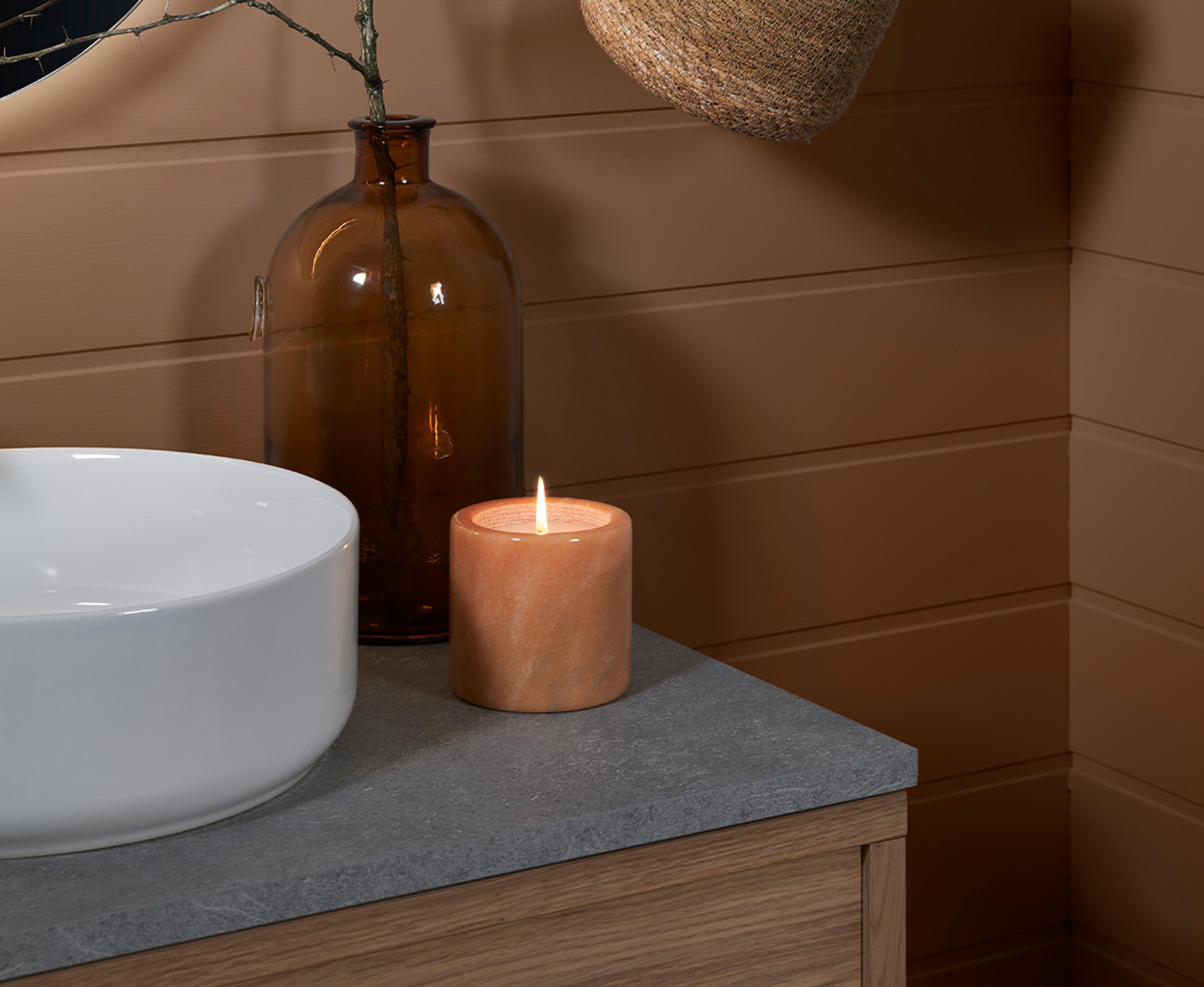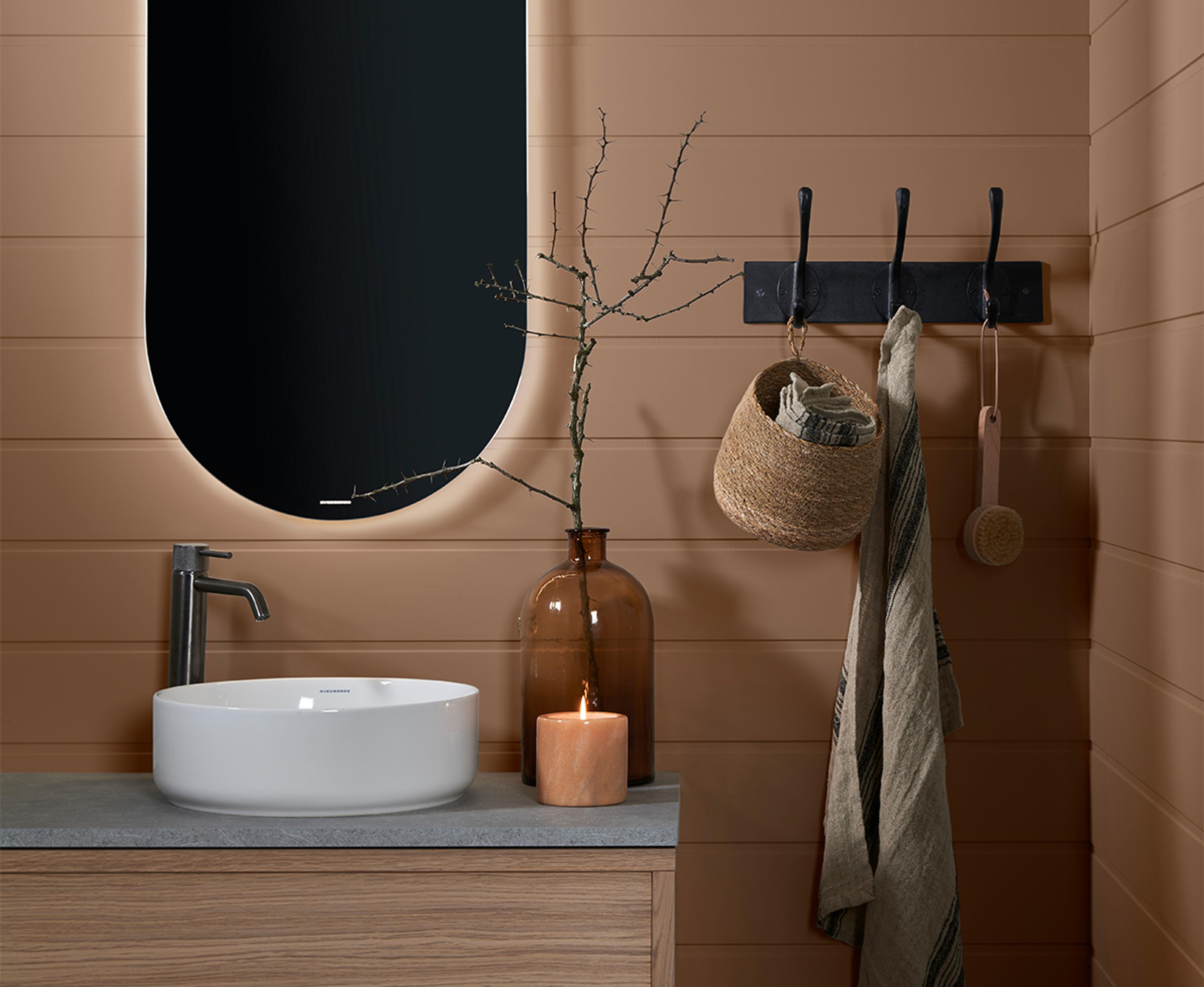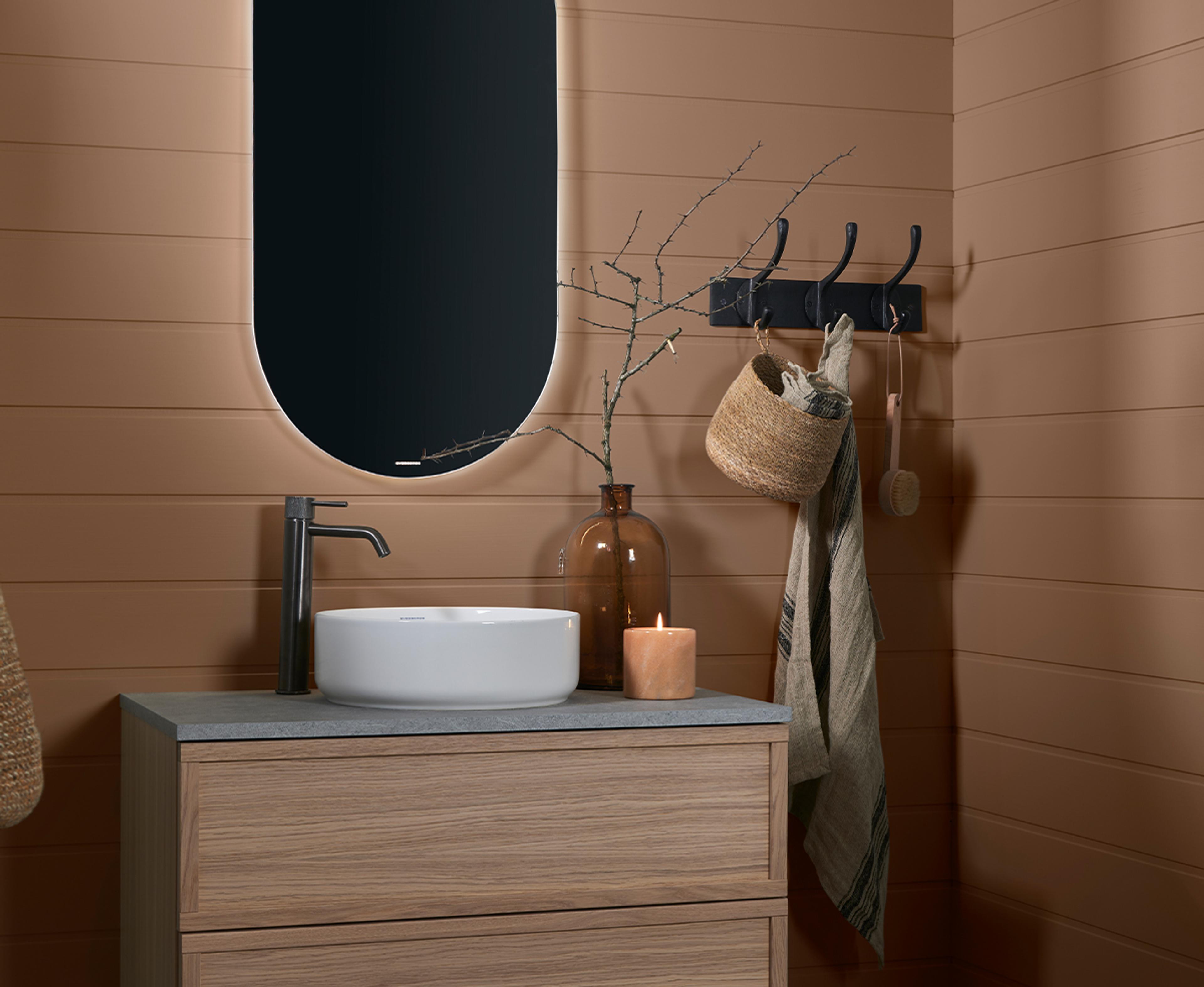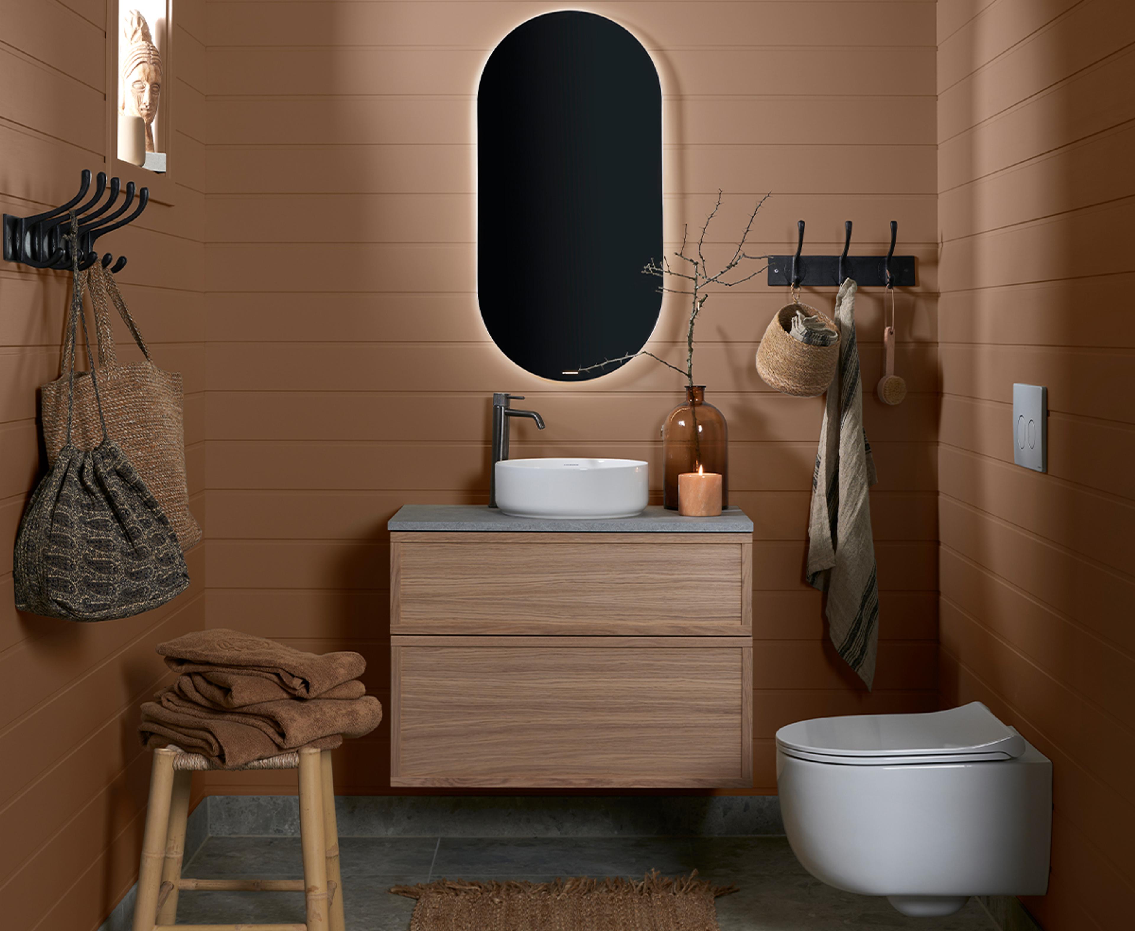 Baderomsmøbel i pure eik som inkluderer servantskap (60x45 cm) med to skuffer og integrerte håndtak i designuttrykket ramme. Ovenpåliggende Myre Rand porselensservant (36x12x36 cm) i hvit og Valje Oval speil (45x90x2,5 cm) med energieffektivt myk belysning. I møbelserien Poem er det den store variasjonen som er helten! Pris uten servantkran.