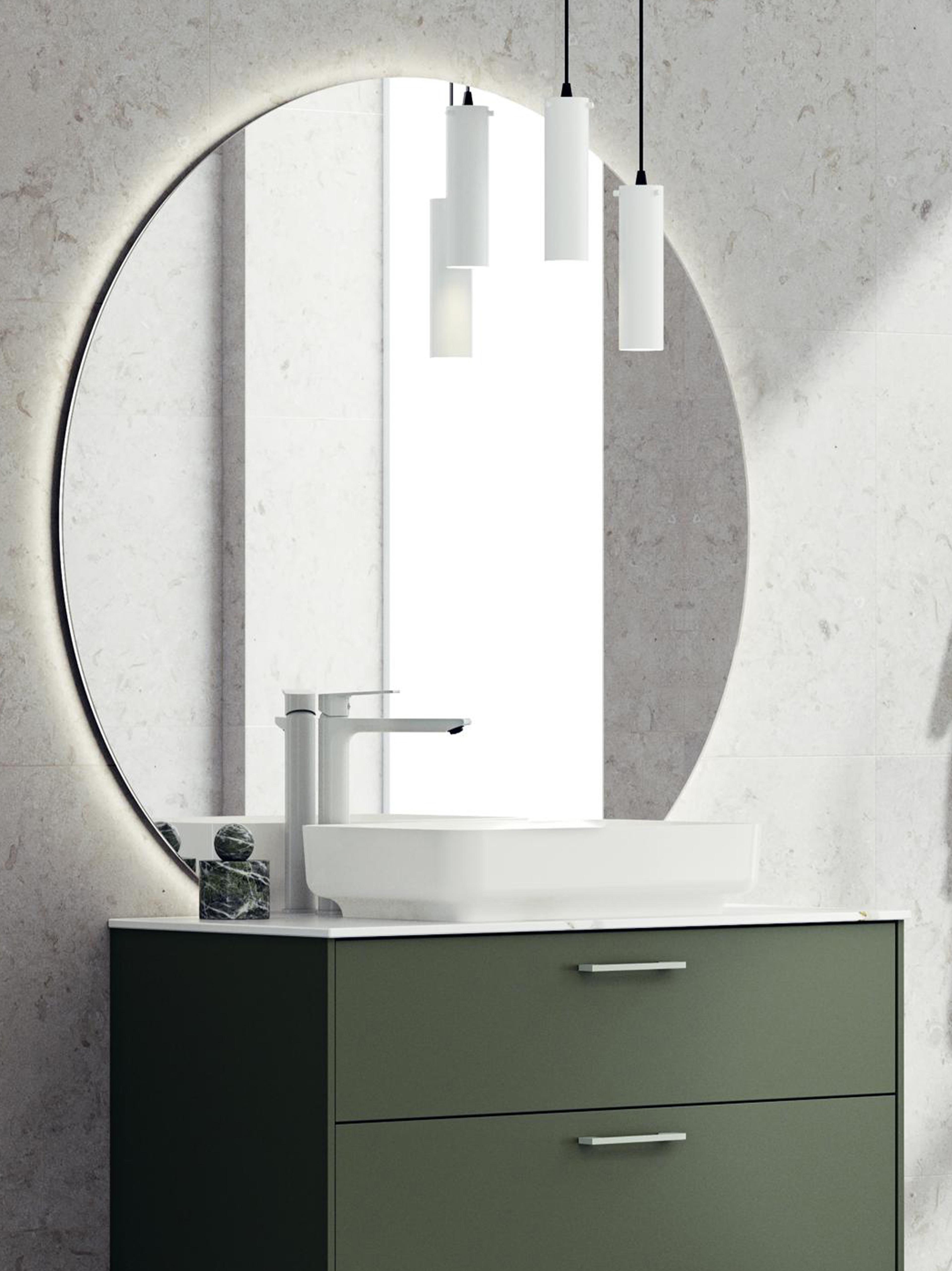 Baderomsmøbel i ren eik som inkluderer servantskapet (80x57x45 cm) med ramme front, to skuffer og push-open. Glimmer benkeplate (80x45 cm) i laminatmateriale, for frittstående servantbatteri og Valje avrundet speil (120x112 cm) med LED-belysning. Pris uten servantkran og høyskap.