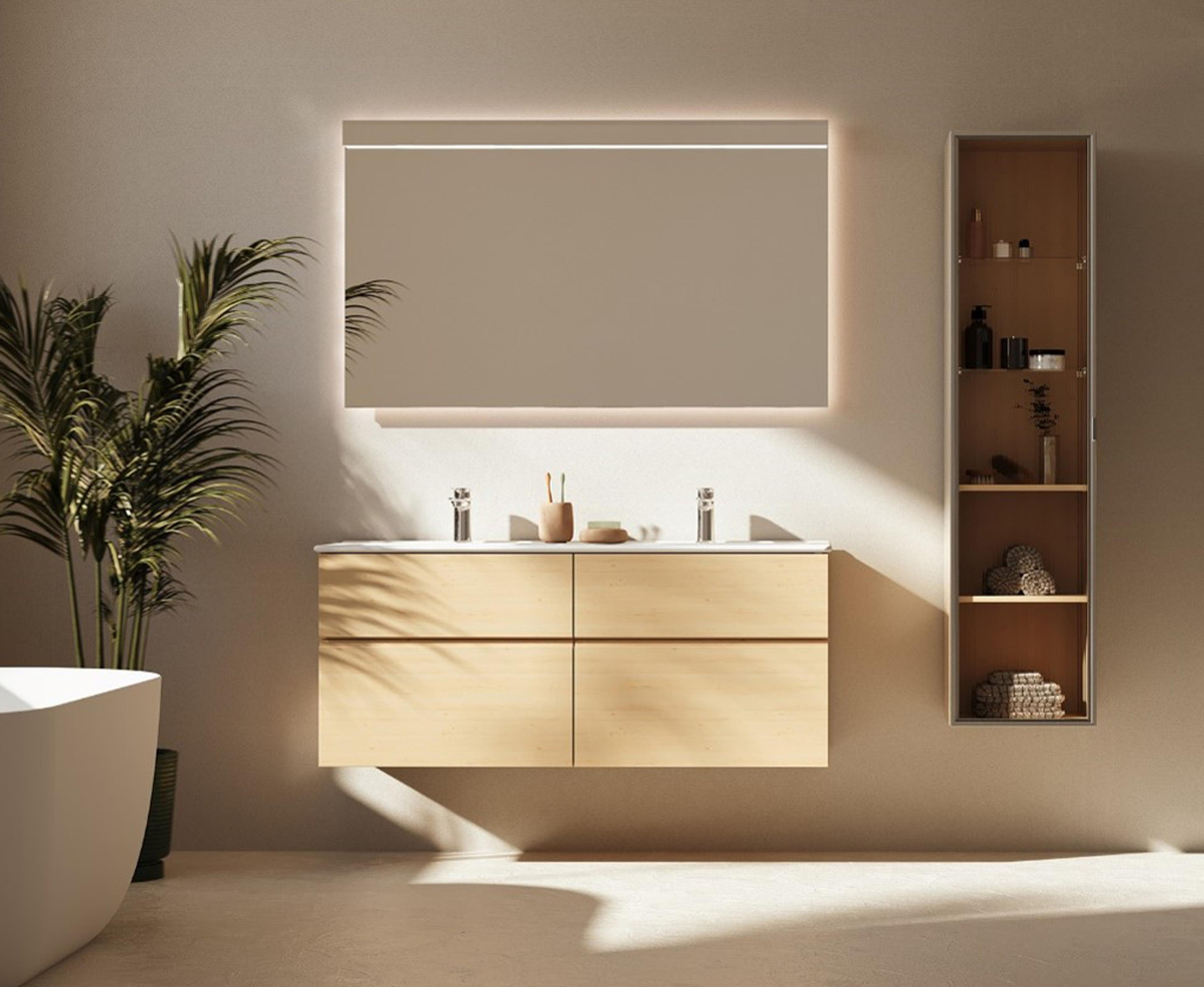 Baderomsmøbel i ren eik som inkluderer servantskapet (120x57x45 cm) med profil front, fire skuffer og integrert håndtak. Hav dobbel servant (120x45 cm) i hvit og Valje speil (120x80 cm) med LED-belysning. Pris uten servantkran og høyskap.