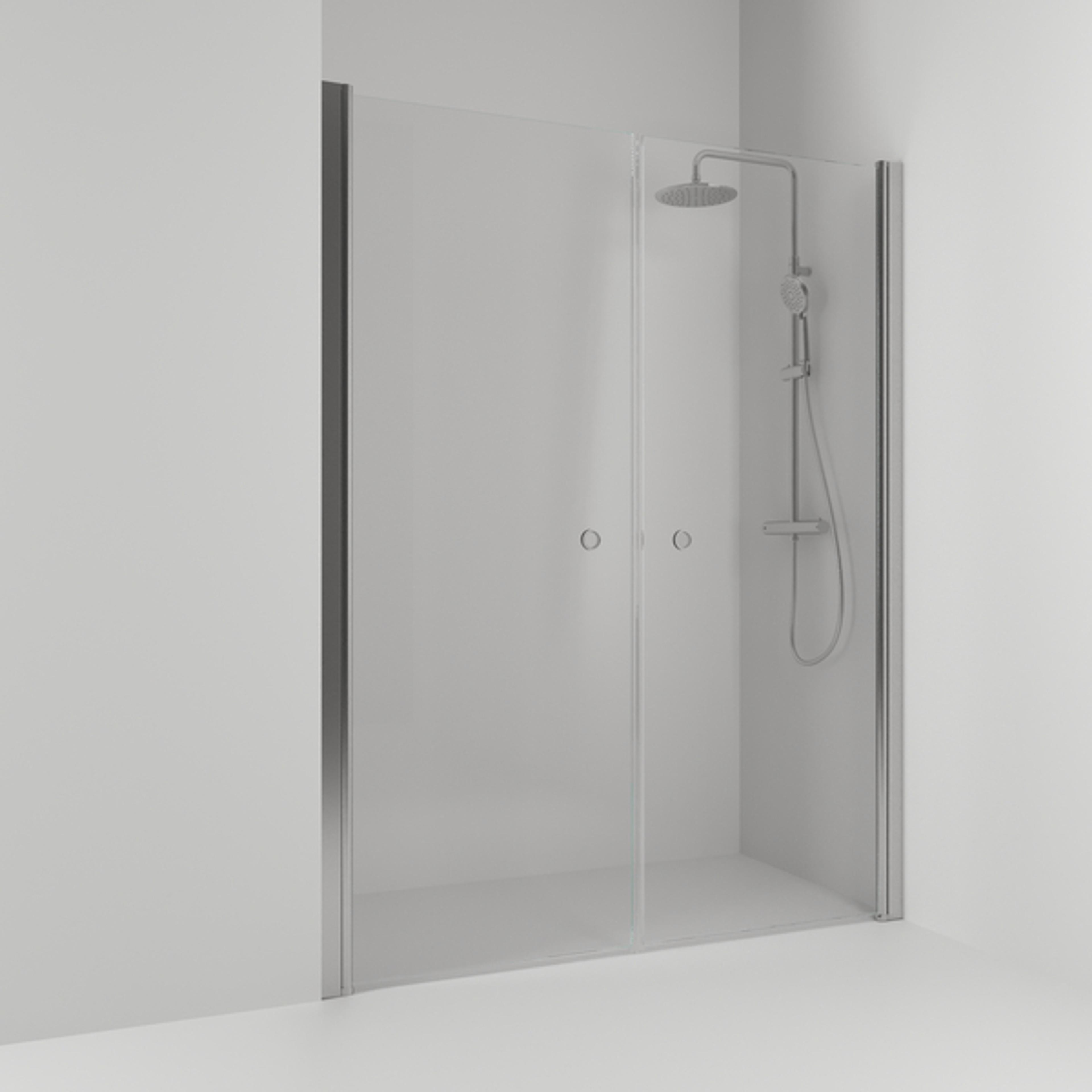 Skoga dobbel nisje med to rette dører. Høyde: 198 cm. Terskelfri inngang. Herdet sikkerthetsglass 6 mm. Inkludert hullgrep. (Håndtak fås som tilbehør). Produsert i Sverige. 20 års Leverandørgaranti