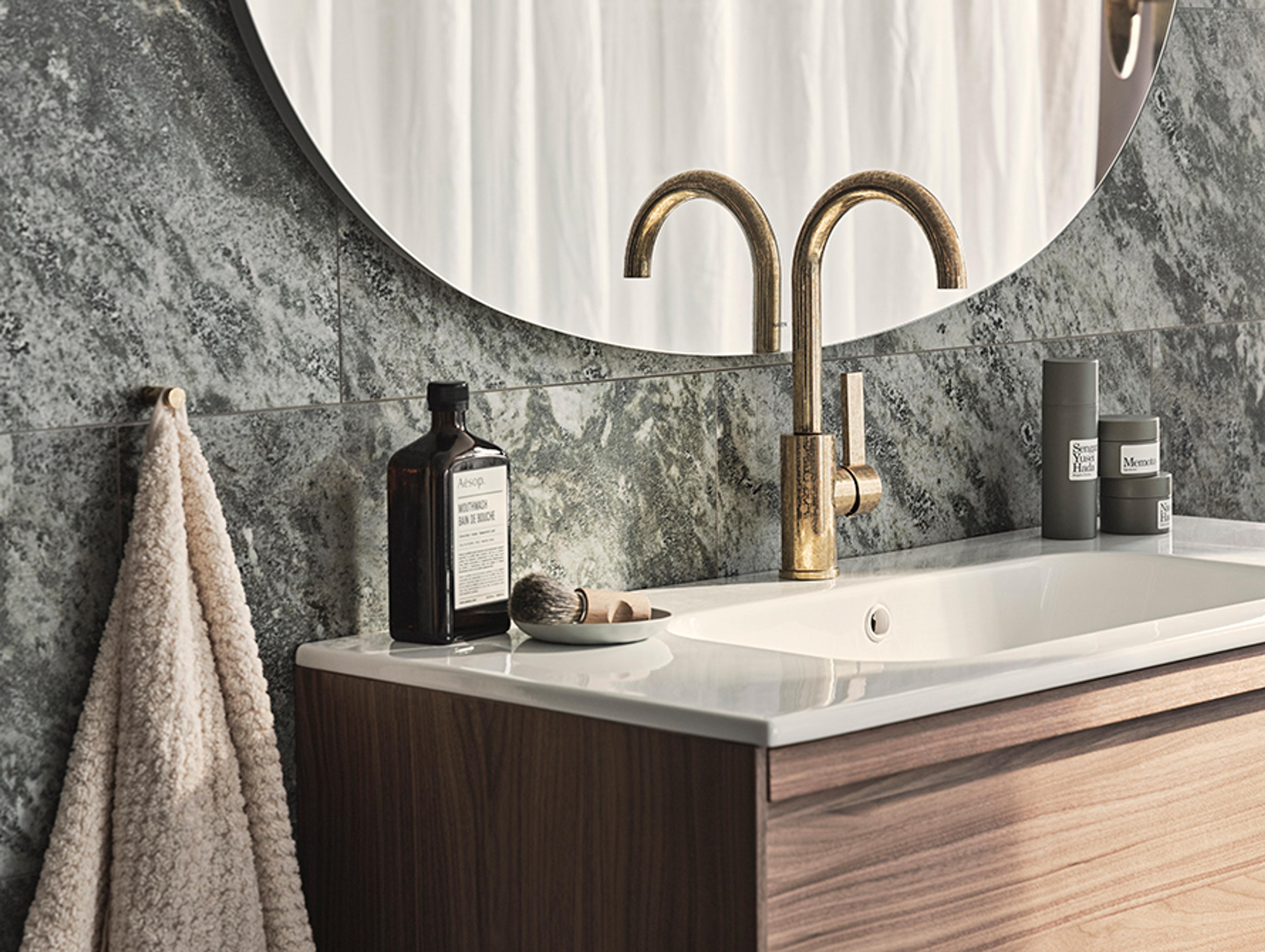 Servantkran med høy svingbar tut med ett-greps betjening, uten oppløftsventil. En brukervennlig servantkran med et tidløst og stilrent design. Utstyrt med keramisk innmat og fleksible tilkoblingsrør. Farge: Oksiderende Messing