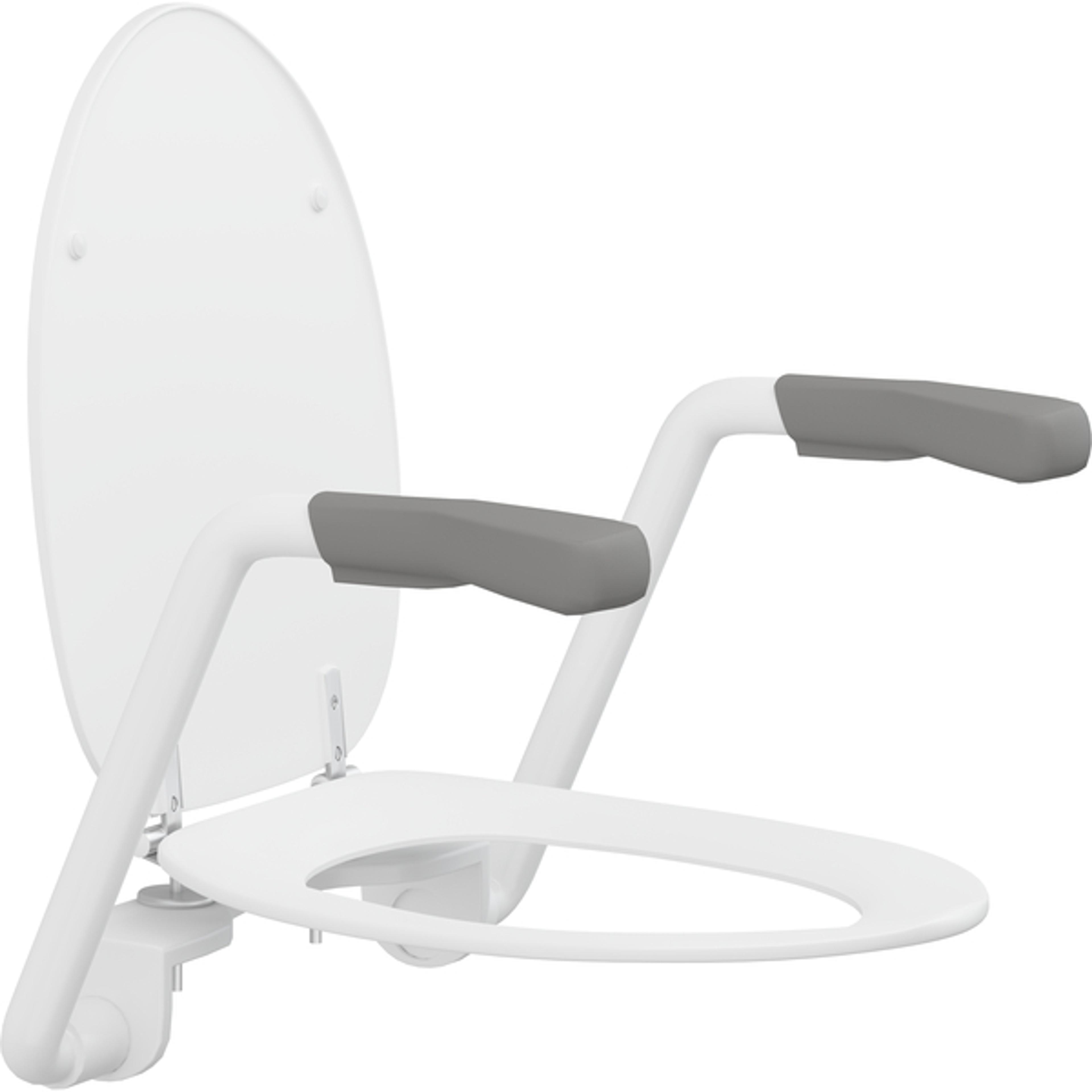 Stabil armstøtte med ergonomisk designede grep, armstøttene kan klappes opp uavhengig av hverandre Denne typen armstøtte er ideel for brukere som har behov for en midlertidig løsning. Leveres med Dania toalettsete.