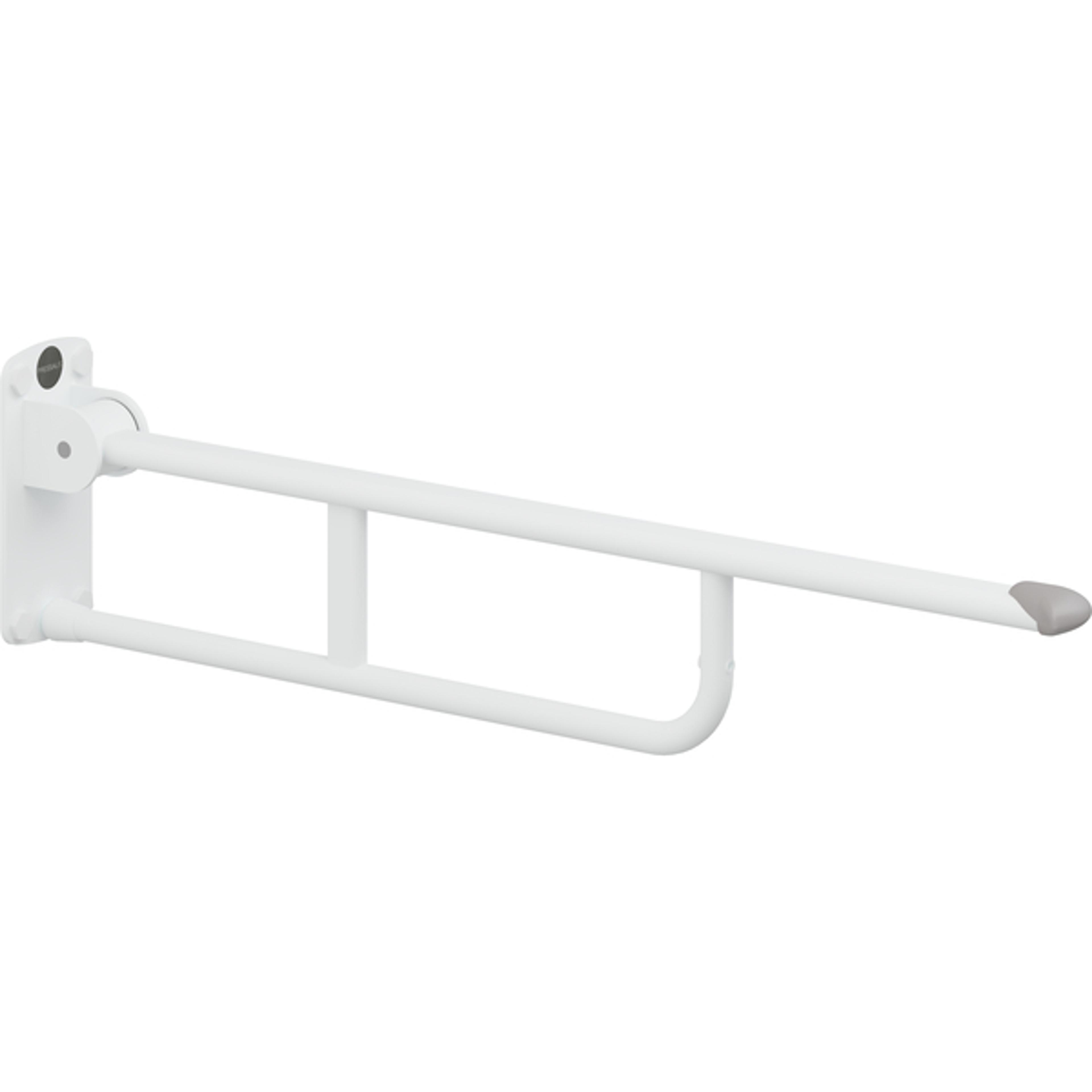 Støtten er laget i rustfritt stål og har slitesterk, Rilsan-belagt overflate som gir et fast og behagelig grep. Maksimal belastning på 120 kg. Når den ikke er i bruk, kan armstøtten enkelt felles opp langs veggen for å spare plass. Produktet er ideelt som toaletthjelpemiddel i hjemmet, på institusjoner eller på offentlige toaletter, og bidrar til universell utforming og økt sikkerhet på baderommet.