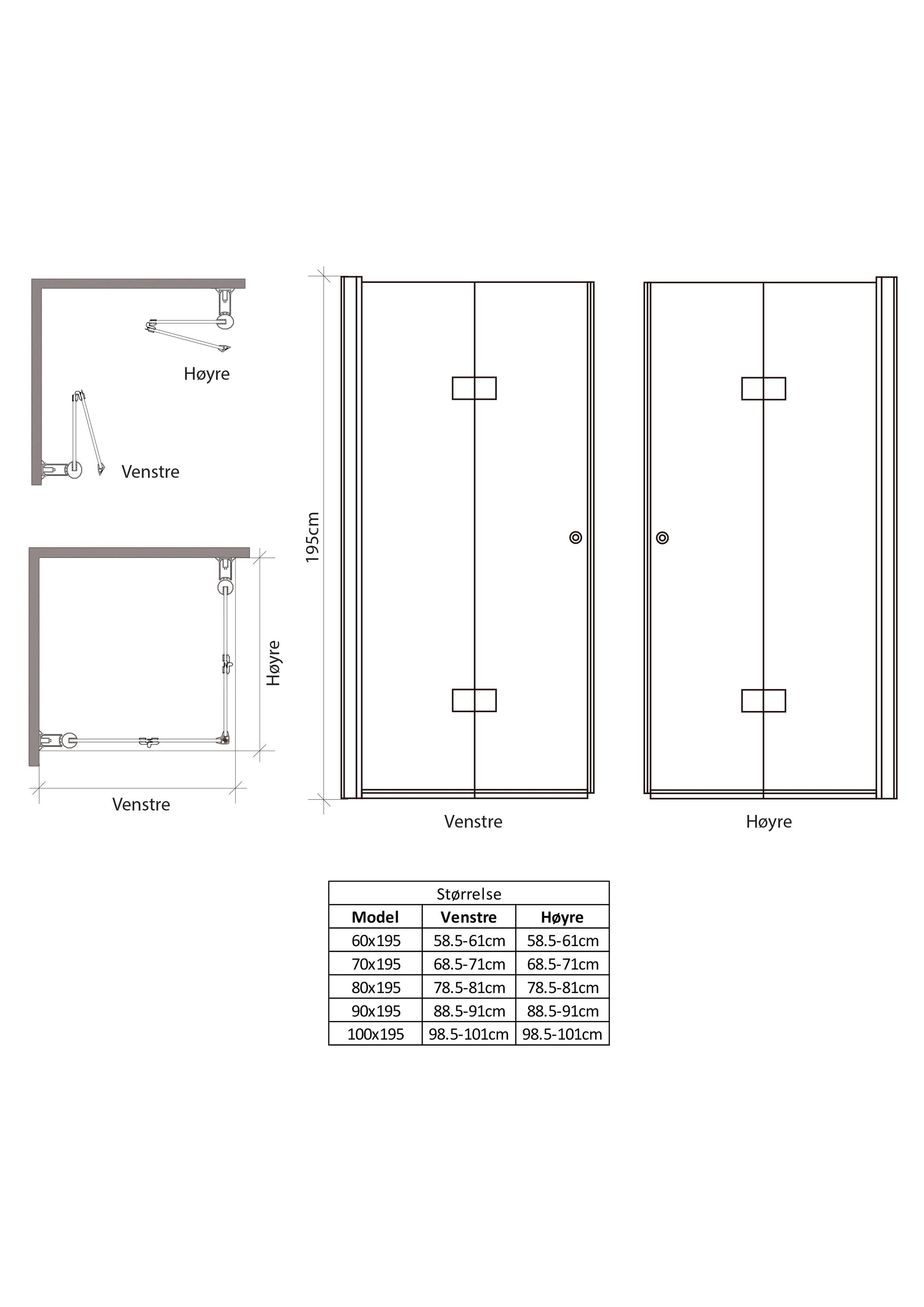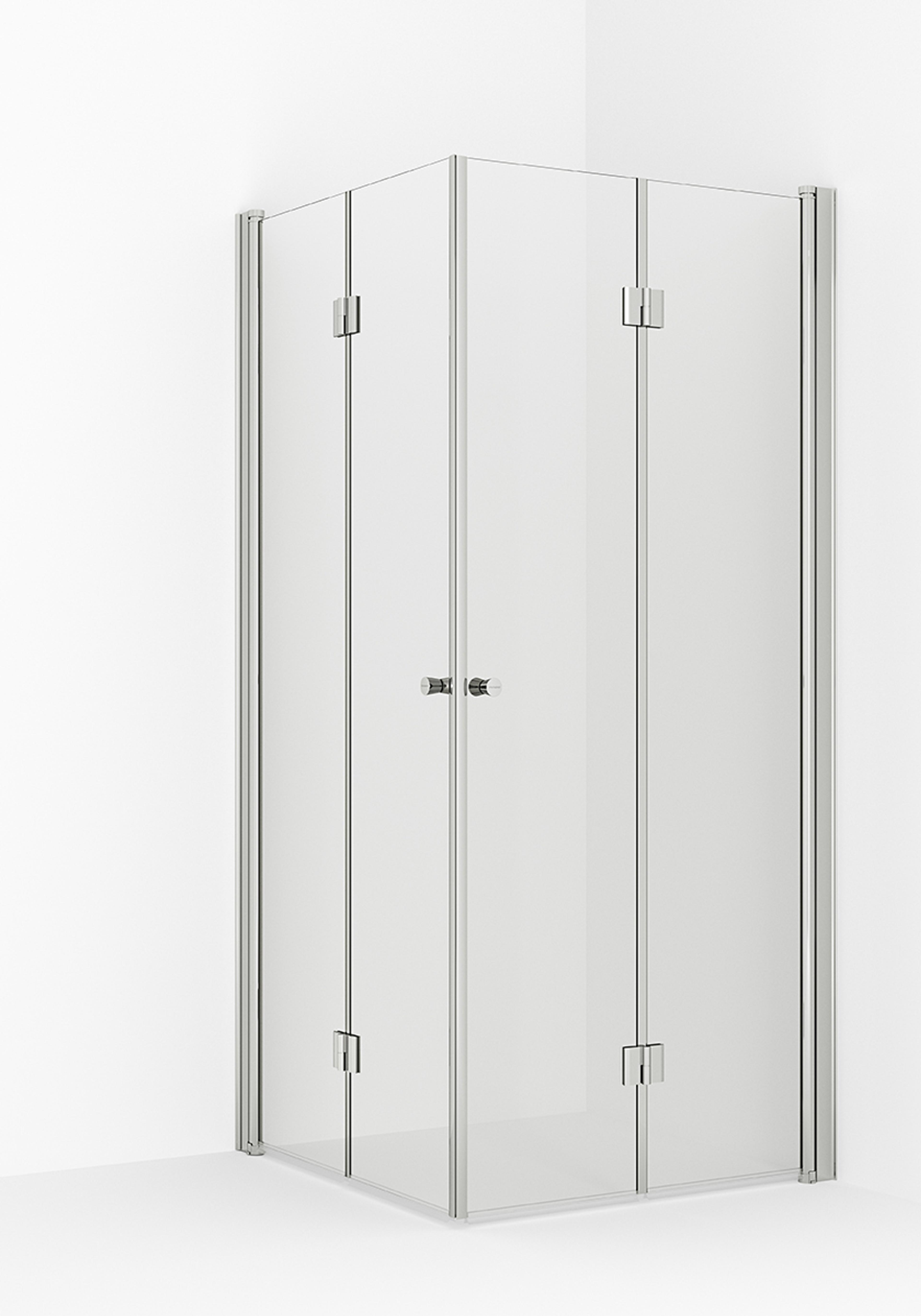 Leddet dusjdører i 6 mm herdet sikkerhetsglass. Kan svinges 180º og dørene kan foldes sammen når de ikke er i bruk. (Venstrevendt dør). Pris pr dør. Mål: 90x195cm