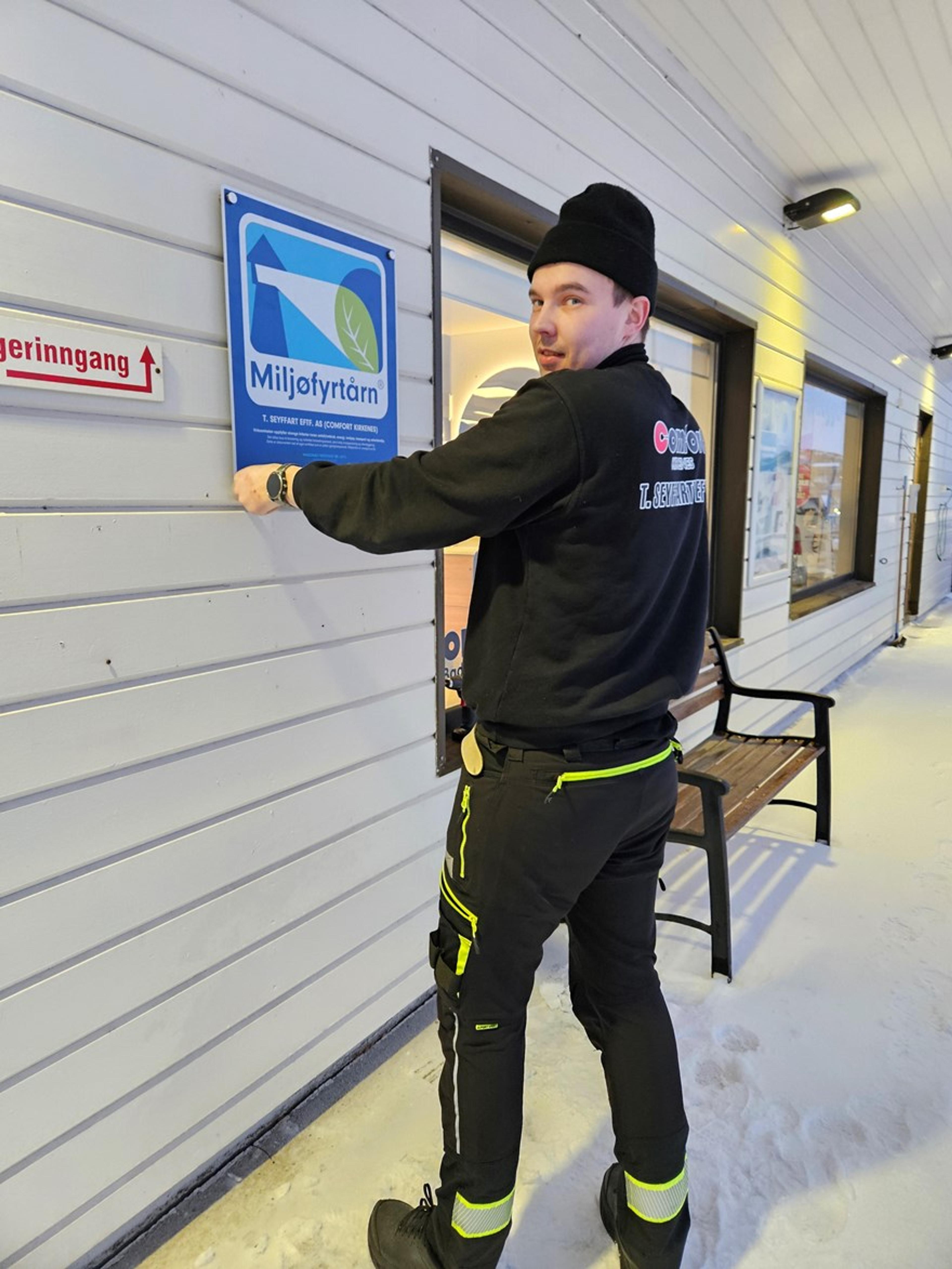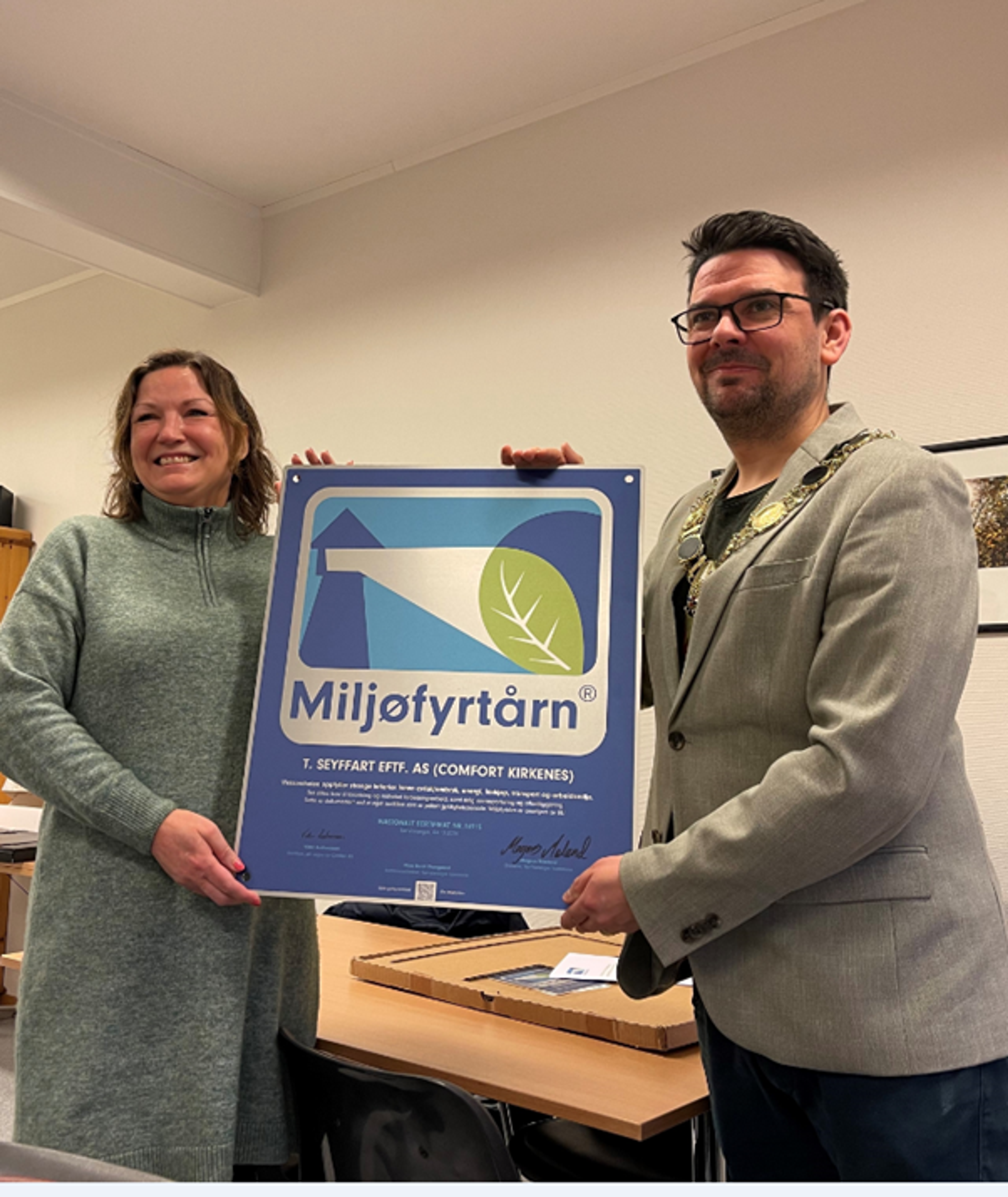 Vi ble sertifisert som Miljøfyrtårn-bedrift i oktober 2024. I januar 2025 fikk vi derfor hyggelig besøk av ordføreren i Sør-Varanger Kommune, Magnus Mæland, hvor vi fikk tildelt det offisielle Miljøfyrtårn beviset.
