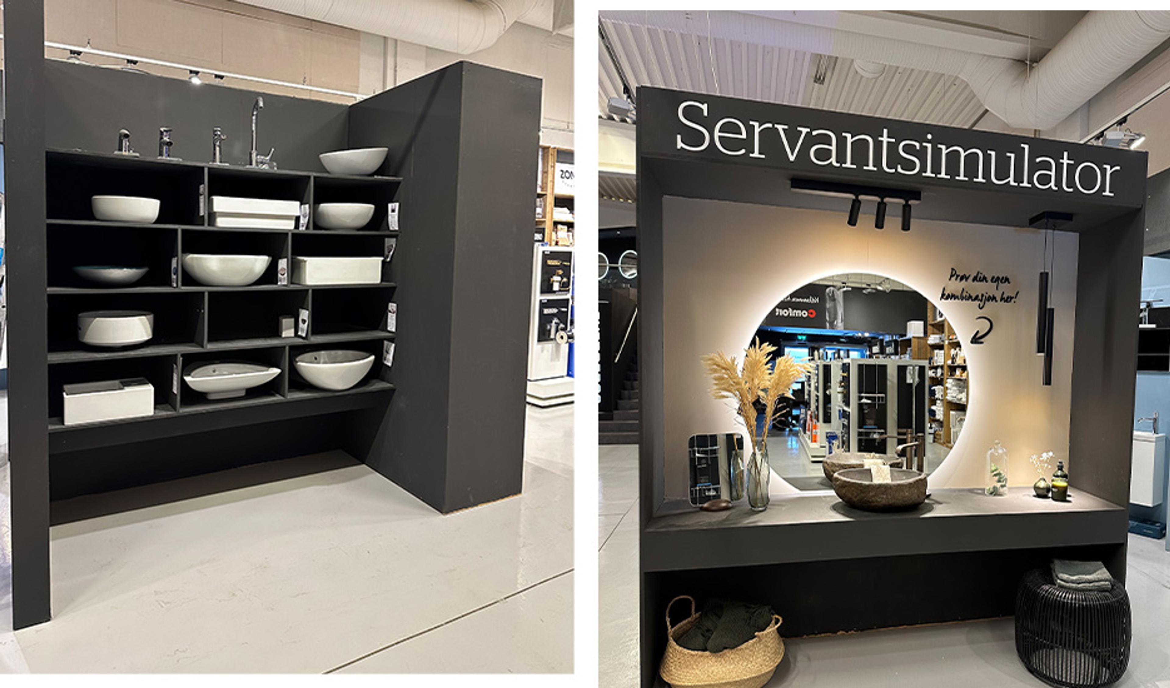 Ikke hørt om servantsimulator? Tenkte oss det, men det finner du også hos Comfort Badhuset. Selv om det høres avansert ut, er det egentlig ganske enkelt. Dette faktisk bare en utstilling med en benkeplate, et speil og litt belysning. Resten fikser du selv ved å hente inn servanter, kraner/armaturer, interiørartikler, såpedispensere, håndklær og liknede. Her kan du altså mikse og matche for å finne kombinasjonene som passer for deg.